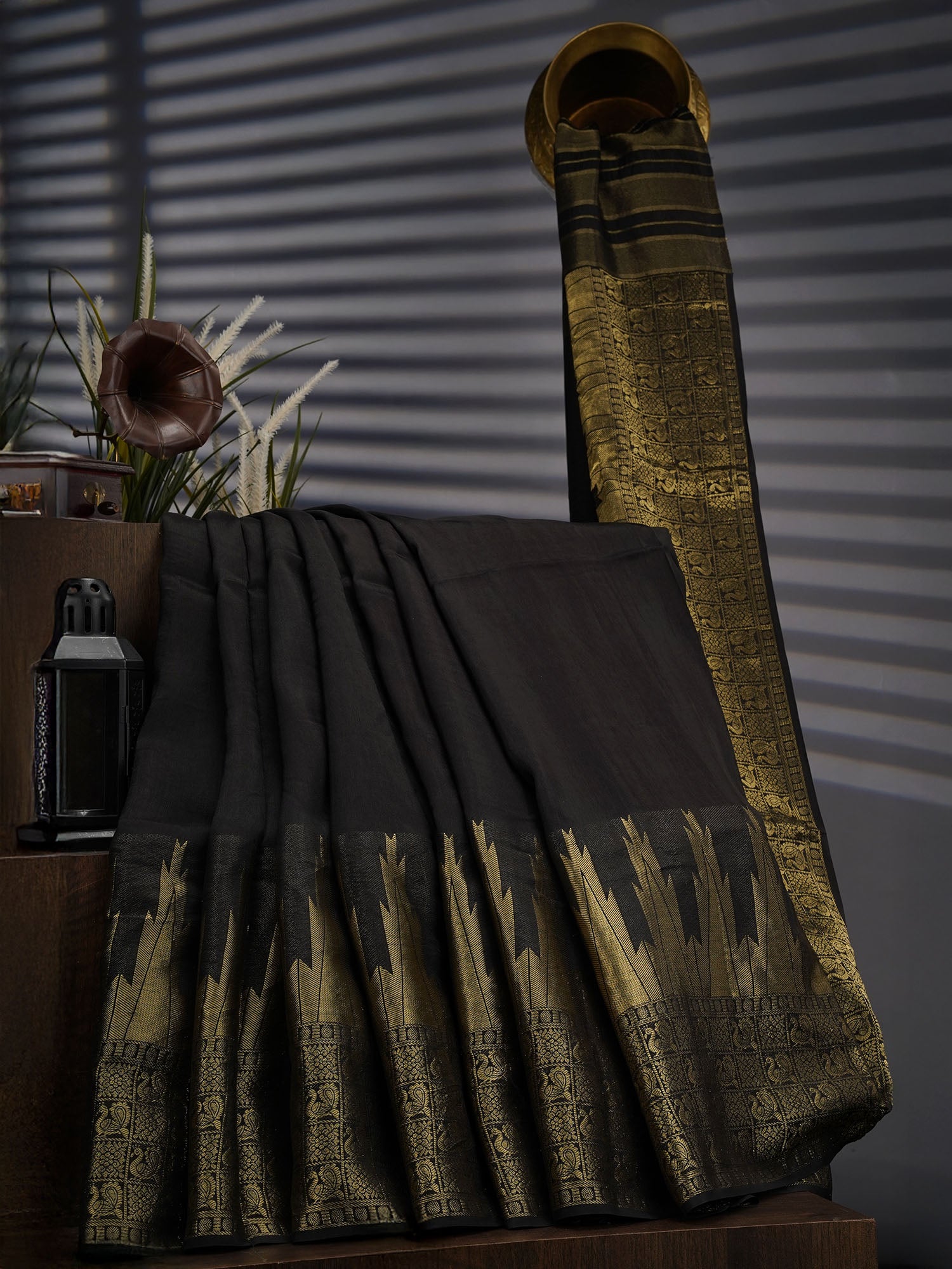 Timeless elegance meets modern flair in this stunning black Banaras crepe saree! Crafted with the finest crepe fabric, this beauty features an eye-catching Kanchi border that adds just the right amount of sparkle and sophistication. Perfect for weddings, festivals, or whenever you want to turn heads, this saree drapes beautifully and feels incredibly comfortable. The classic black backdrop ensures versatility, while the ornate border steals the show. Slip into this masterpiece and let your style do the talking!