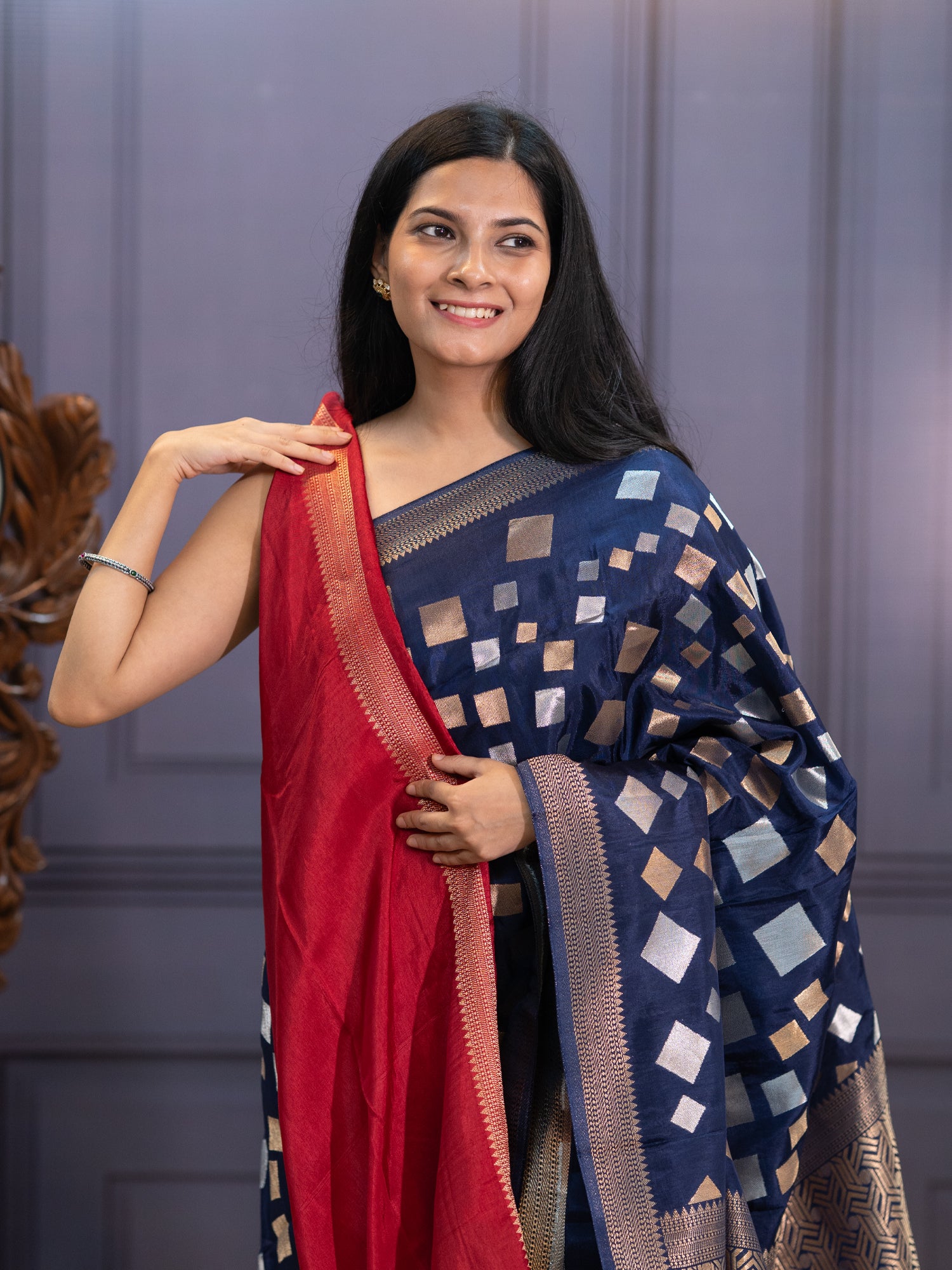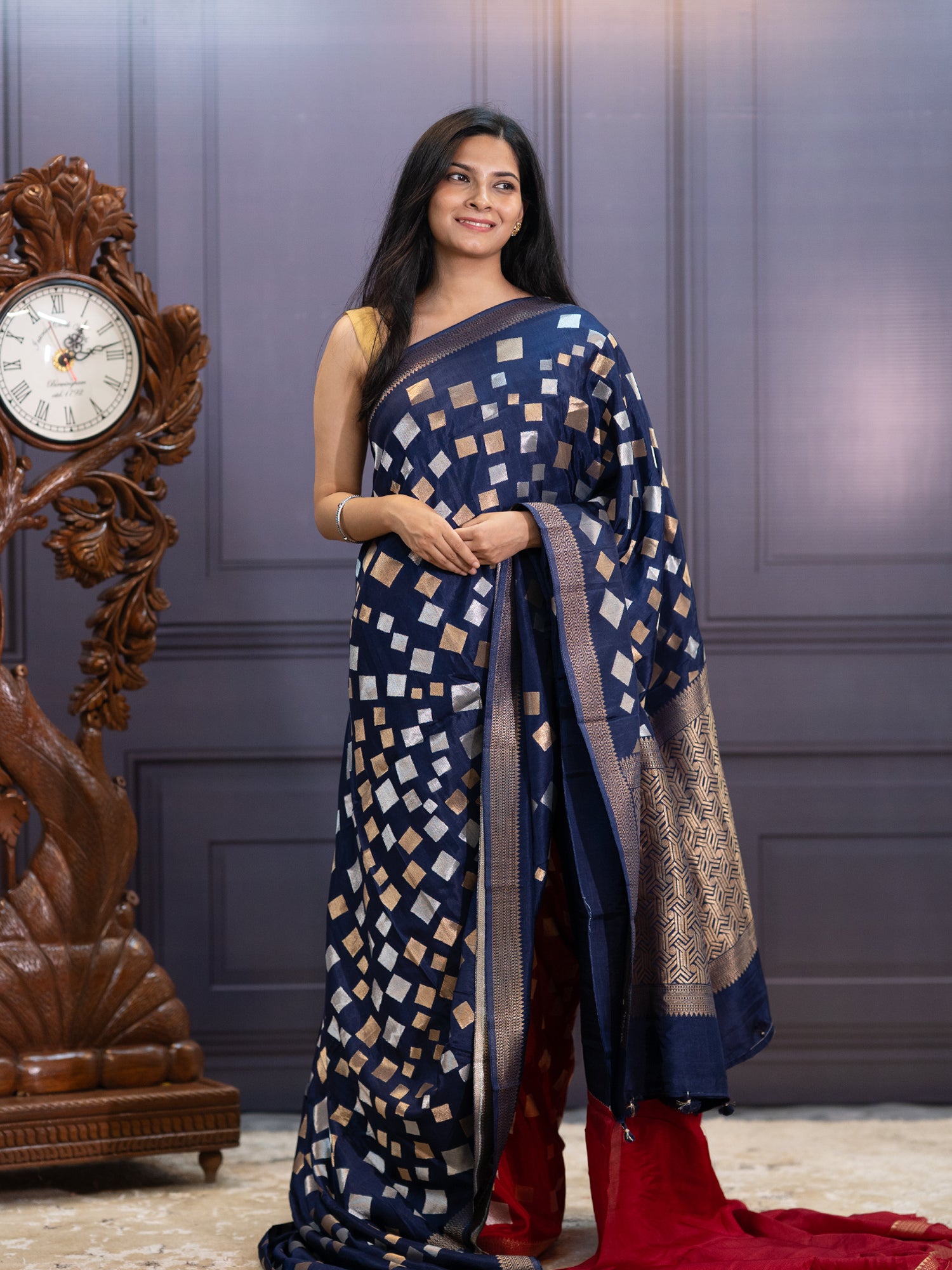 Banaras Silk Saree Gold & Silver Zari Butties and Border - Navy Blue