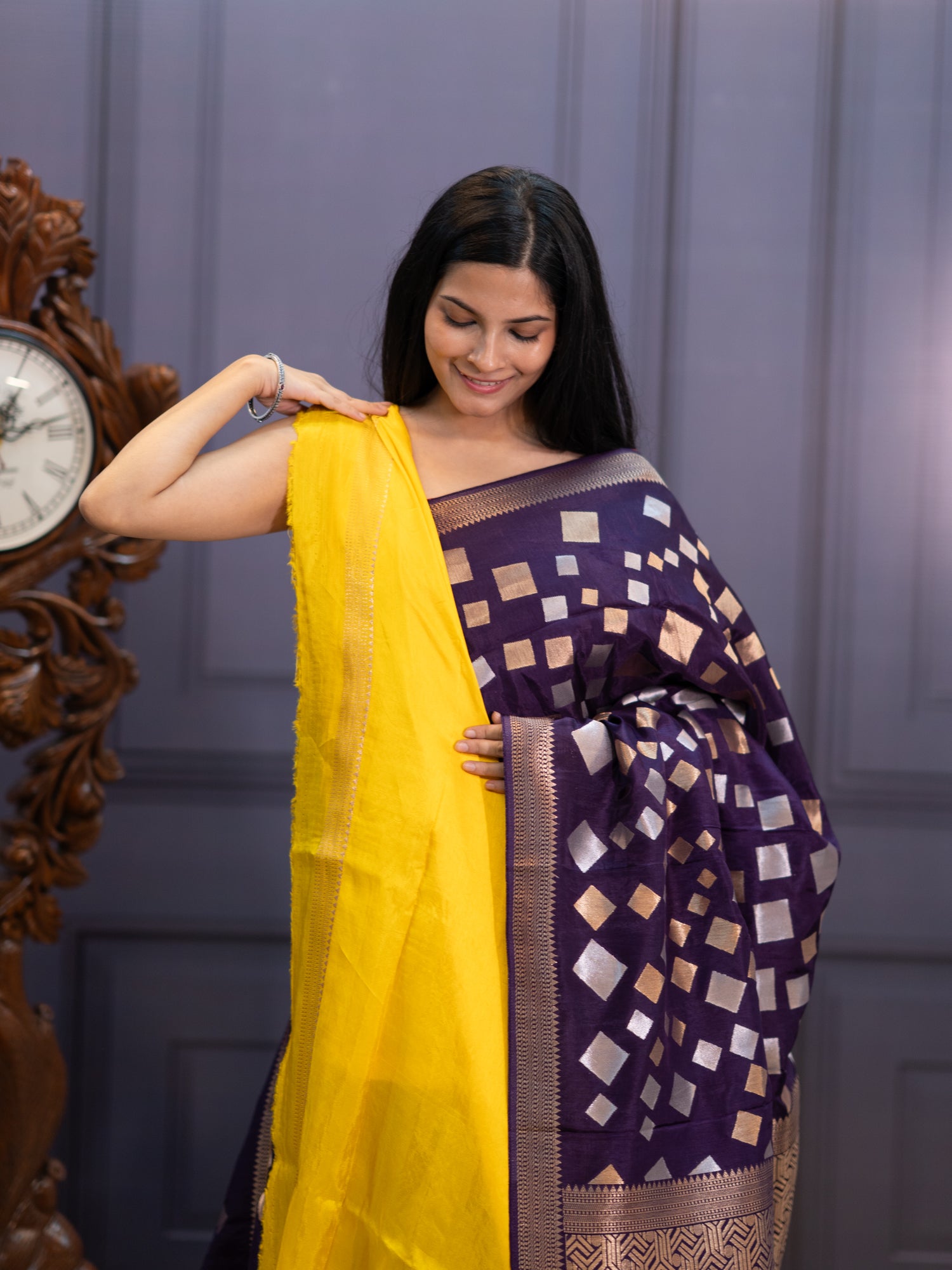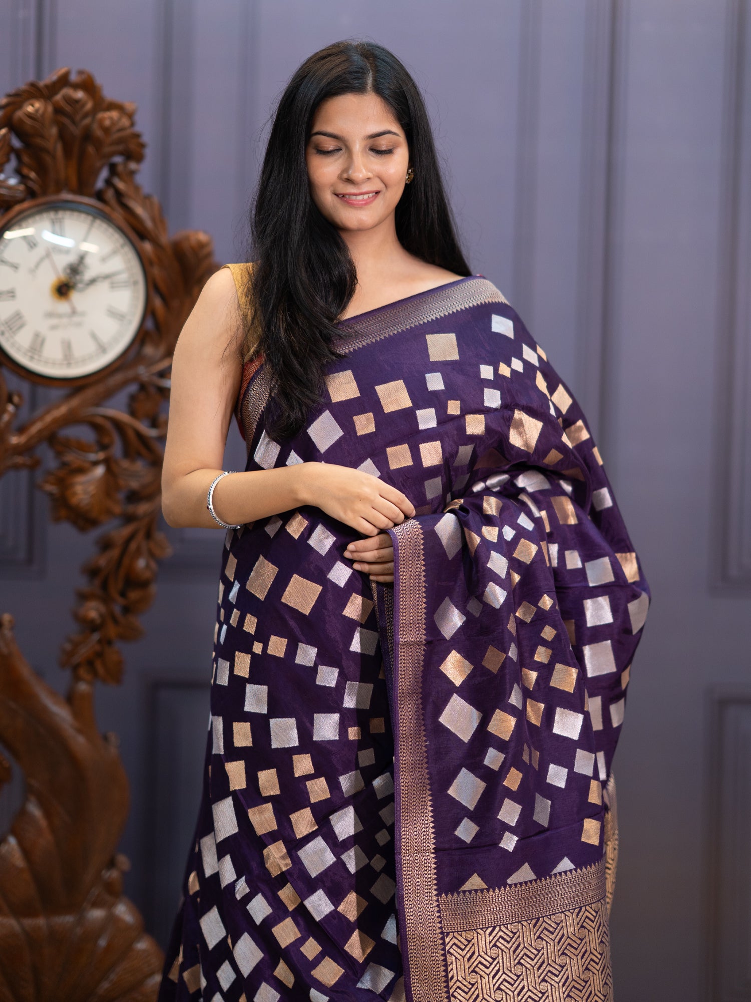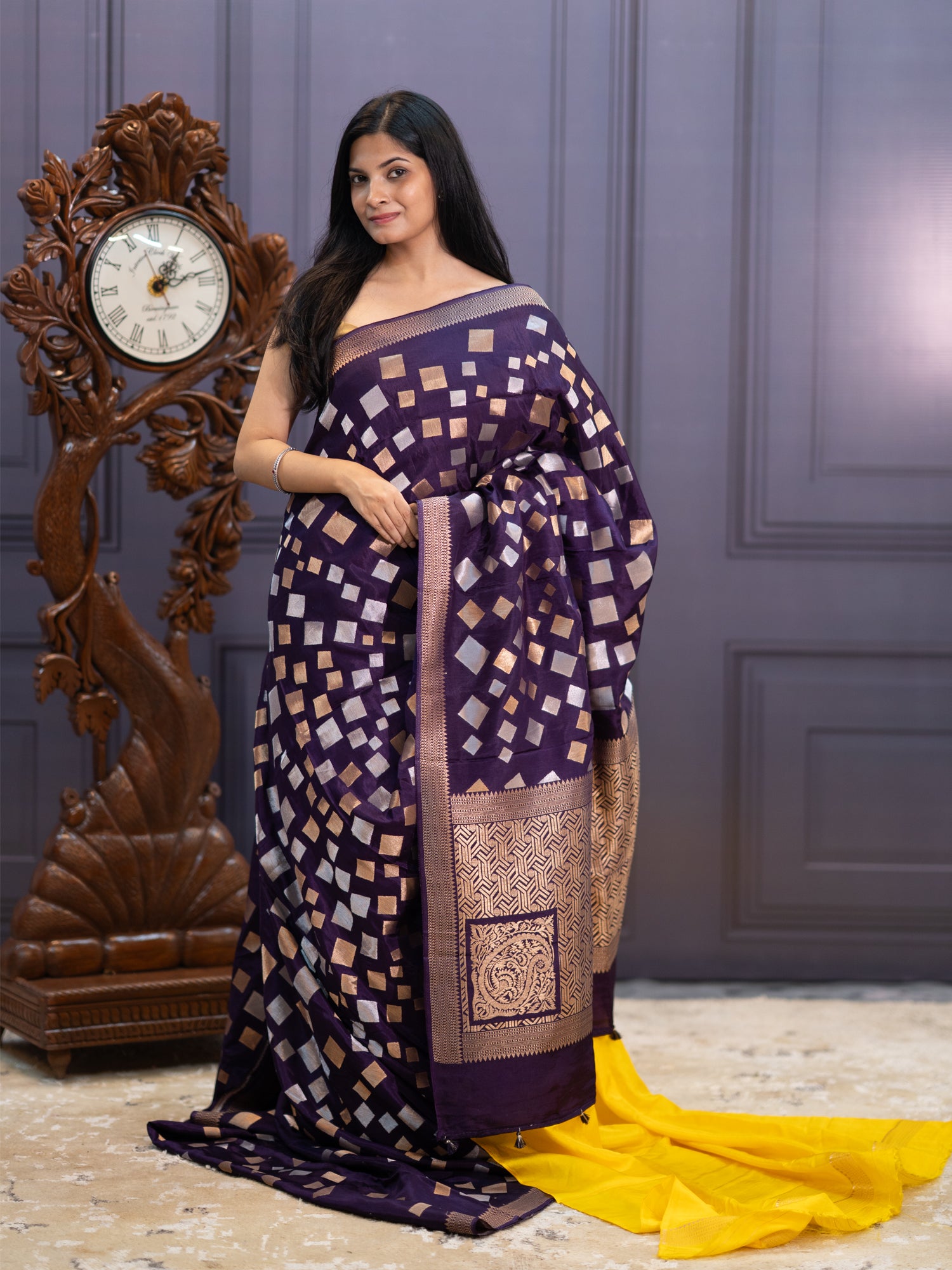 Embrace regal sophistication in this enchanting Banaras silk saree, where deep violet meets shimmering gold and silver zari embellishments. Delicate...
