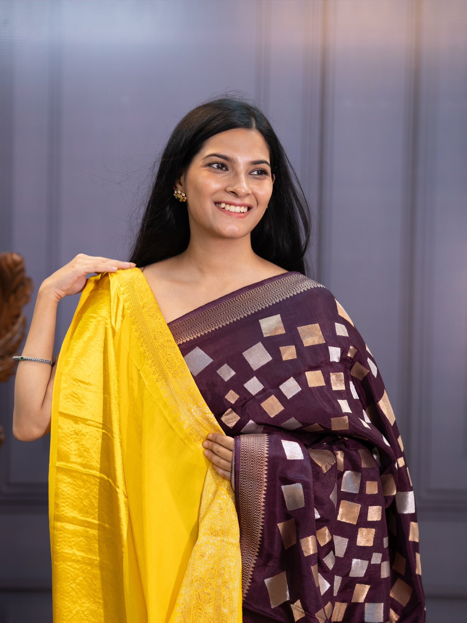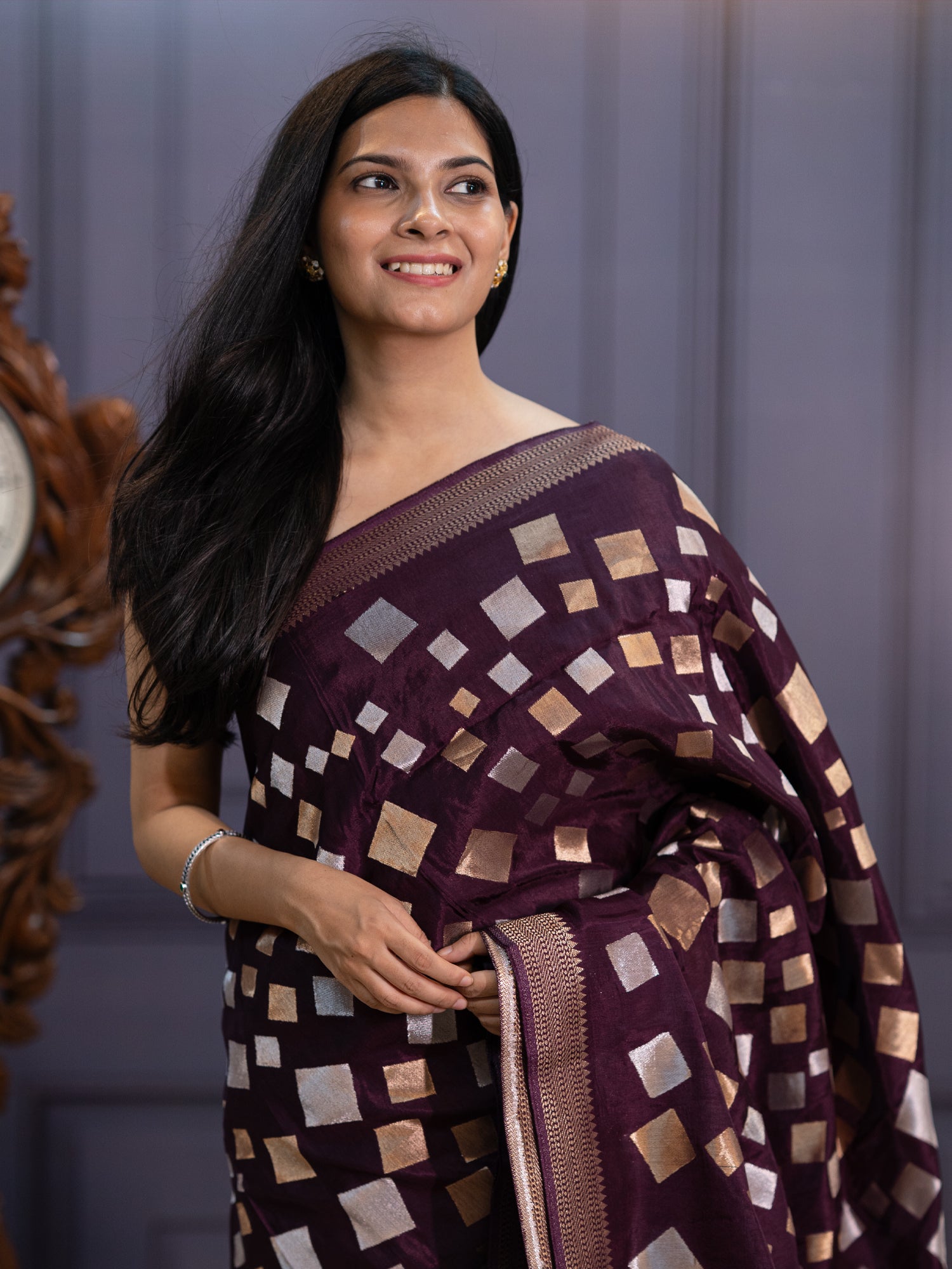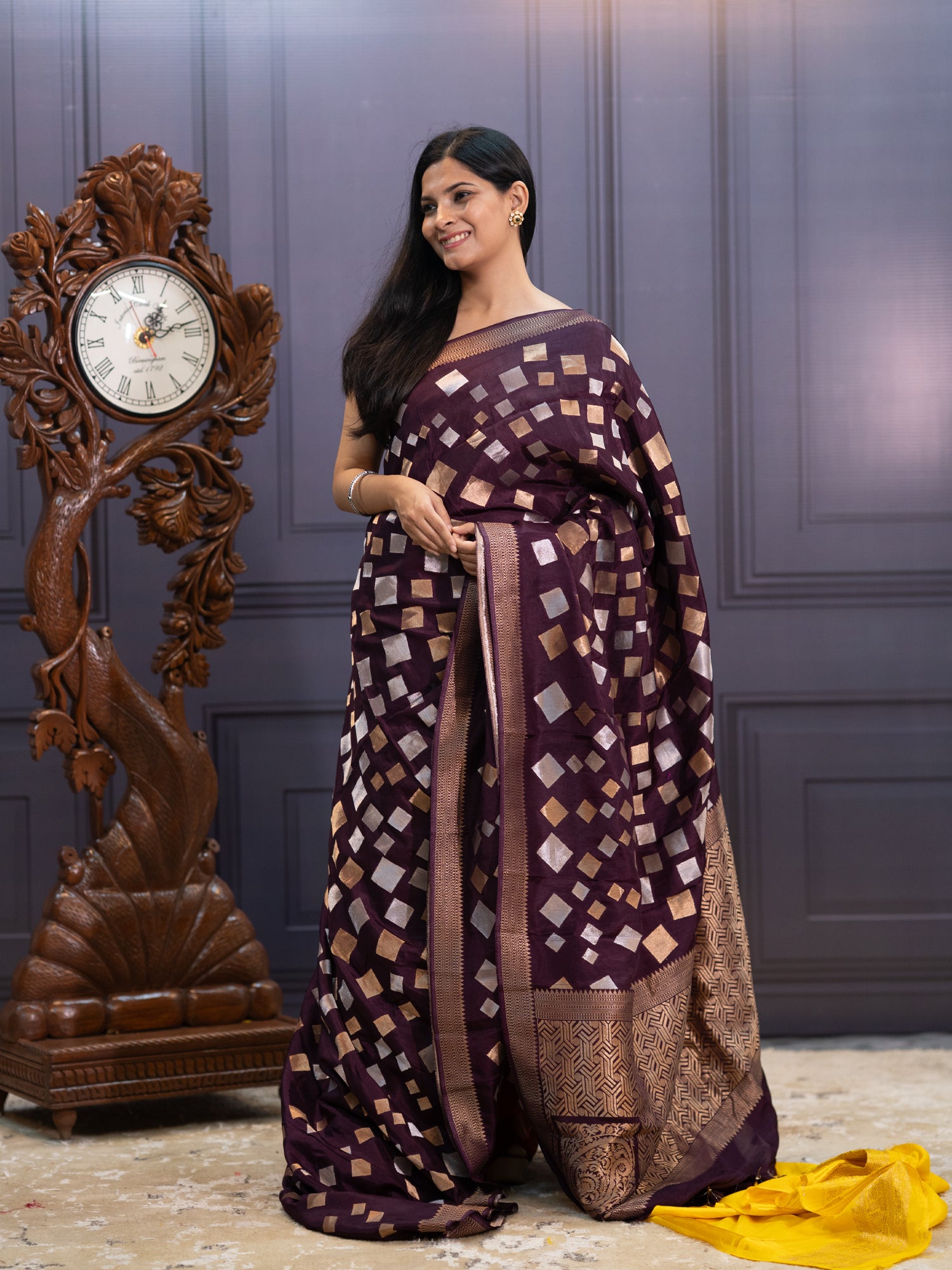 Elevate your elegance with this stunning wine-hued Banaras silk saree that whispers sophistication! Adorned with gleaming gold and silver zari...