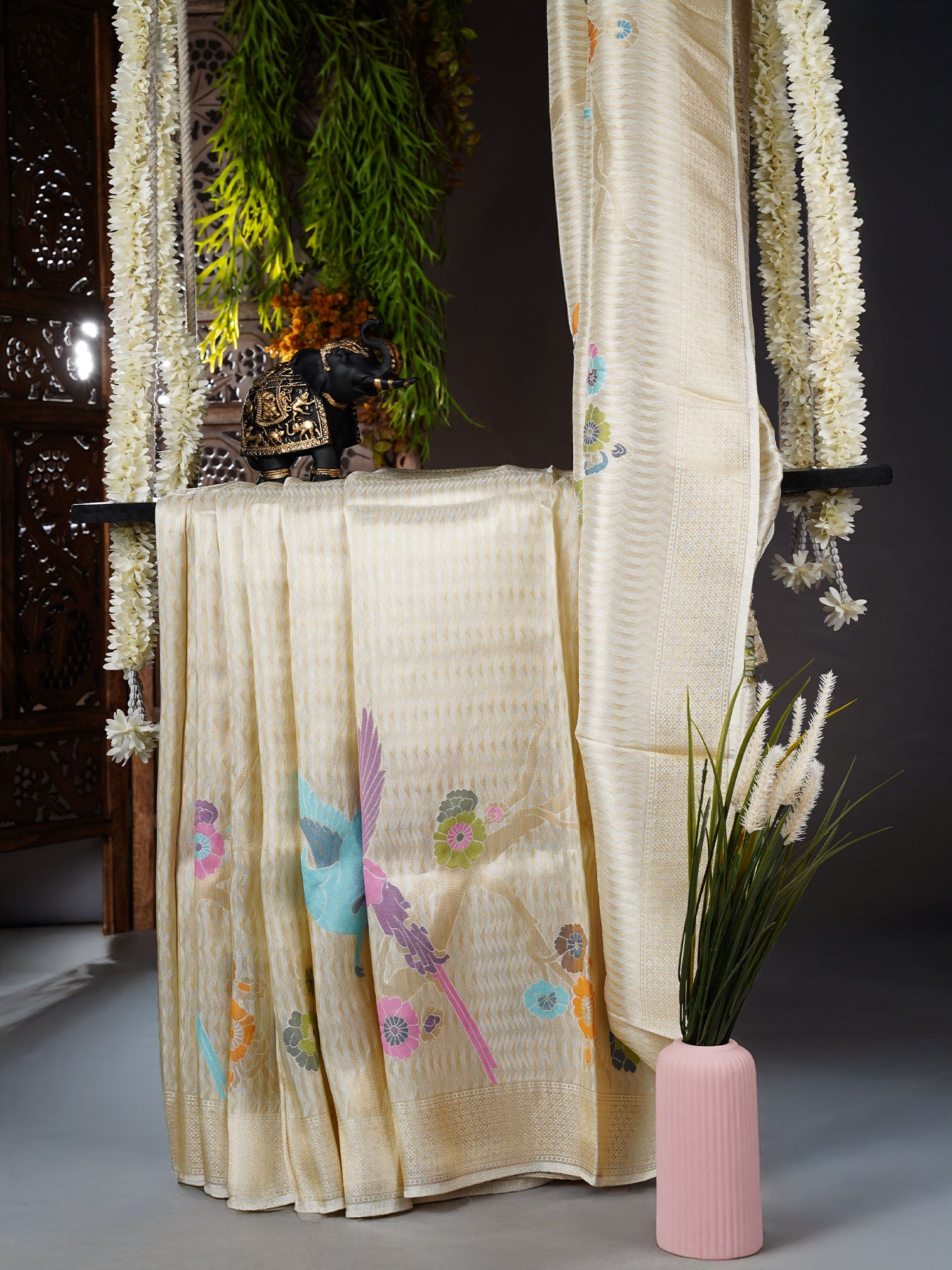 Banaras Silk saree with Meenakari Butties and Golden Zari Border- Cream