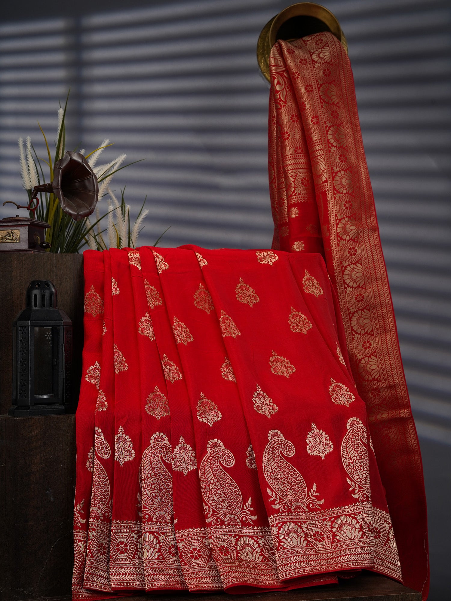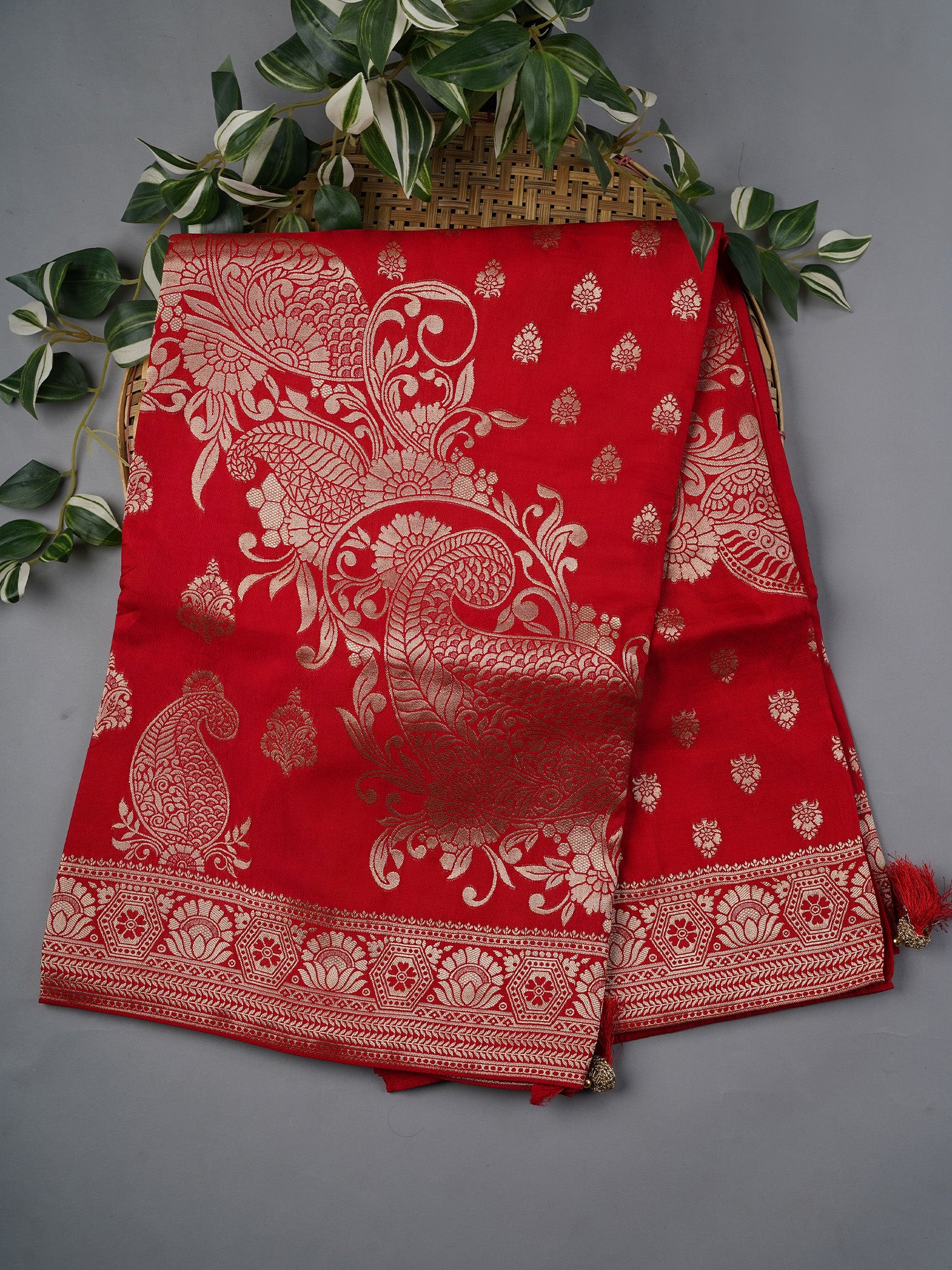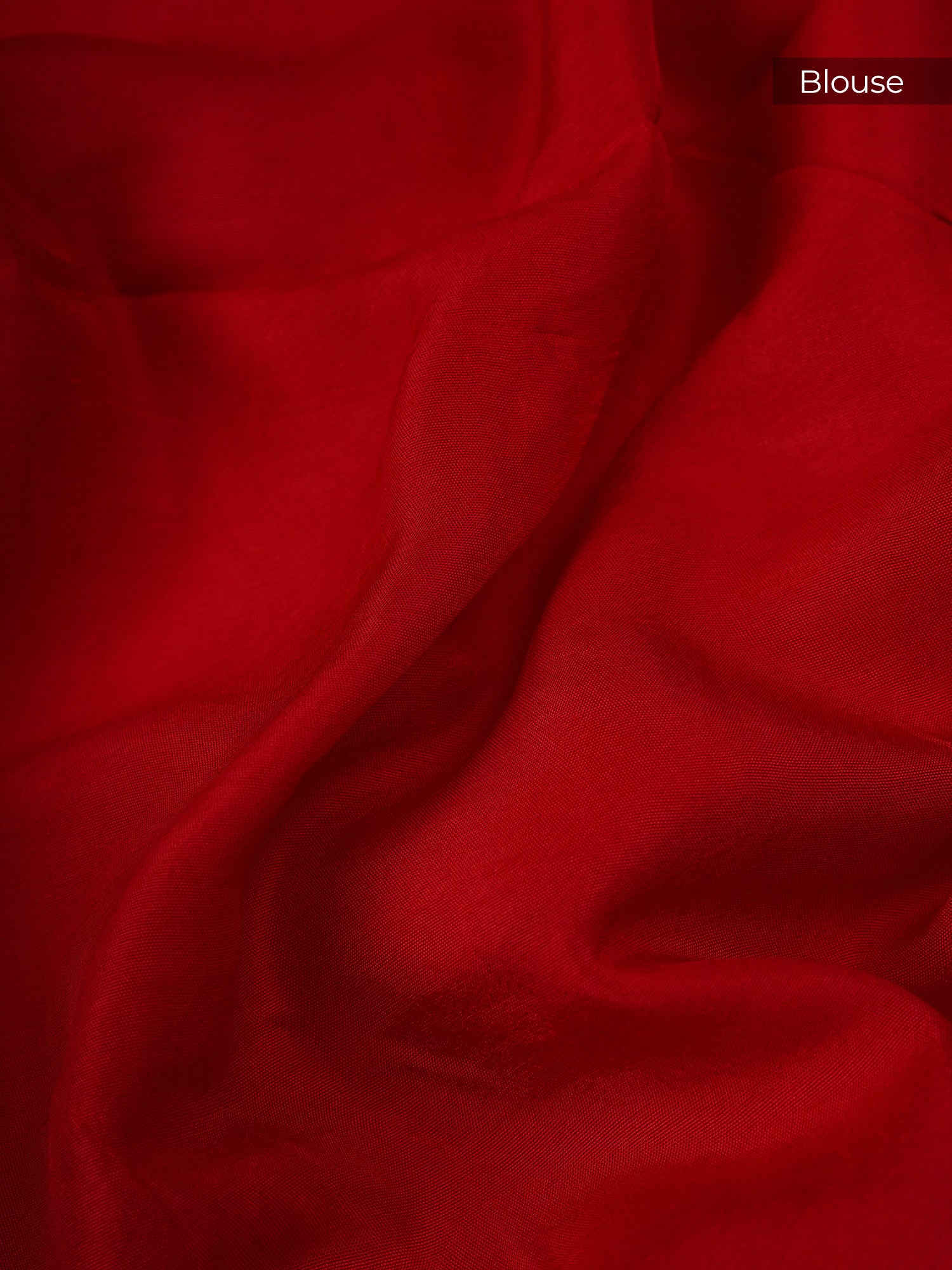 Draped in timeless elegance, this stunning Banaras silk saree features intricate gold zari work that dances across every inch of the fabric. The rich red hue radiates sophistication and celebration, making it perfect for weddings, festivals, and special occasions. Handcrafted with traditional weaving techniques, each thread tells a story of heritage and artistry. The lustrous silk drapes beautifully, while the shimmering zari embellishments catch the light with every movement. A true showstopper that transforms any moment into something memorable.