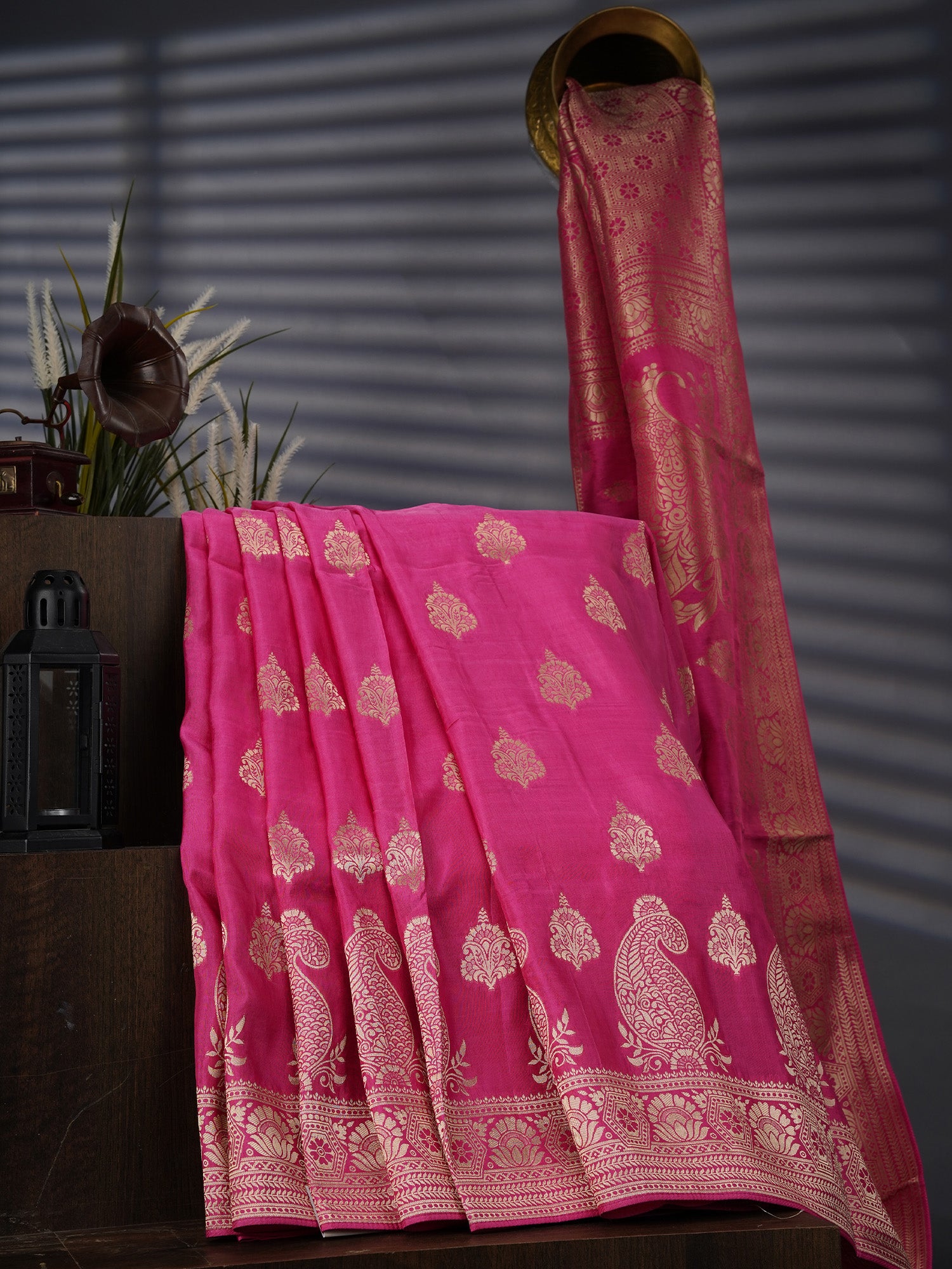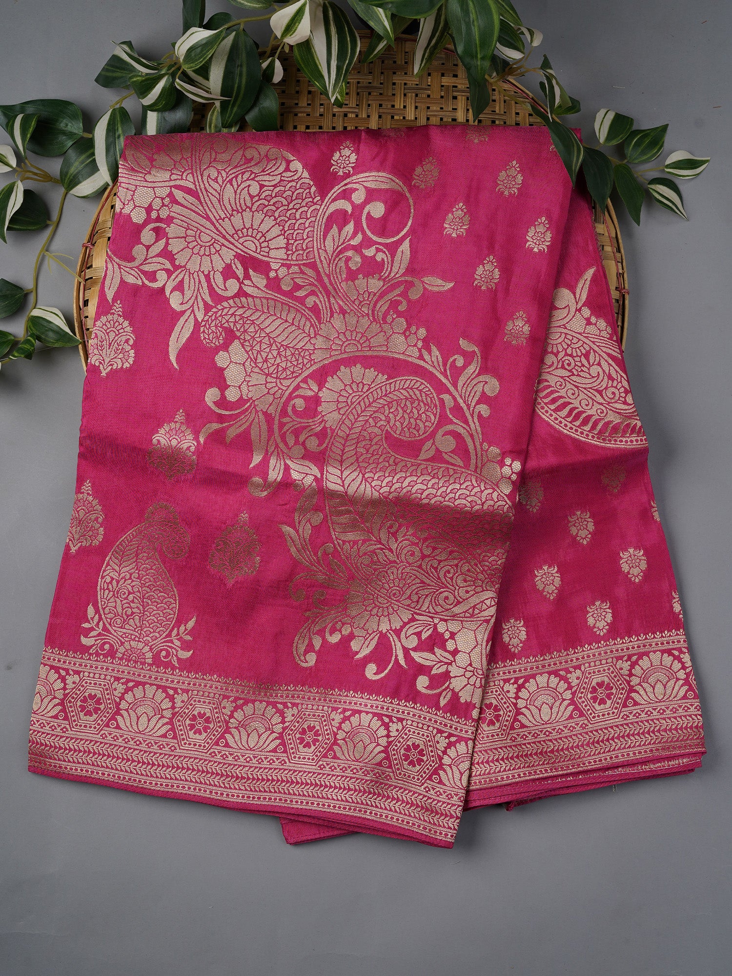 Draped in classic grandeur, this Banaras Silk saree in a radiant Pink hue embodies the richness and regality of timeless craftsmanship. The fabric shimmers beautifully as allover golden zari work illuminates every inch, creating a luxurious tapestry of tradition and celebration.
