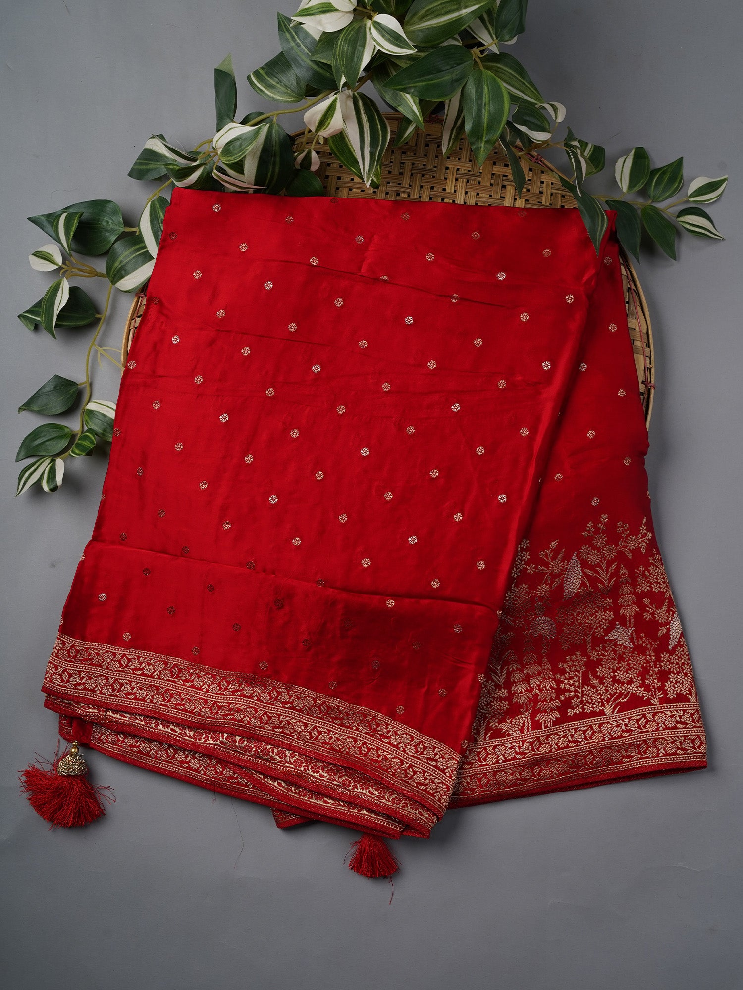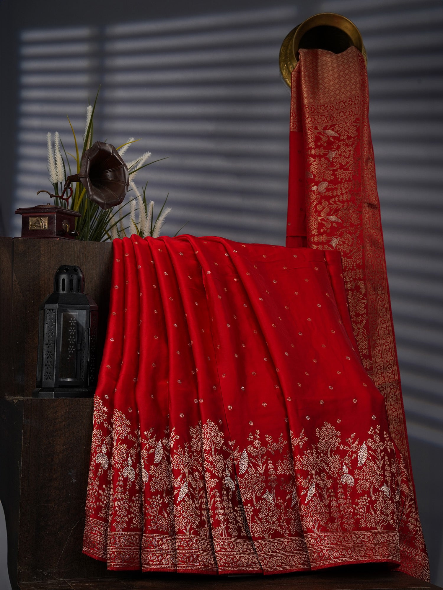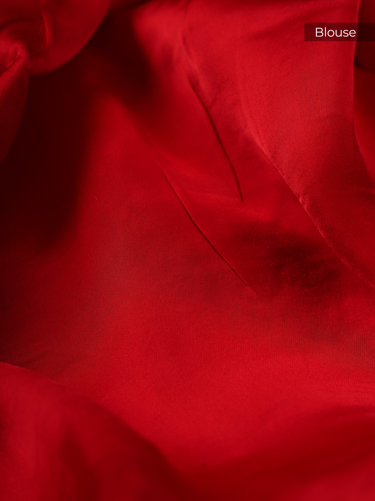 Draped in timeless elegance, this stunning red Banaras silk saree features a lustrous golden border that catches the light with every movement. The rich crimson hue paired with shimmering gold accents creates an enchanting contrast perfect for celebrations, weddings, or when you want to feel absolutely radiant. Crafted from authentic Banaras silk, this saree promises comfort and grace, making you the showstopper wherever you go. A wardrobe treasure that never goes out of style.