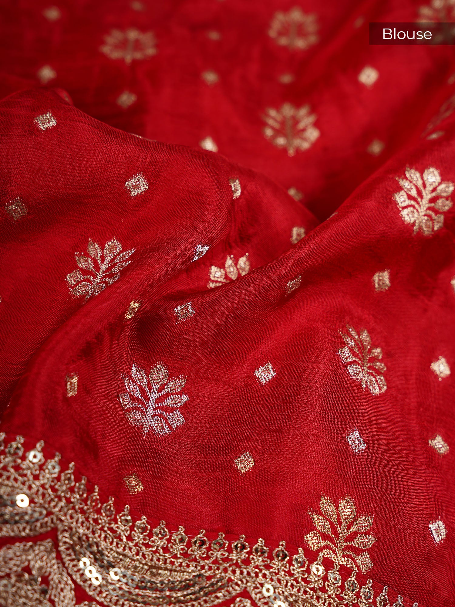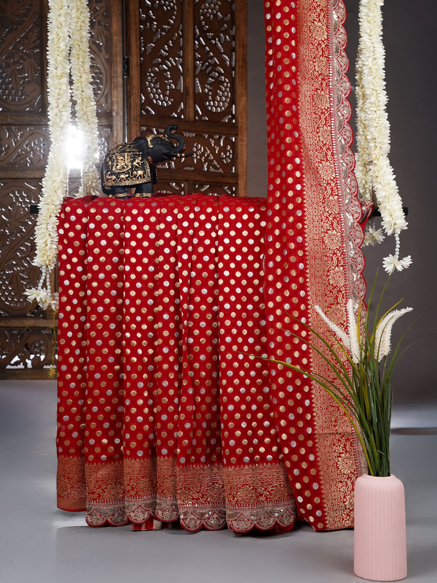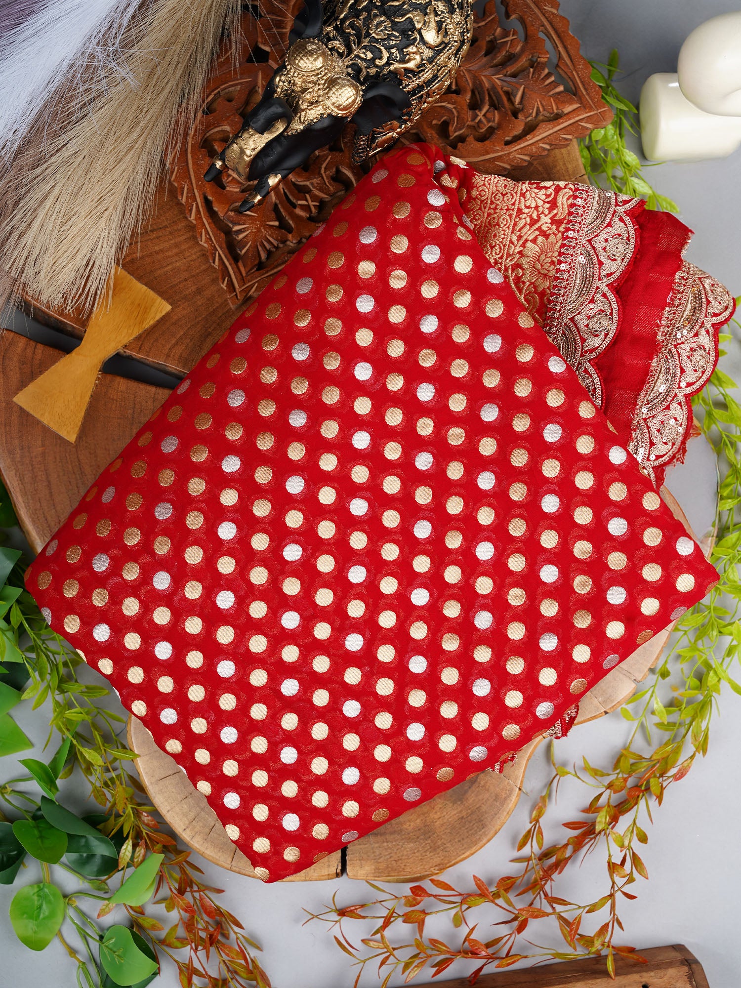 Elevate your ethnic wardrobe with this stunning Banarasi Kaddi Georgette saree that's pure elegance with a dash of sparkle. The luxurious georgette fabric drapes beautifully, while intricate gold and silver polka dots dance across the weave, creating a mesmerizing play of light. A delicate scallop border frames the saree with refined detailing, making it perfect for festive occasions, celebrations, or whenever you want to turn heads. The rich red hue adds timeless sophistication and pairs effortlessly with traditional jewelry. Lightweight yet graceful, this saree is your go-to for making a memorable impression.