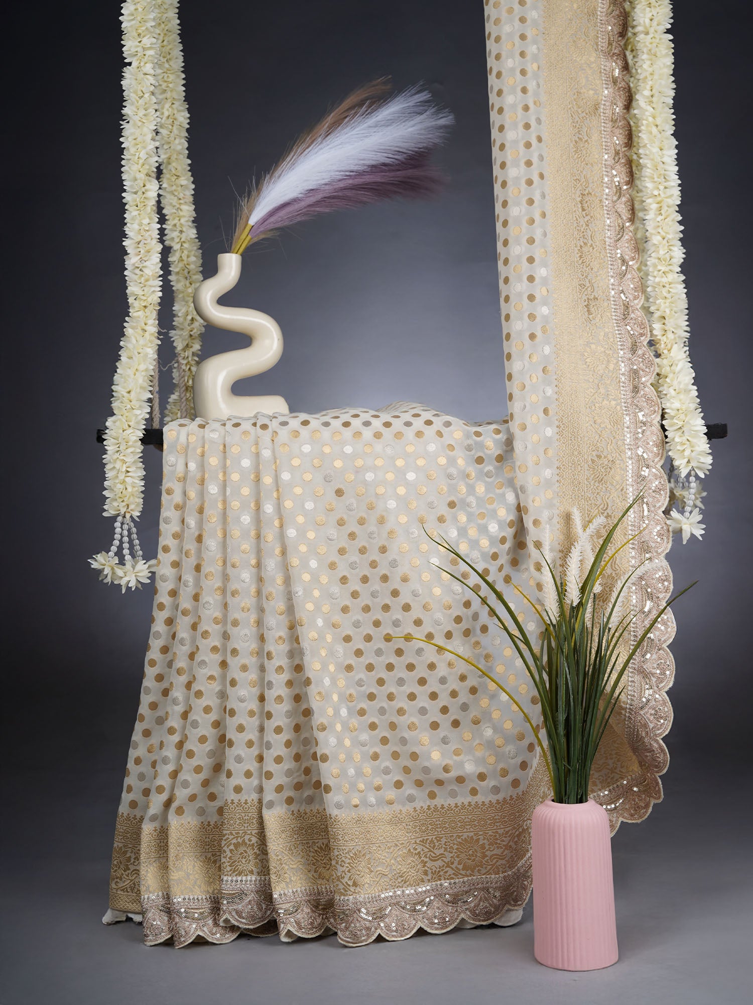 Elevate your ethnic wardrobe with this stunning Banarasi Kaddi Georgette saree that effortlessly blends timeless tradition with contemporary flair. The pristine white base serves as the perfect canvas for delicate gold and silver polka dots that dance across the fabric, creating an enchanting visual rhythm. The scallop border adds a graceful finishing touch, framing the saree with refined elegance. Crafted from luxurious Kaddi Georgette, this piece drapes beautifully while maintaining a light, breathable feelāideal for celebrations, festive occasions, or whenever you want to make a sophisticated statement. A versatile treasure that transitions seamlessly from day events to evening gatherings.