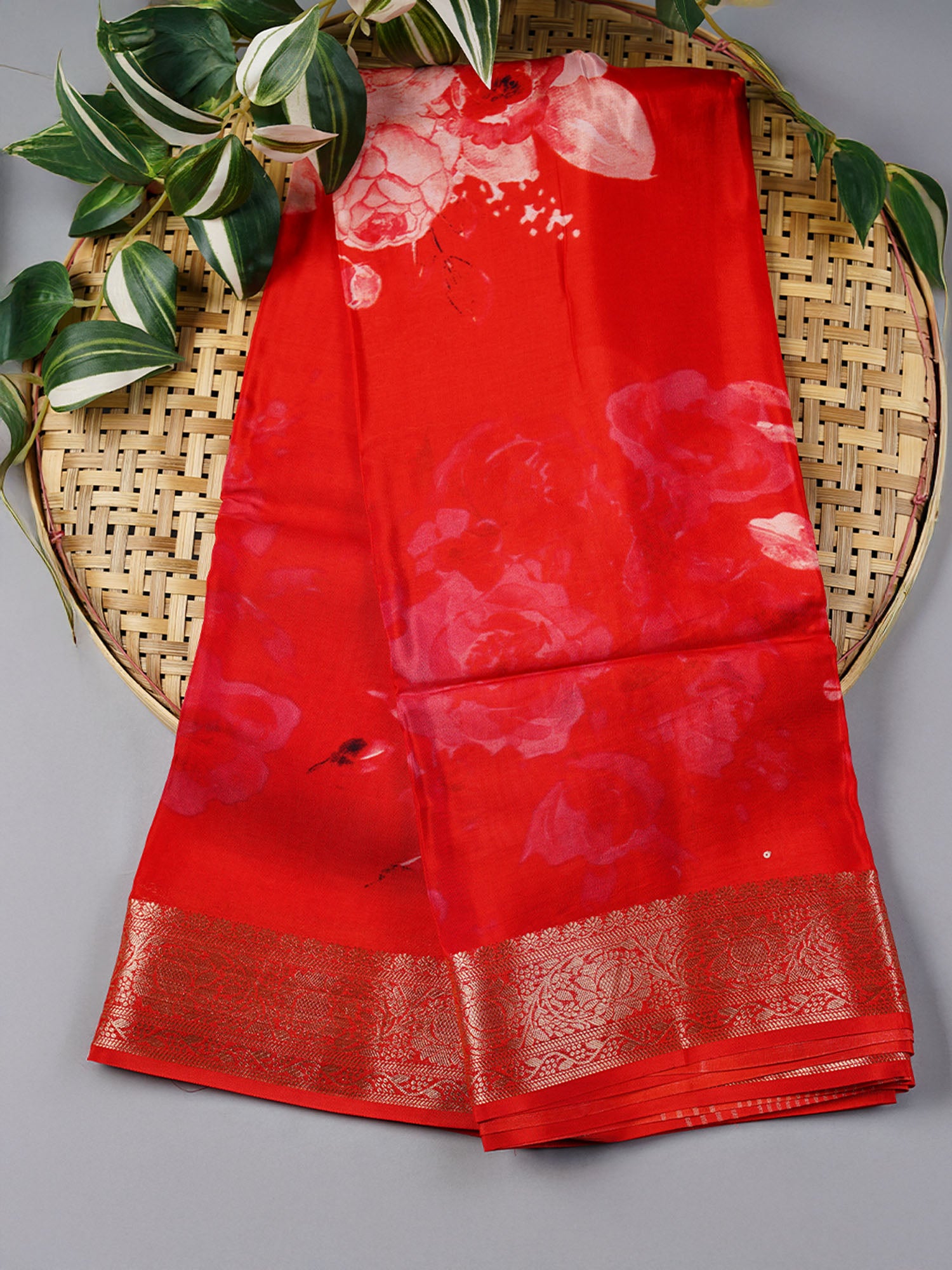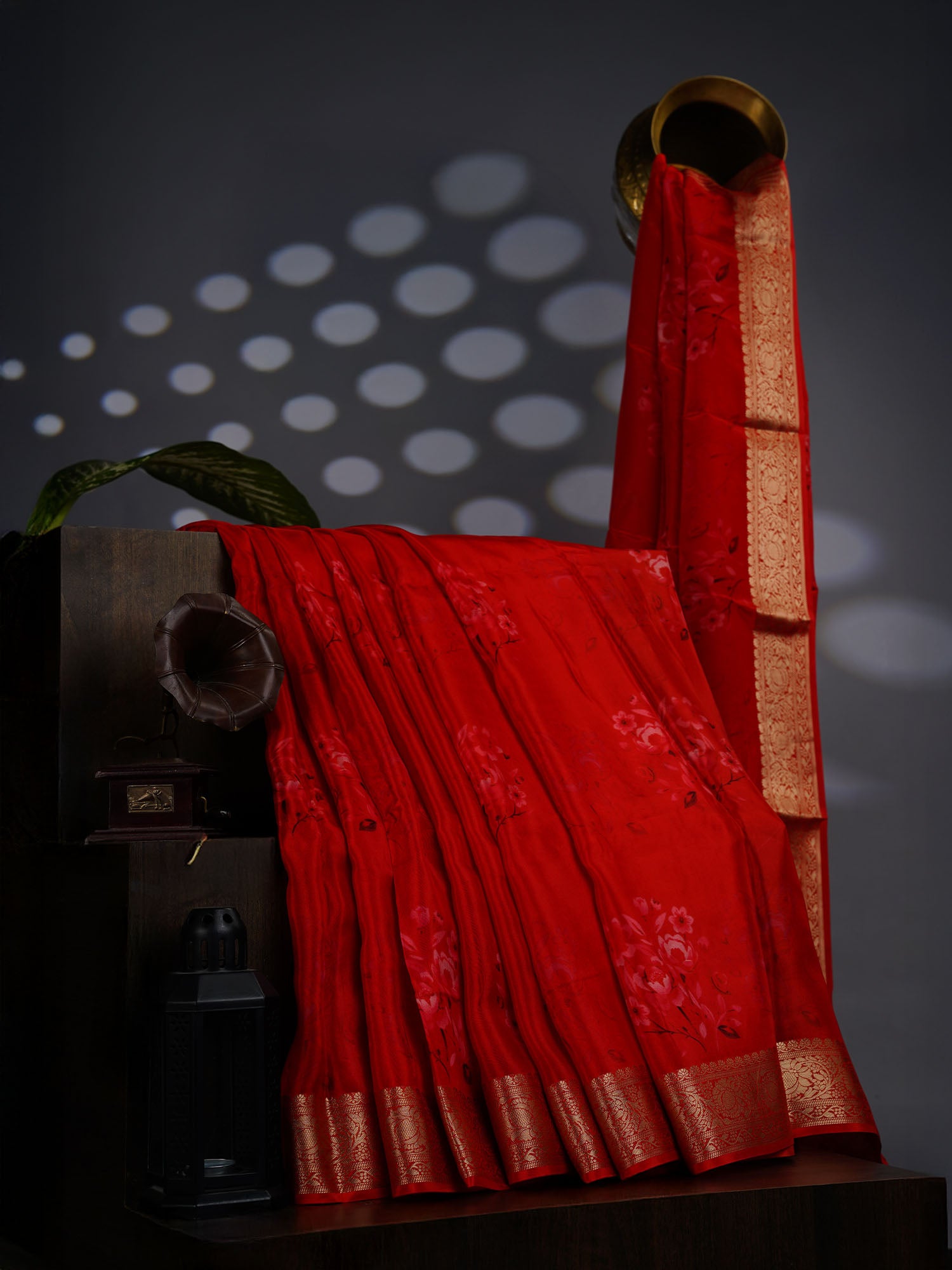 Twirl into elegance with this stunning red Binny crepe saree, where delicate floral prints dance across the fabric like a garden in full bloom. The showstopper? A shimmering golden zari border that catches the light with every graceful movement, adding that perfect touch of glamour to your ethnic wardrobe. Lightweight crepe ensures comfort all day long, whether you're attending a festive celebration or making a statement at a special occasion. This versatile beauty pairs effortlessly with traditional jewelry and modern accessories alike, making it your go-to choice for looking absolutely radiant.