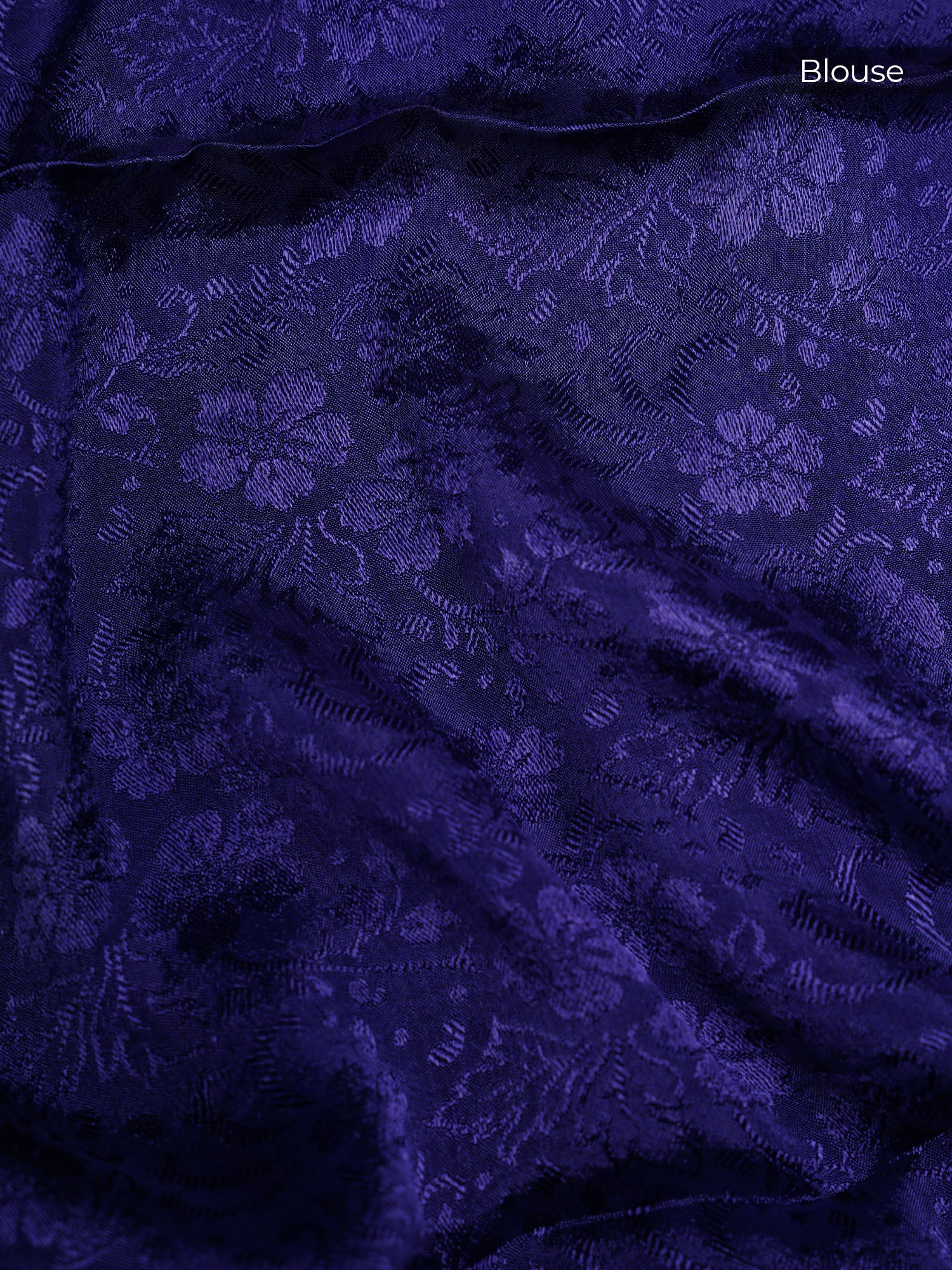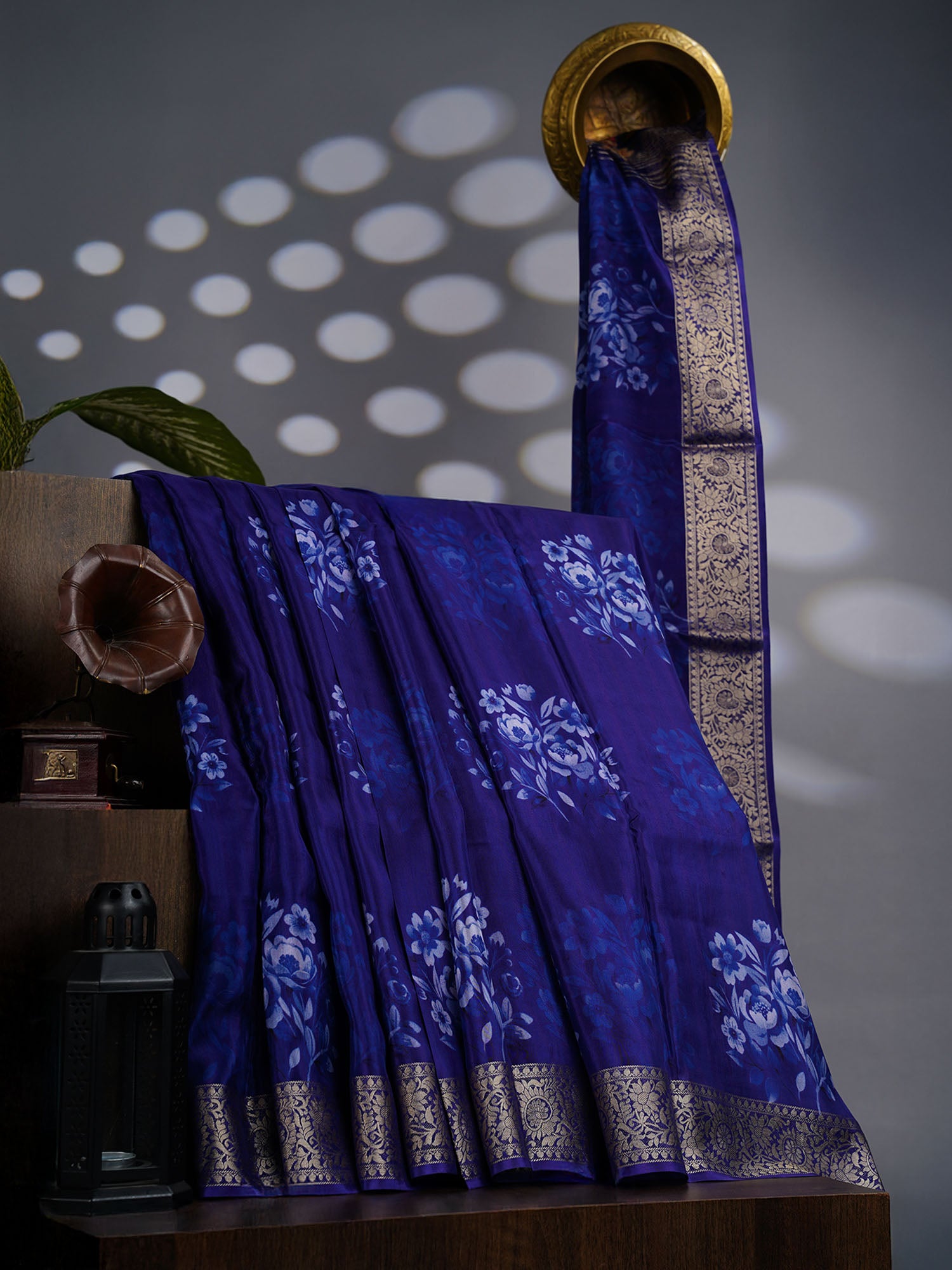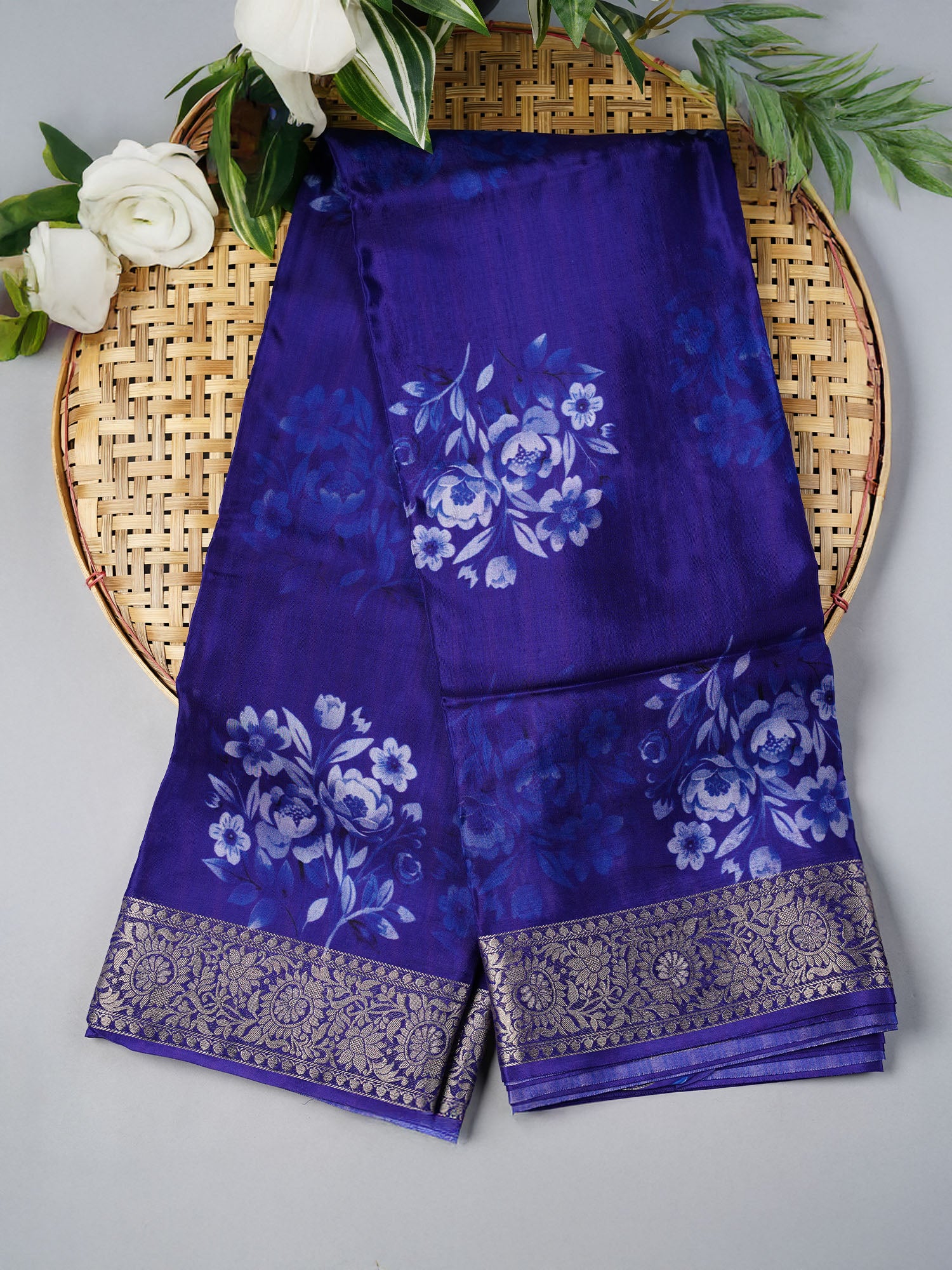 Binny Crepe Floral Print with Golden Zari Border- Royal Blue