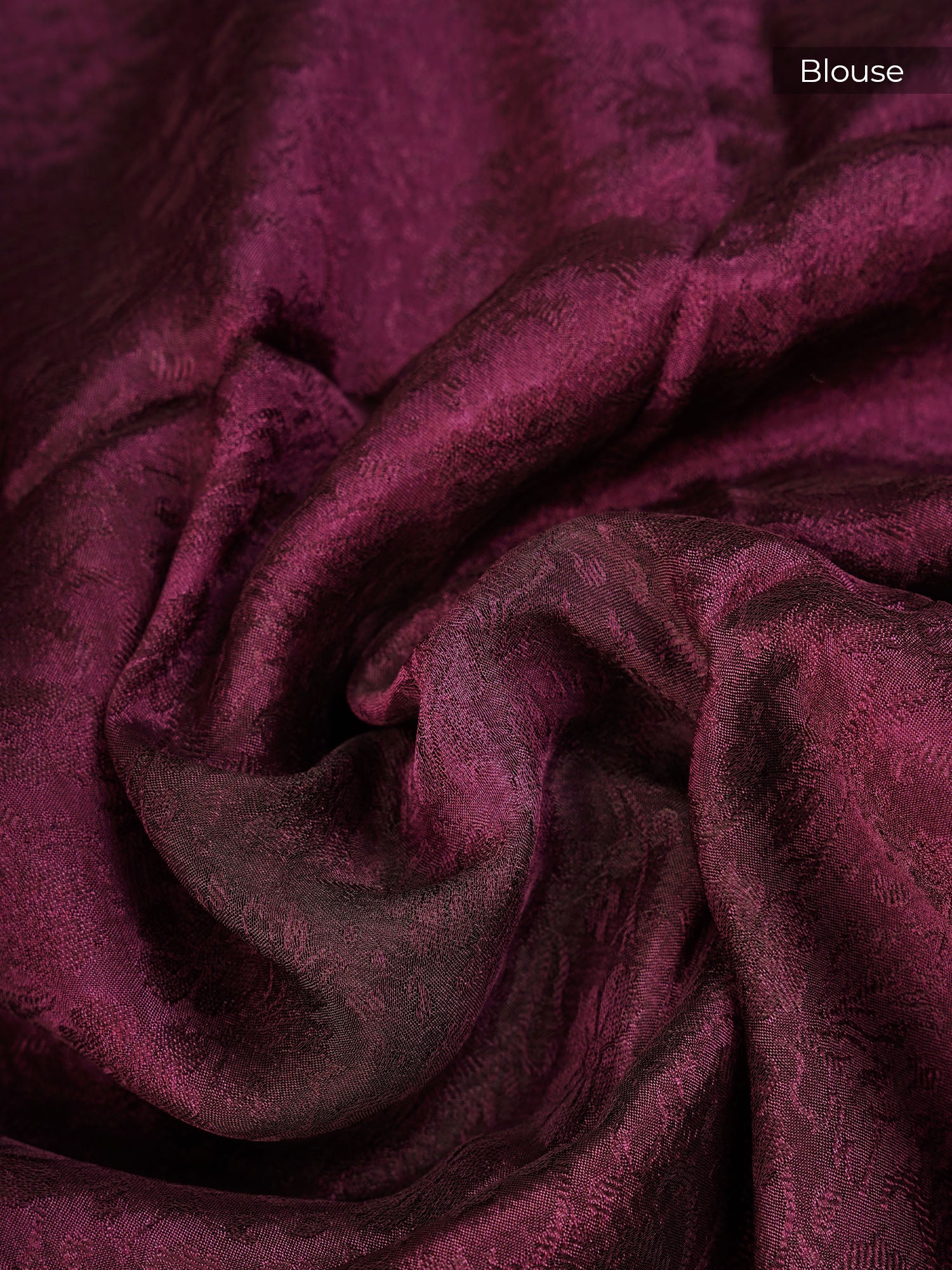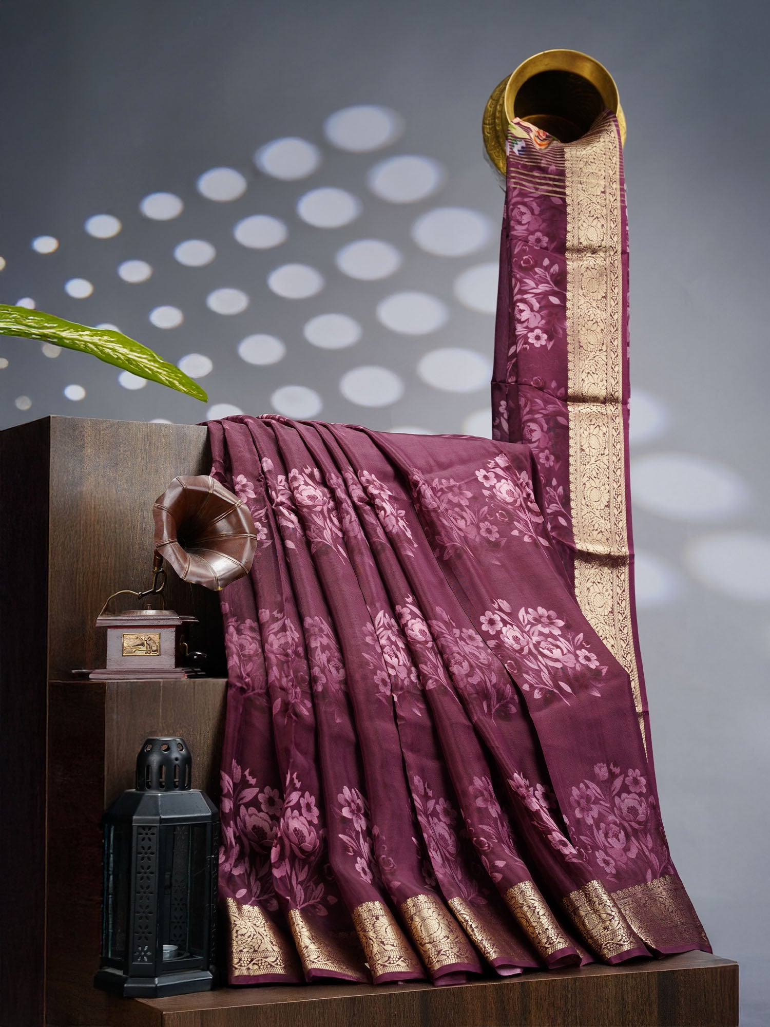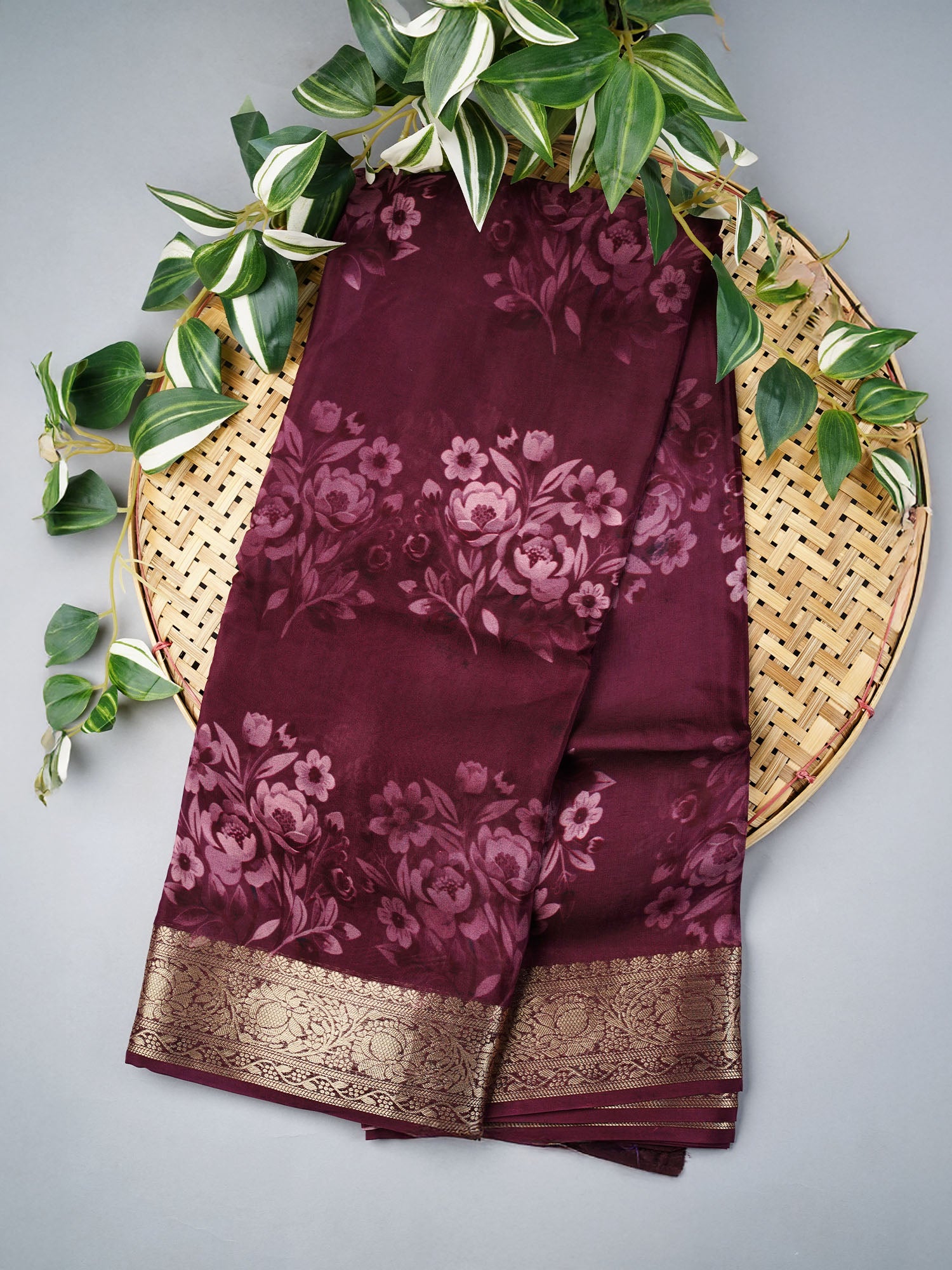 Binny Crepe Floral Print with Golden Zari Border- Wine