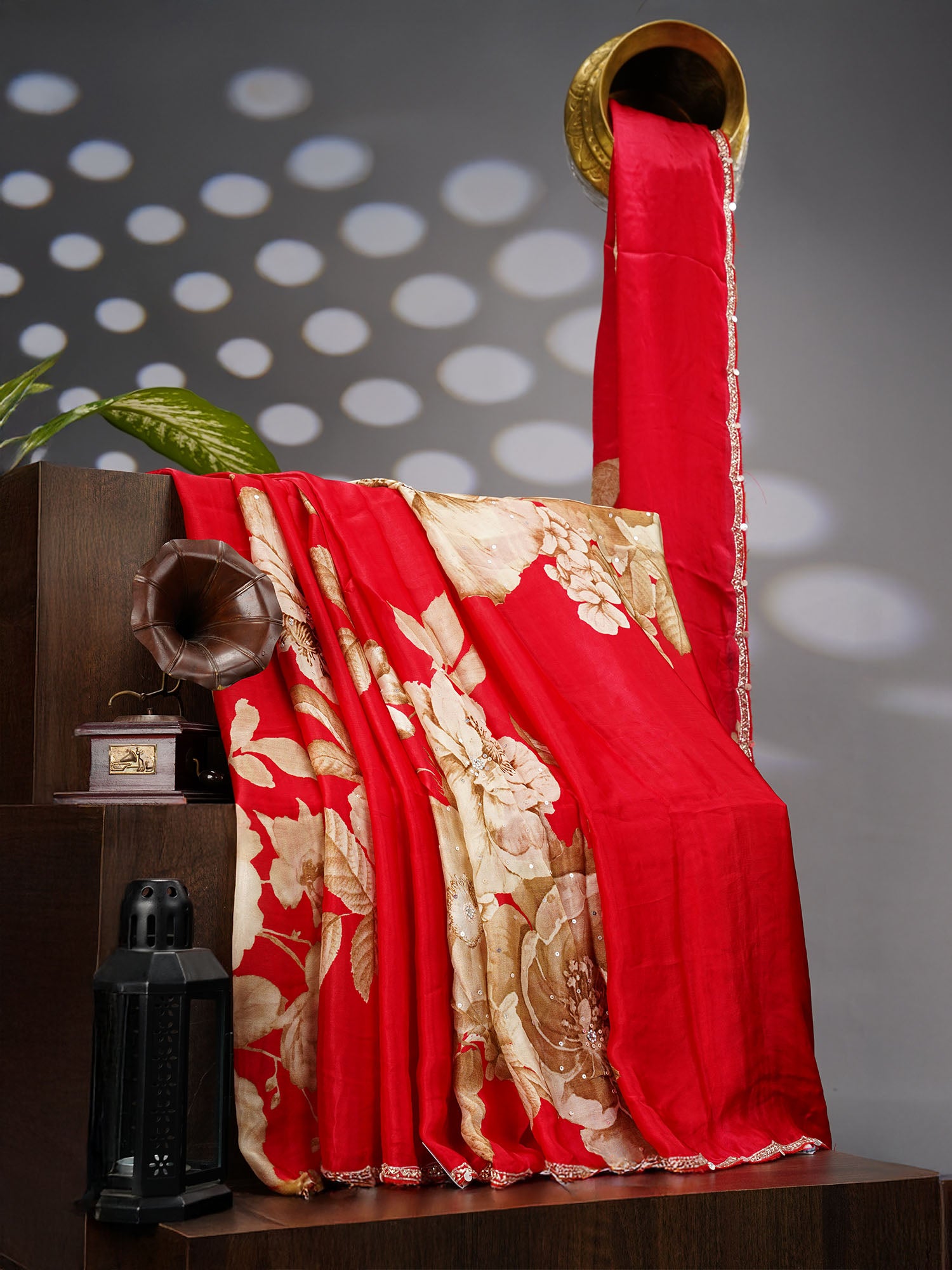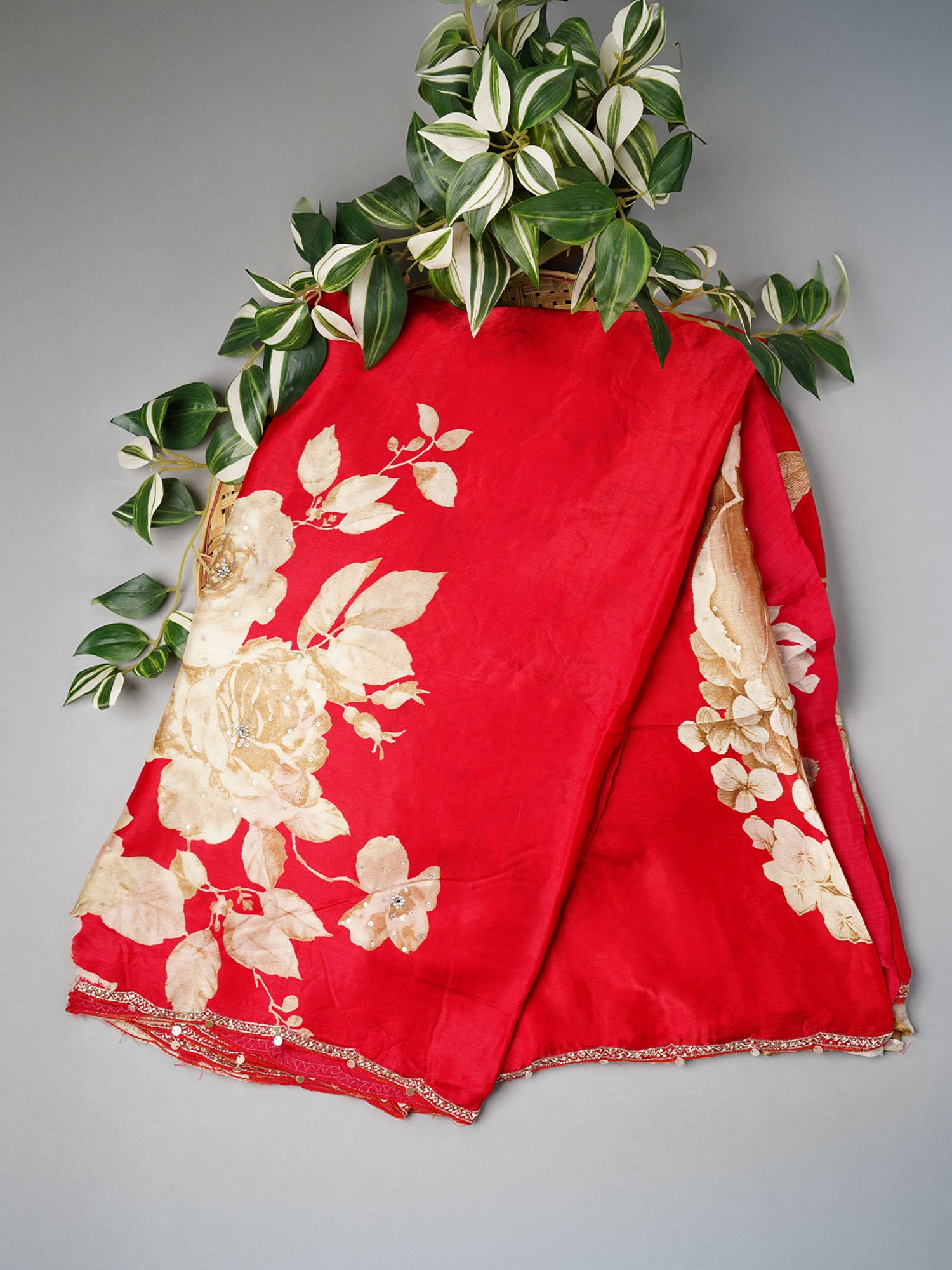 Elevate your ethnic wardrobe with this stunning Binny Crepe Saree in vibrant red! Featuring an intricate floral print paired with an elegant scallop border, this saree showcases exquisite Kardhana sequence work that catches the light beautifully. The lightweight crepe fabric drapes gracefully, making it perfect for weddings, festivals, or special celebrations. The delicate embellishments add a touch of glamour without compromising comfort. A timeless piece that blends traditional craftsmanship with contemporary style—your go-to saree for turning heads at any occasion.