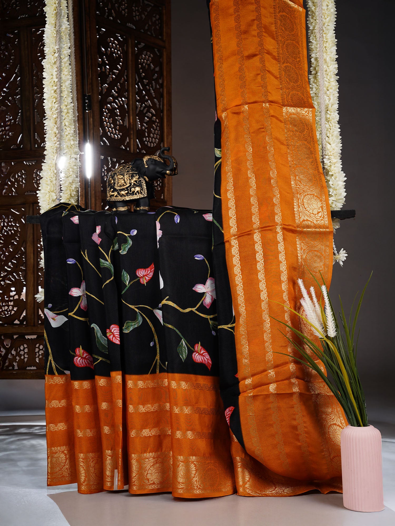 Binny Crepe Saree Floral Print With contrast Border - Black