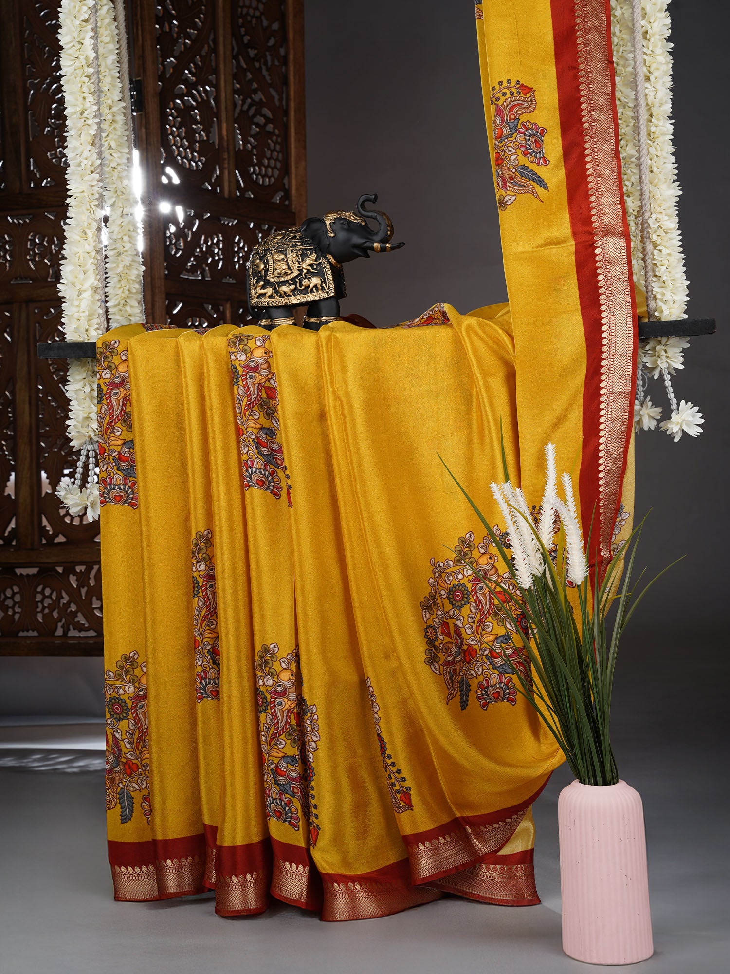 Embrace the charm of traditional craftsmanship with this stunning Binny Crepe Saree in vibrant yellow! Adorned with intricate kalamkari print...