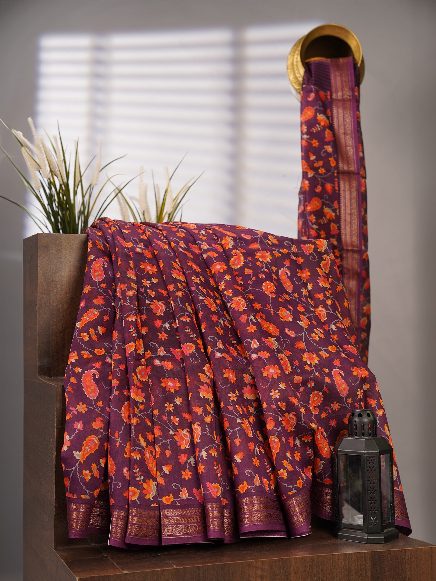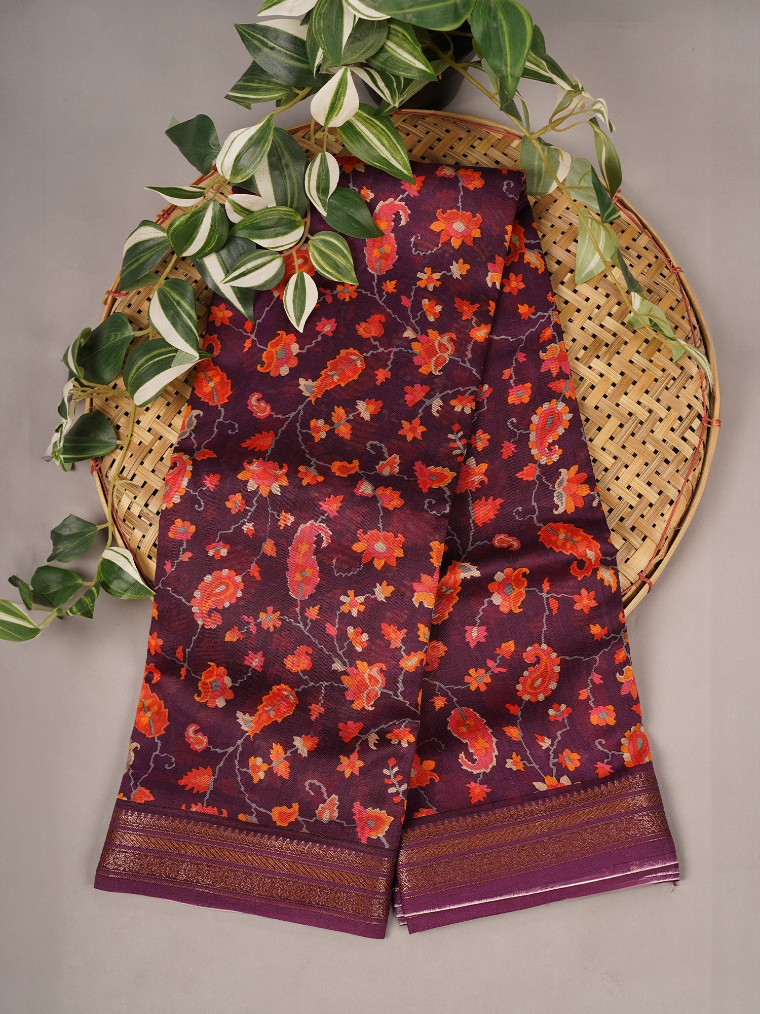 Experience the timeless elegance of the Chanderi Cotton saree in a rich wine hue, featuring exquisite digital prints and an...