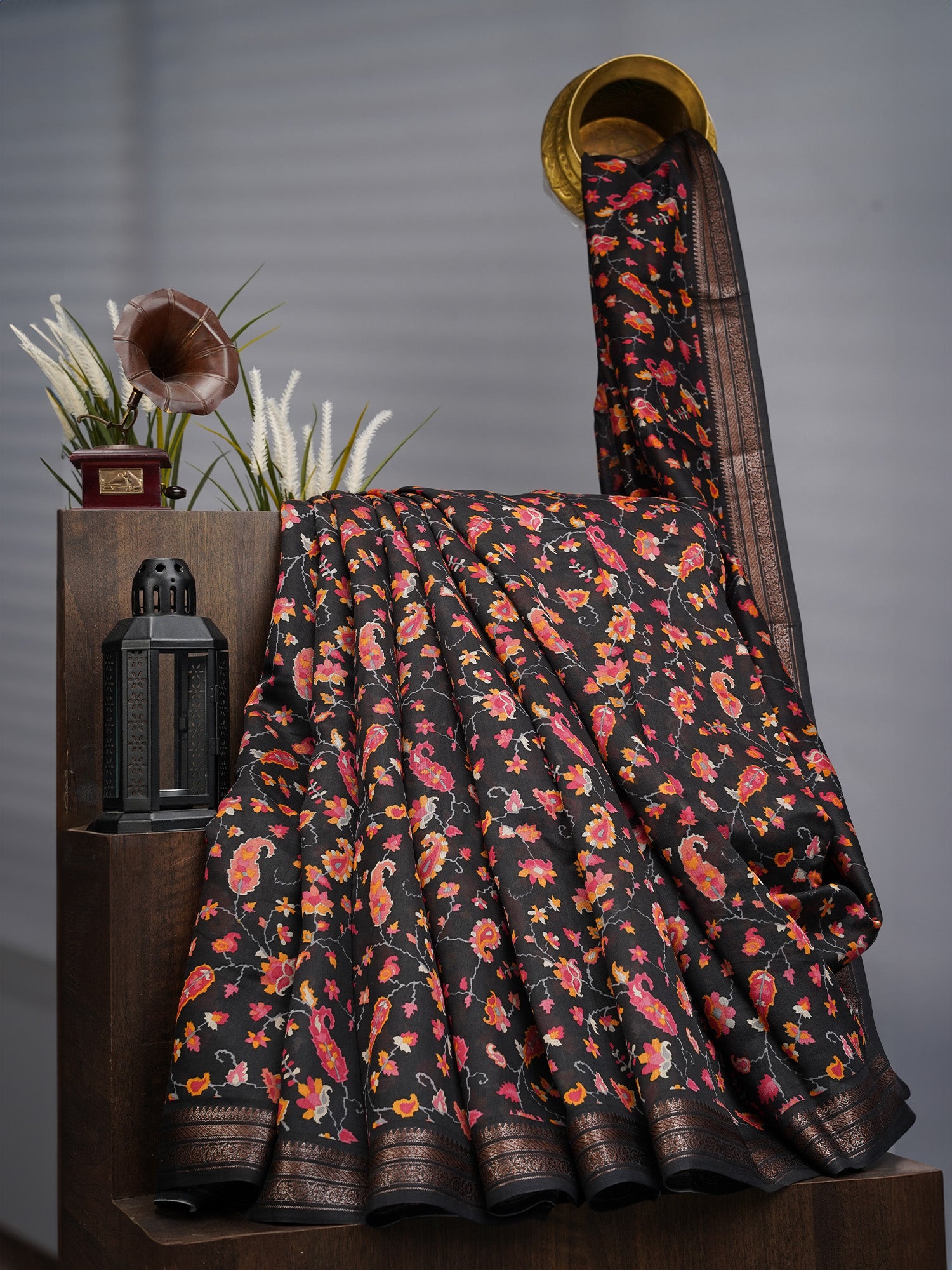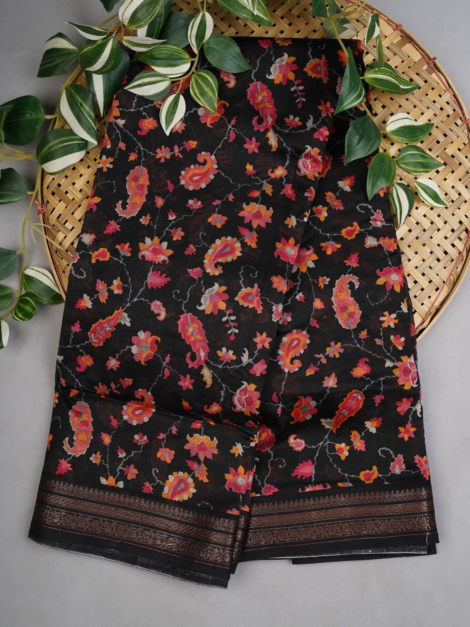 Elevate your ethnic wardrobe with this exquisite Chanderi silk saree, featuring an intricate allover print that showcases traditional craftsmanship. The lustrous Chanderi fabric drapes beautifully, offering a perfect balance of elegance and comfort for both everyday wear and special occasions. The standout feature is the ornate antique zari border, meticulously crafted to add a touch of timeless sophistication. The deep black base creates a striking canvas that enhances the richness of the print and zari work, making this saree a versatile choice that complements various skin tones and styling preferences.