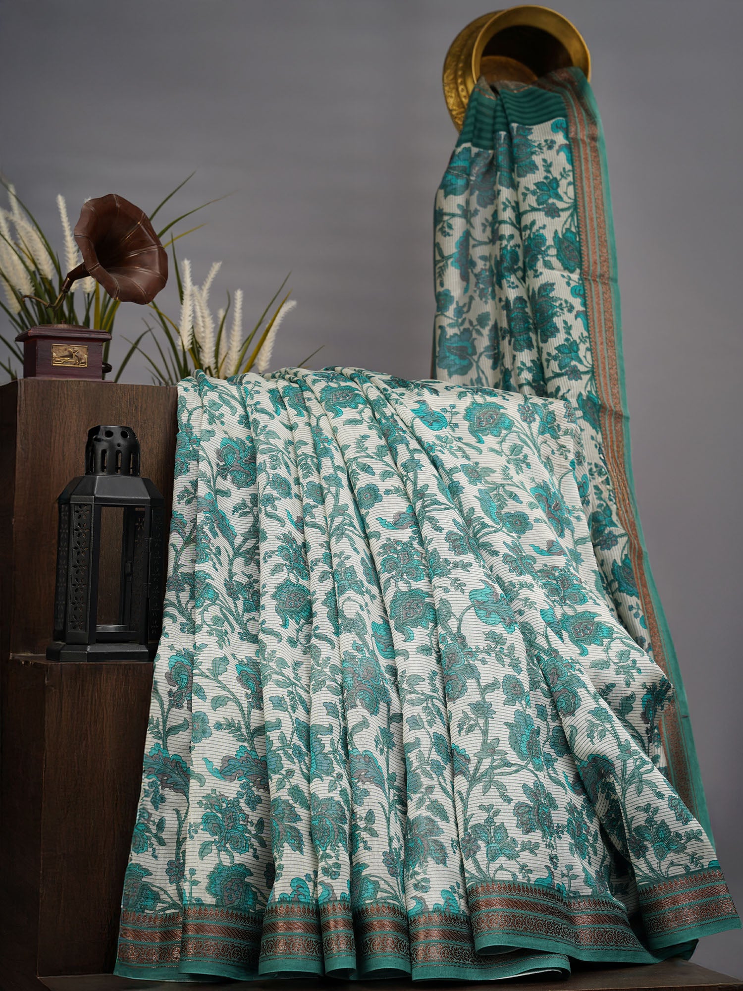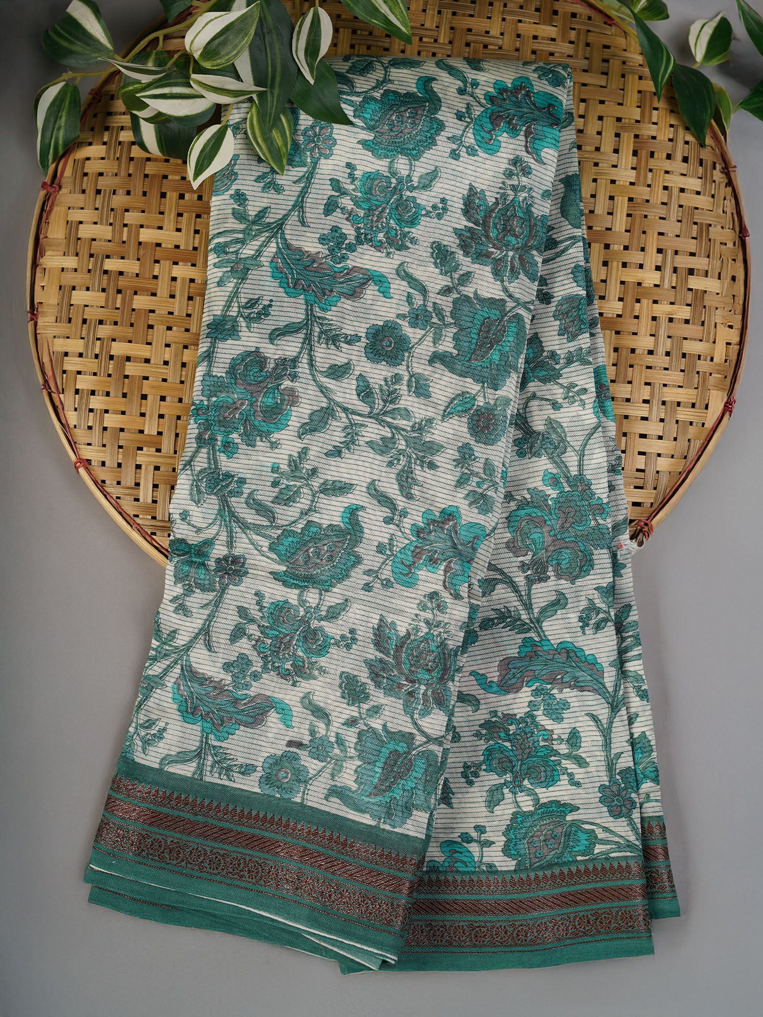Elevate your ethnic wardrobe with this exquisite Chanderi silk saree, renowned for its lightweight yet structured drape. The allover print showcases intricate traditional motifs in a sophisticated green palette, while the antique zari border adds timeless elegance and grandeur. Chanderi silk's natural sheen and breathability make it ideal for both festive occasions and everyday wear. The antique gold zari detailing provides authentic craftsmanship that complements the fabric's refined texture. Perfect for those who appreciate classic Indian textiles with contemporary styling versatility.