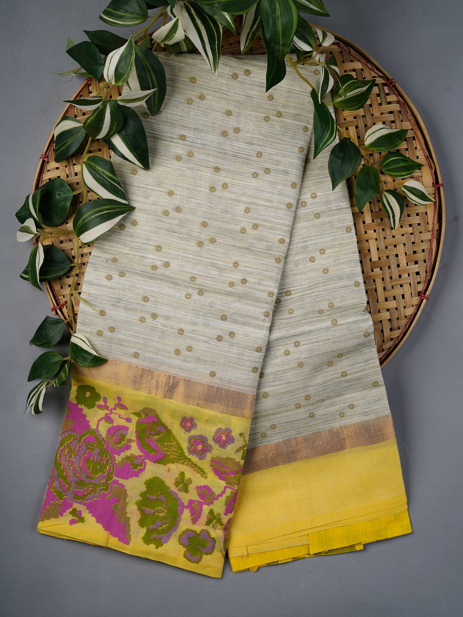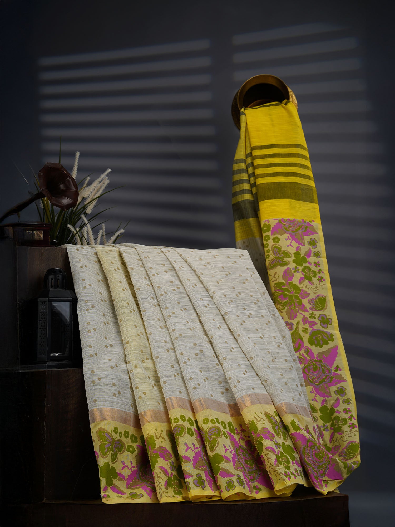 Drape yourself in timeless elegance with this stunning Chanderi silk saree featuring an enchanting floral print border. The luxurious Chanderi silk offers a perfect blend of softness and structure, creating graceful folds that celebrate your silhouette. The delicate beige base provides a versatile canvas, while the intricate floral border adds a touch of botanical charm—ideal for weddings, festivals, or elevated everyday wear. This classic piece effortlessly transitions from traditional occasions to modern styling, making it a wardrobe essential for the discerning saree lover.