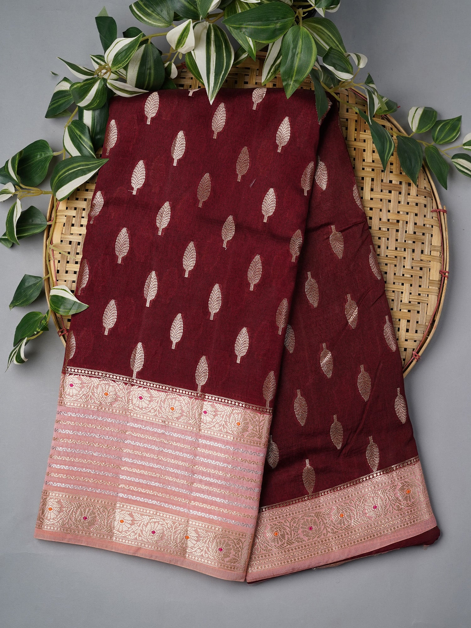 Drape yourself in timeless elegance with this stunning Chanderi silk saree that's pure magic. The rich maroon base is elevated...