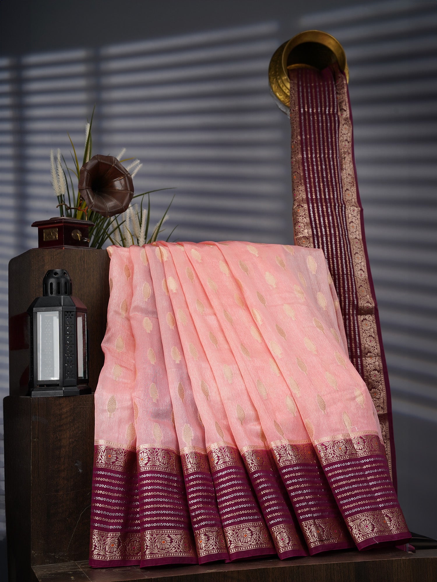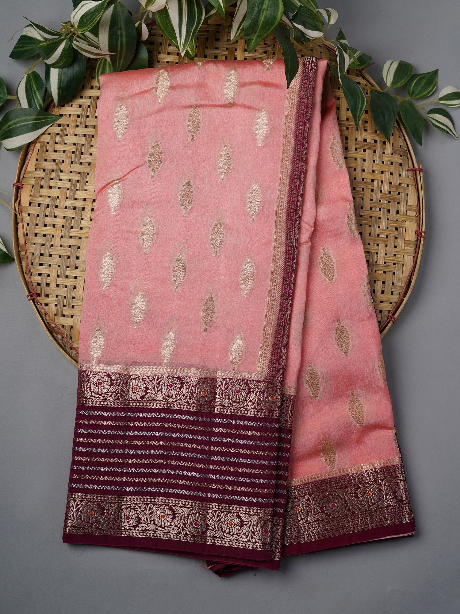 Drape yourself in timeless elegance with this stunning Chanderi silk saree, where vibrant orange meets the shimmer of gold and silver contrast borders. The delicate gap weave technique showcases the fabric's signature lightweight texture, perfect for those who love traditional charm without compromising on comfort. Whether you're heading to a festive celebration or a casual gathering, this versatile piece effortlessly transitions from day to evening. The intricate border detailing adds just the right amount of sparkle to make you feel absolutely radiant. A wardrobe essential that celebrates the artistry of Indian textiles.