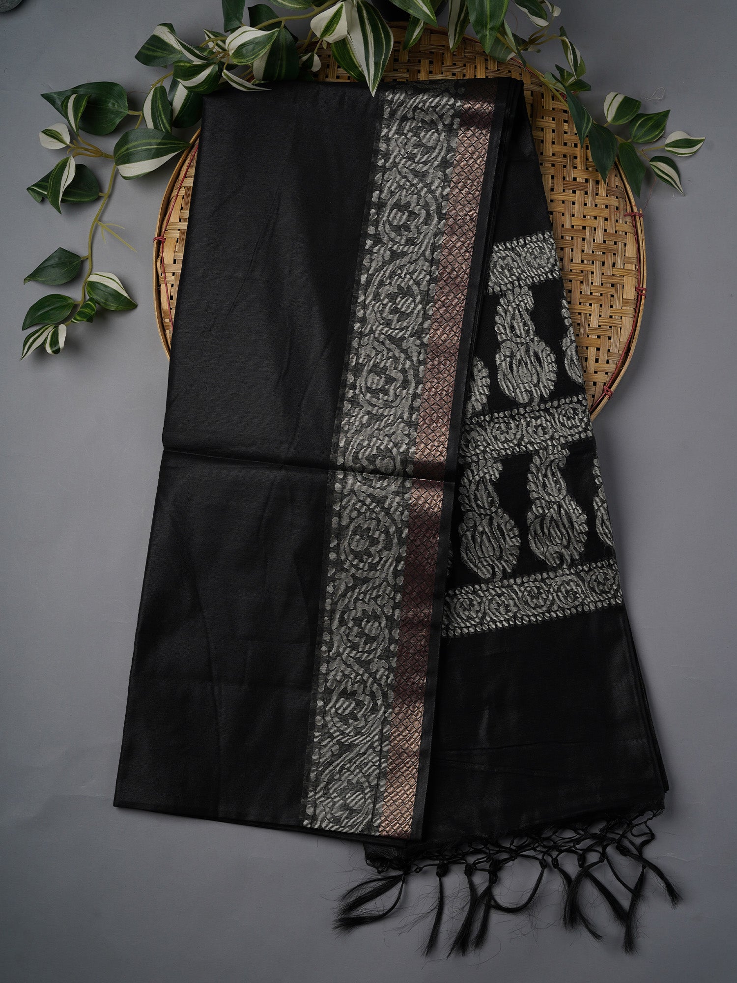 Draped in timeless elegance, this Chanderi silk saree features intricate thread weaving that catches the light beautifully. The striking golden border adds a touch of regal glamour against the deep black fabric, making it perfect for celebrations, weddings, or when you want to feel absolutely stunning. Lightweight yet luxurious, Chanderi silk is known for its breathability and graceful drape—ideal for India's warm climate. Whether you're attending a festive gathering or making a sophisticated statement, this saree effortlessly blends tradition with contemporary style.