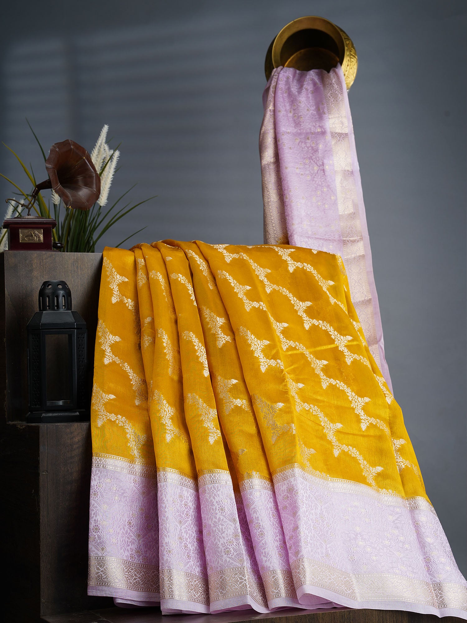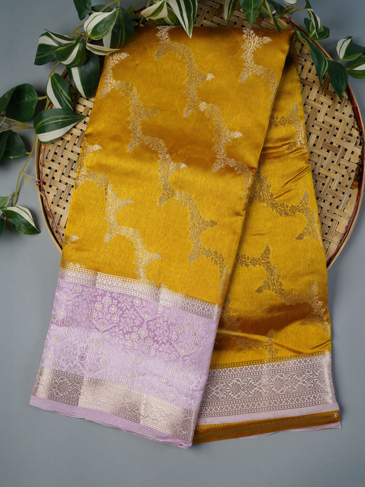 Drape yourself in sunshine with this stunning Chenderi silk saree! The playful lehariya weaving creates a mesmerizing wave pattern across the fabric, while the contrasting gap border adds a modern twist to this timeless classic. Crafted from luxurious Chenderi silk, this mustard beauty is perfect for celebrations, festivals, or whenever you want to turn heads. The soft drape and breathable fabric make it comfortable for all-day wear, while the vibrant hue complements all skin tones beautifully. A versatile piece that effortlessly transitions from traditional gatherings to contemporary occasions.