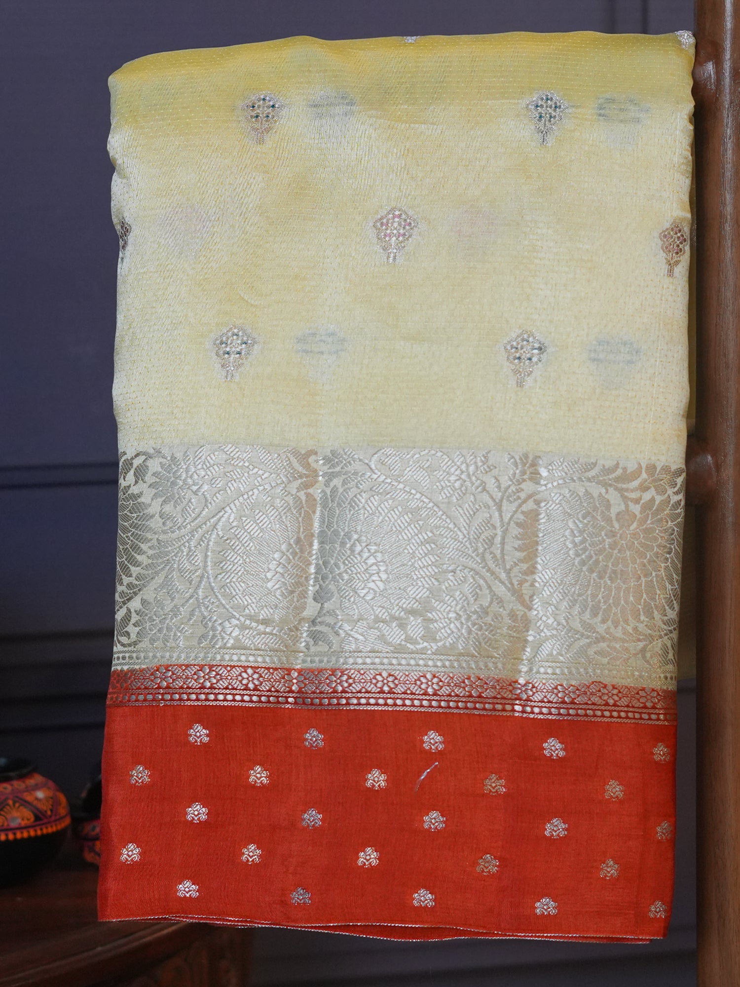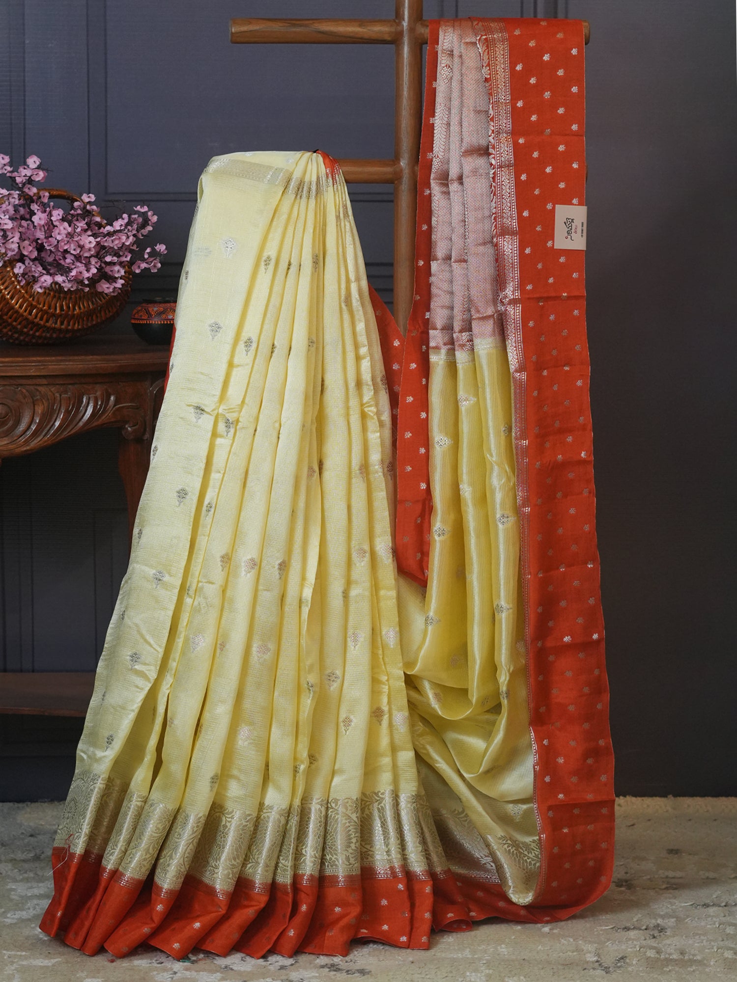 Drape yourself in sunshine with this enchanting Chiniya silk saree that whispers elegance at every turn. The soft light yellow base flows like liquid gold, while intricate golden butties dance across a striking contrast border that commands attention. Crafted from premium Chiniya silk, this saree offers that perfect blend of comfort and sophistication—ideal for celebrations, festivals, or whenever you want to feel absolutely radiant. The lustrous fabric catches light beautifully, ensuring you'll turn heads without trying too hard. A timeless piece that transforms any occasion into a moment worth celebrating.