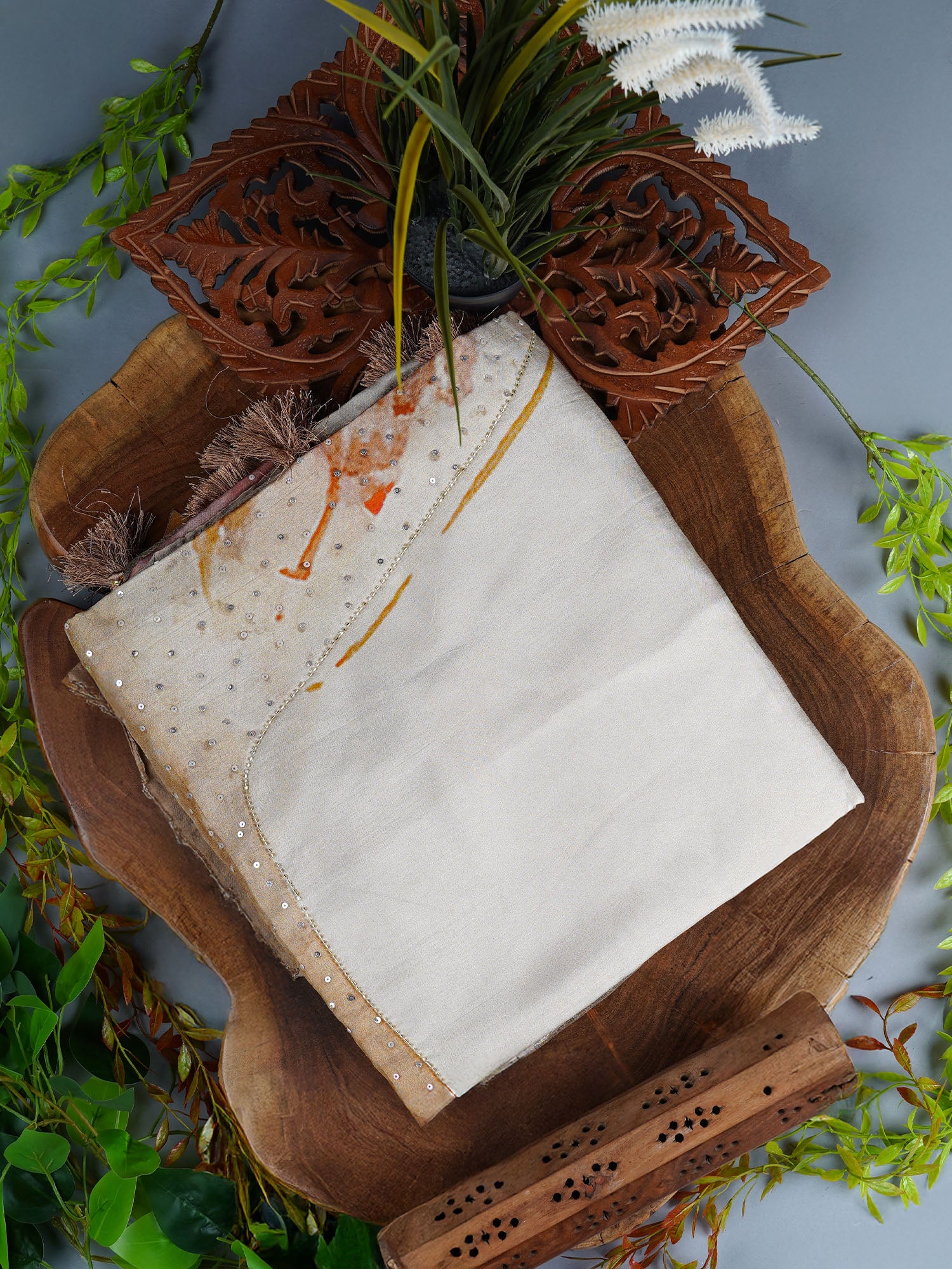 Chinon Saree with Floral Print Kardana Work Banaras Border - Beige
