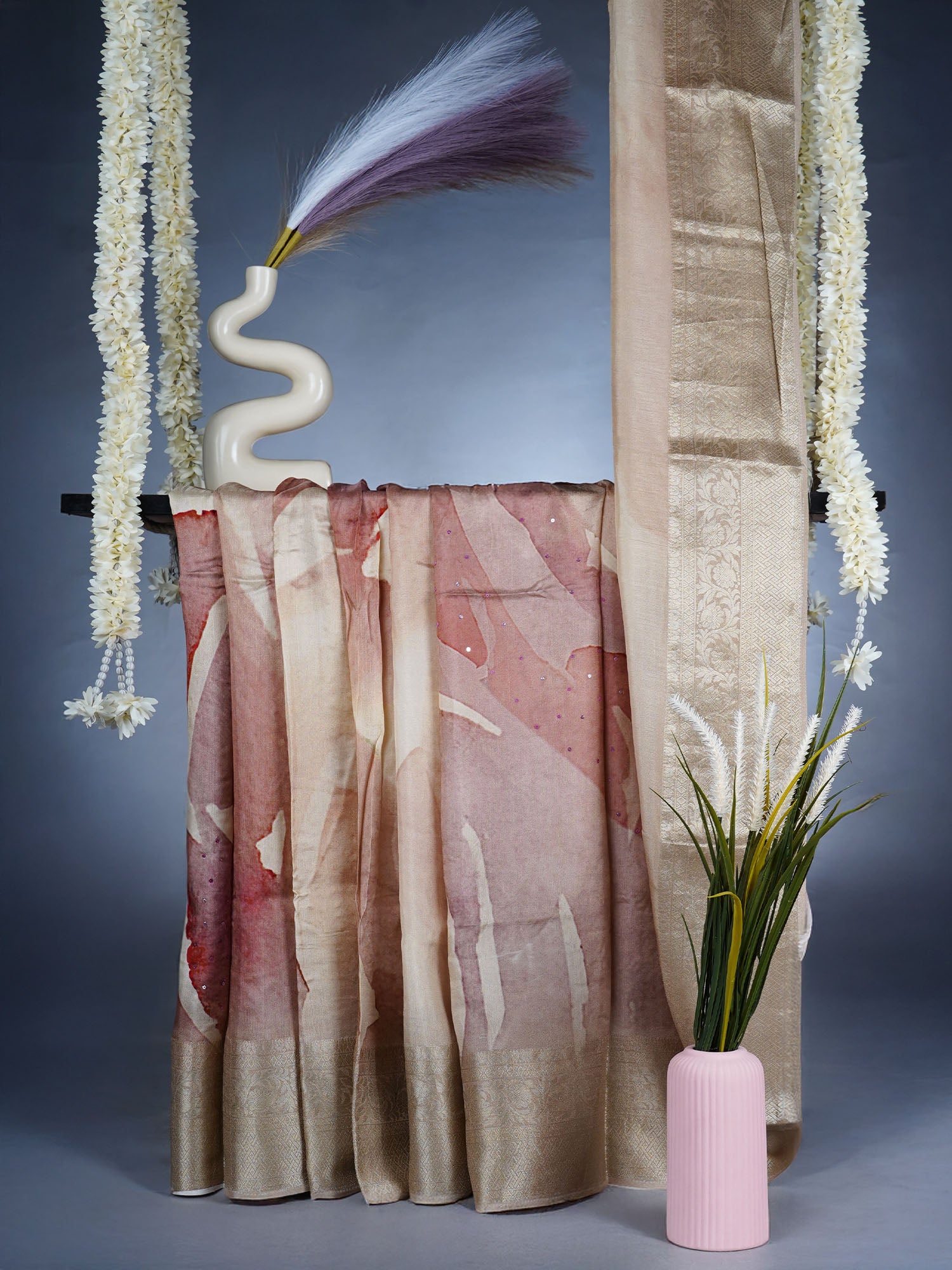 Drape yourself in timeless elegance with this stunning Chinon saree, where delicate floral prints dance across lightweight fabric. The intricate...
