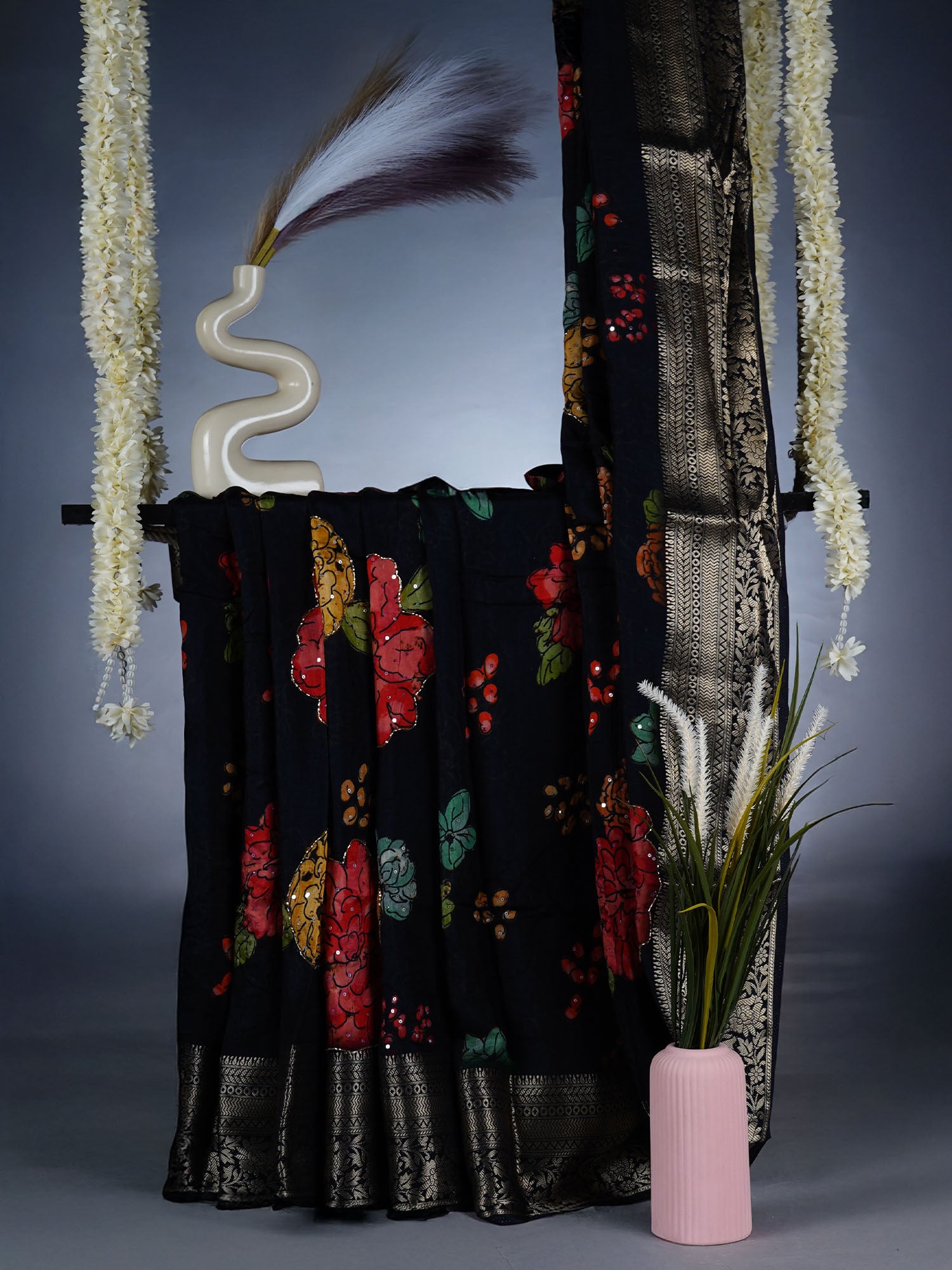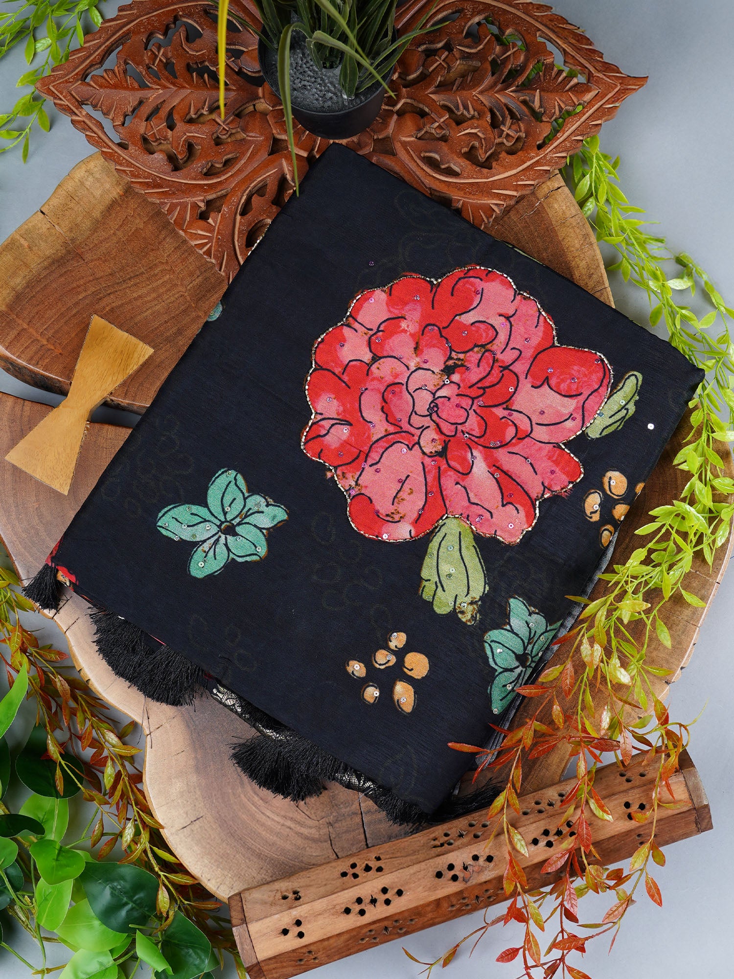 Chinon Silk Saree with floral print & sequins Embellishanents - Black