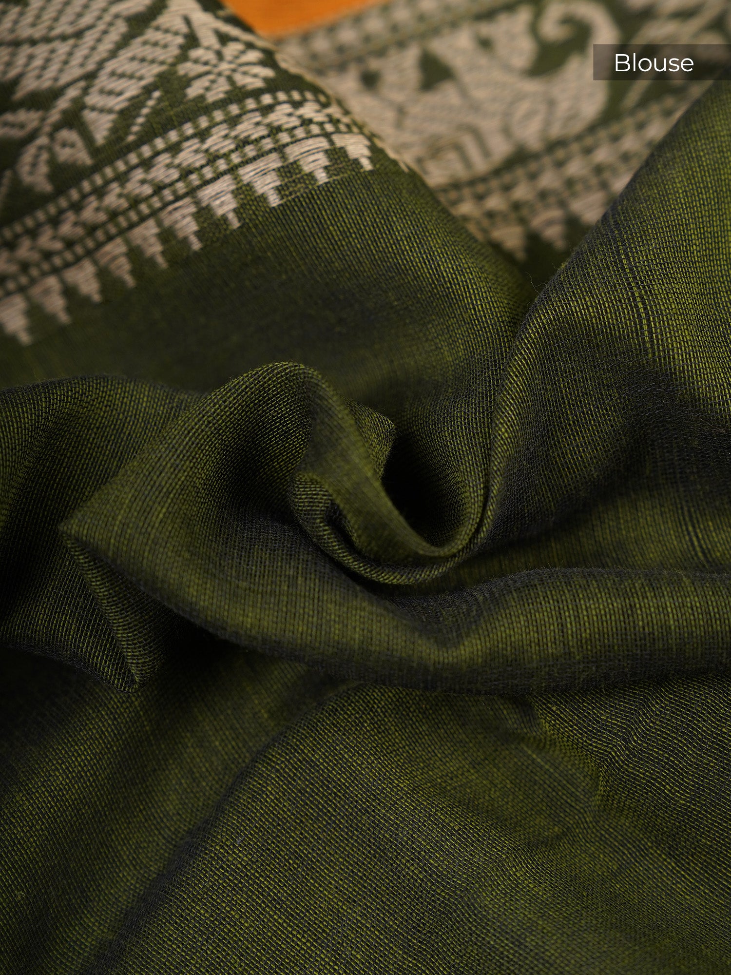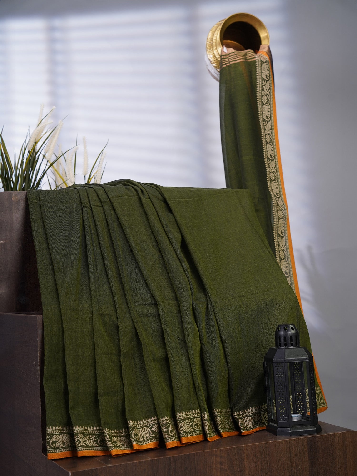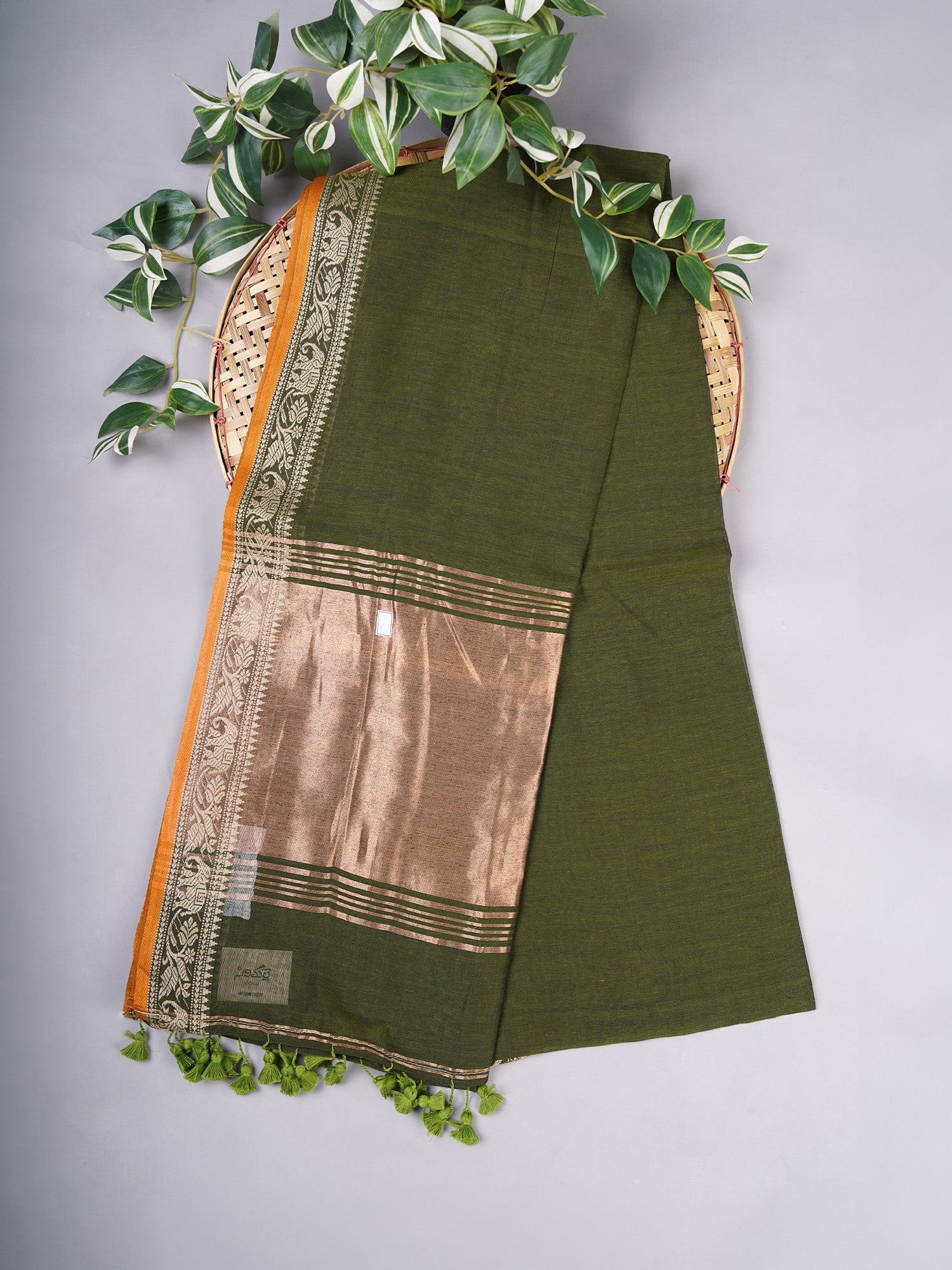 This Cotton Antique Gold Zari Border in Green combines traditional craftsmanship with elegant design. The rich green cotton fabric provides...