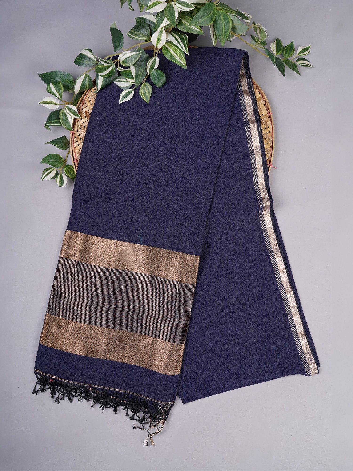 Cotton Antique Gold Zari Border - Navy Blue