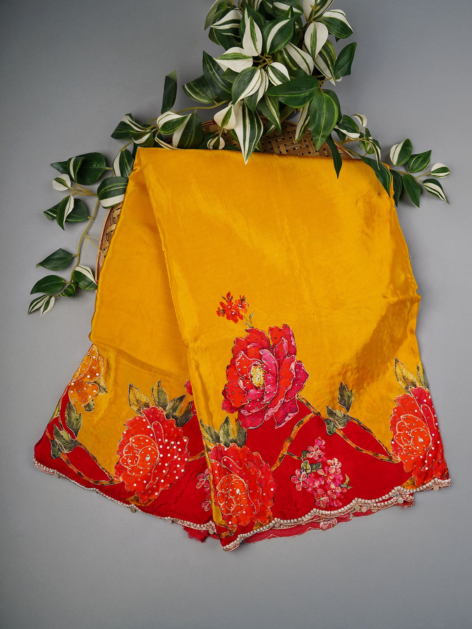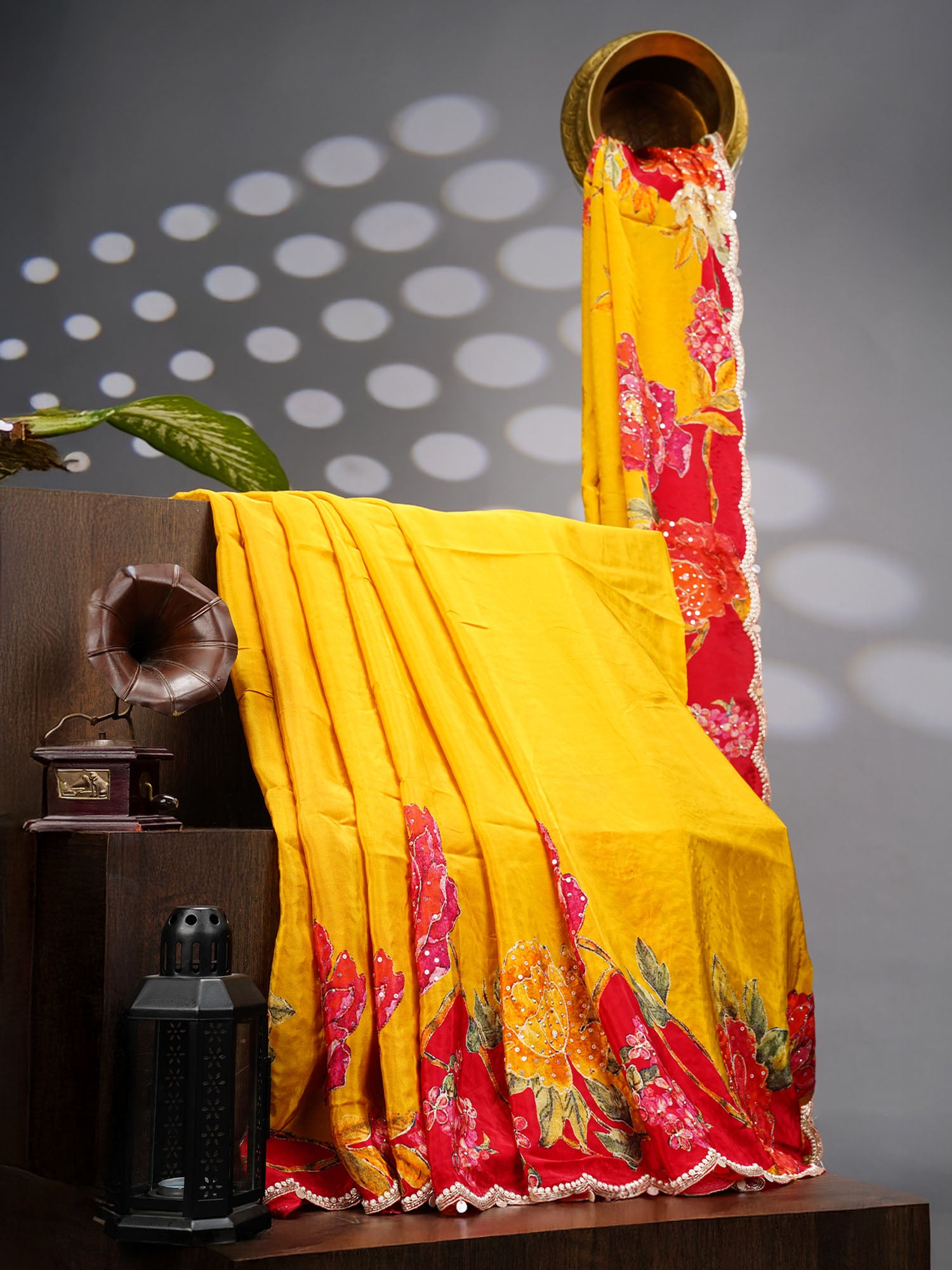 Crepe Crepe Saree With Floral Print Scallop Border Kardana Zardosi Sequence Work - Yellow