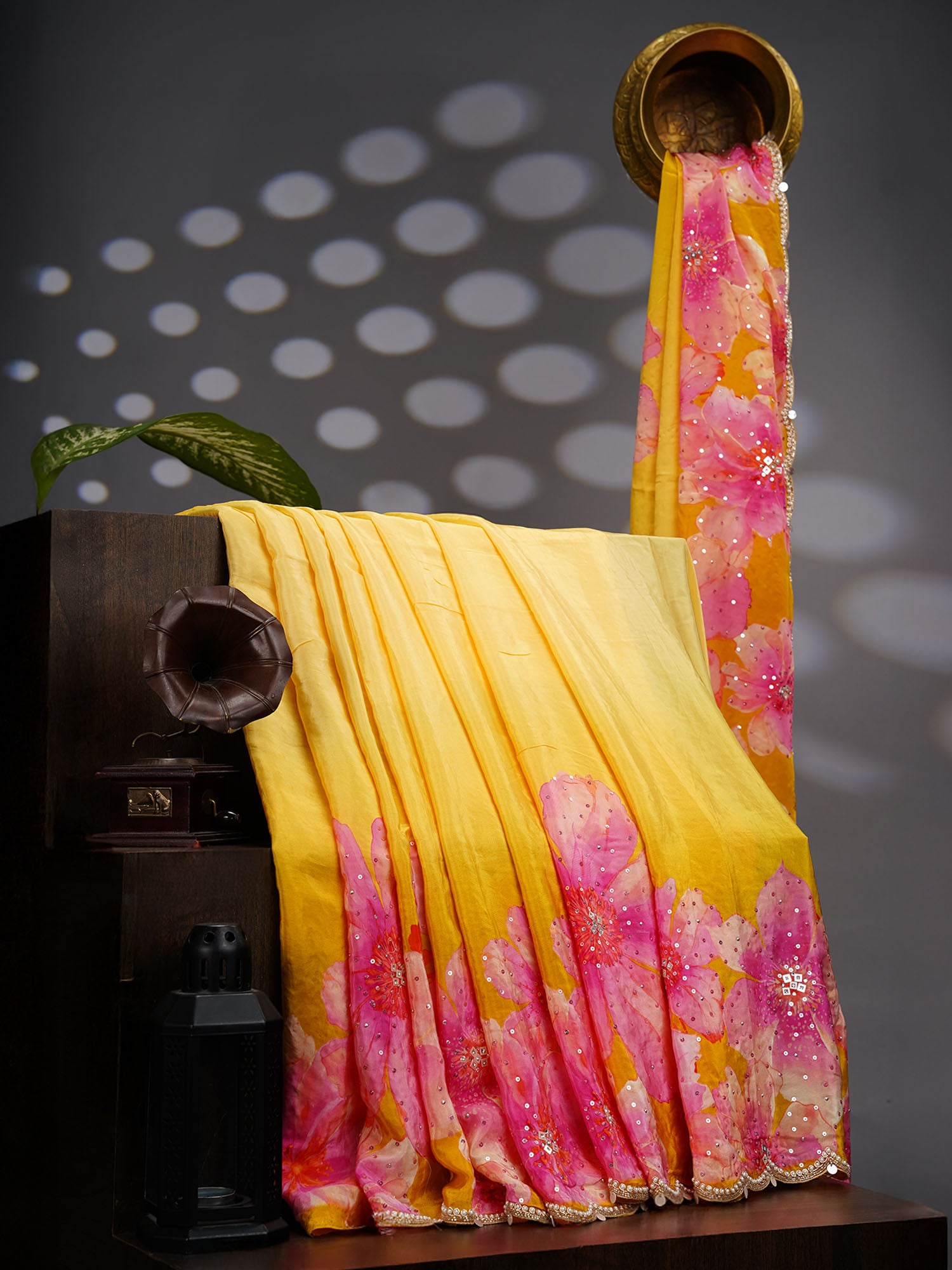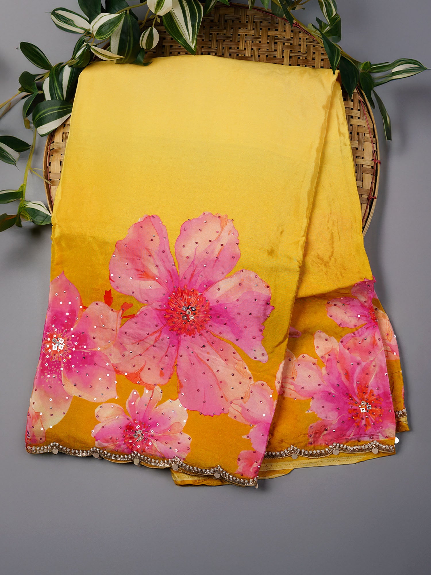 Crepe Saree With Floral Print Scallop Border Kardana Sequence Work - L Yellow