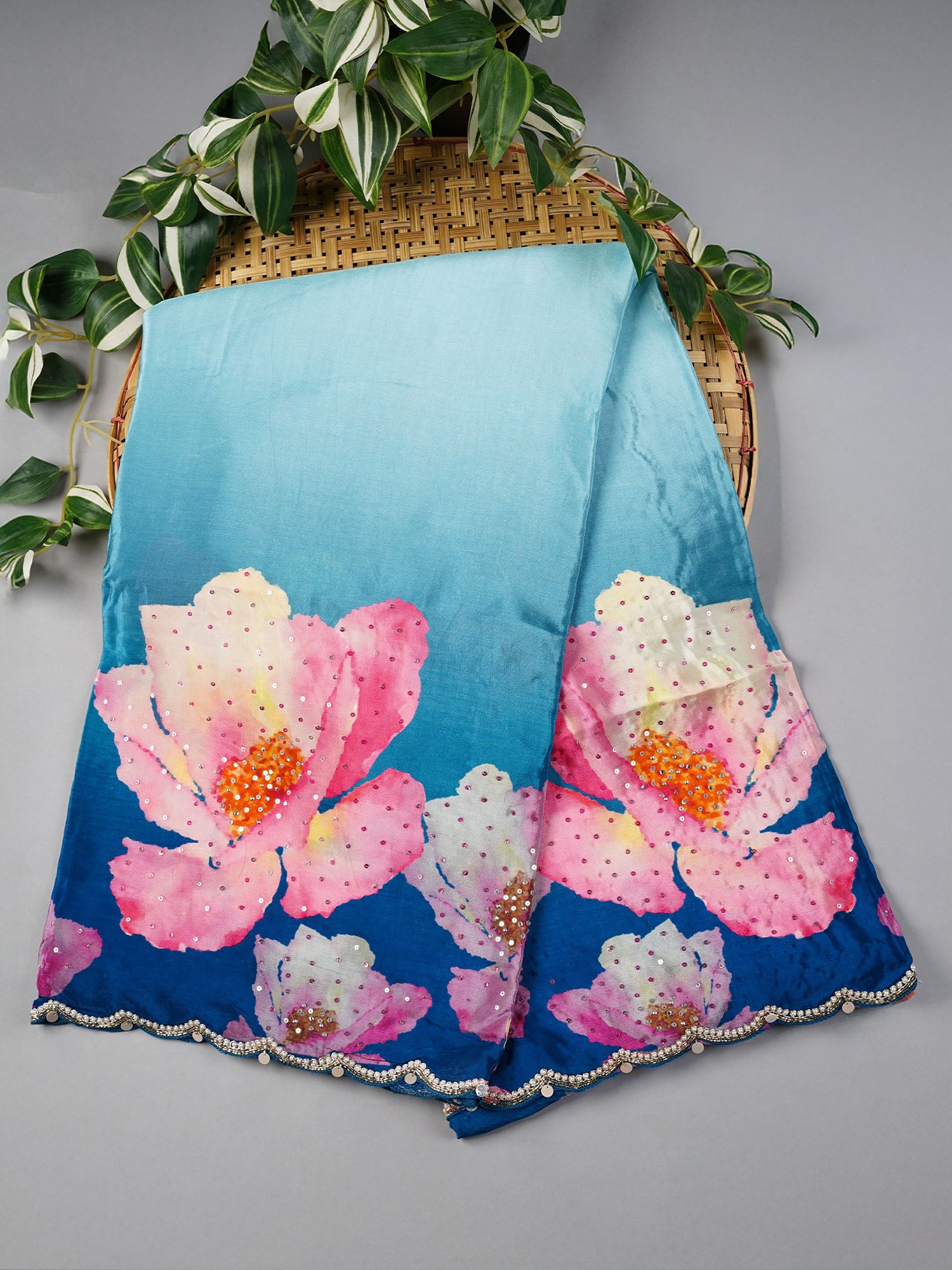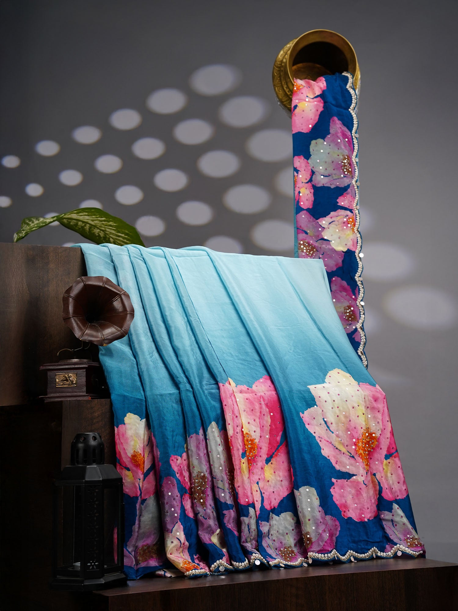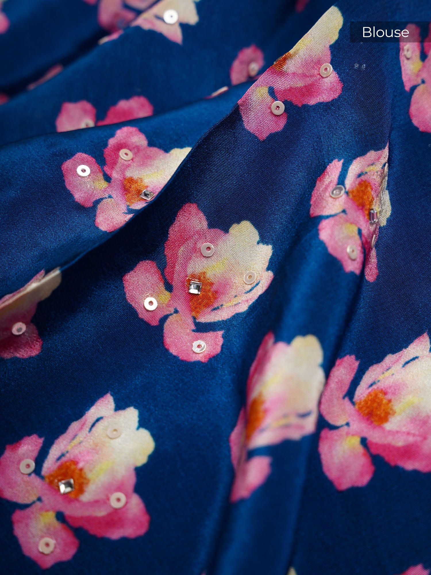Step into sophistication with this stunning peacock blue crepe saree that's an absolute showstopper! Graceful floral prints bloom across the fabric while the elegant scallop border adds refined charm. Intricate kardana sequence embellishments shimmer with every twirl, creating that captivating sparkle that turns heads. Ideal for weddings, festive celebrations, and moments when you want to feel utterly radiant. This saree beautifully fuses time-honored craftsmanship with contemporary allure, ensuring you're the star of any gathering. Comes with a coordinating contrast blouse. Make this treasure yours today!|