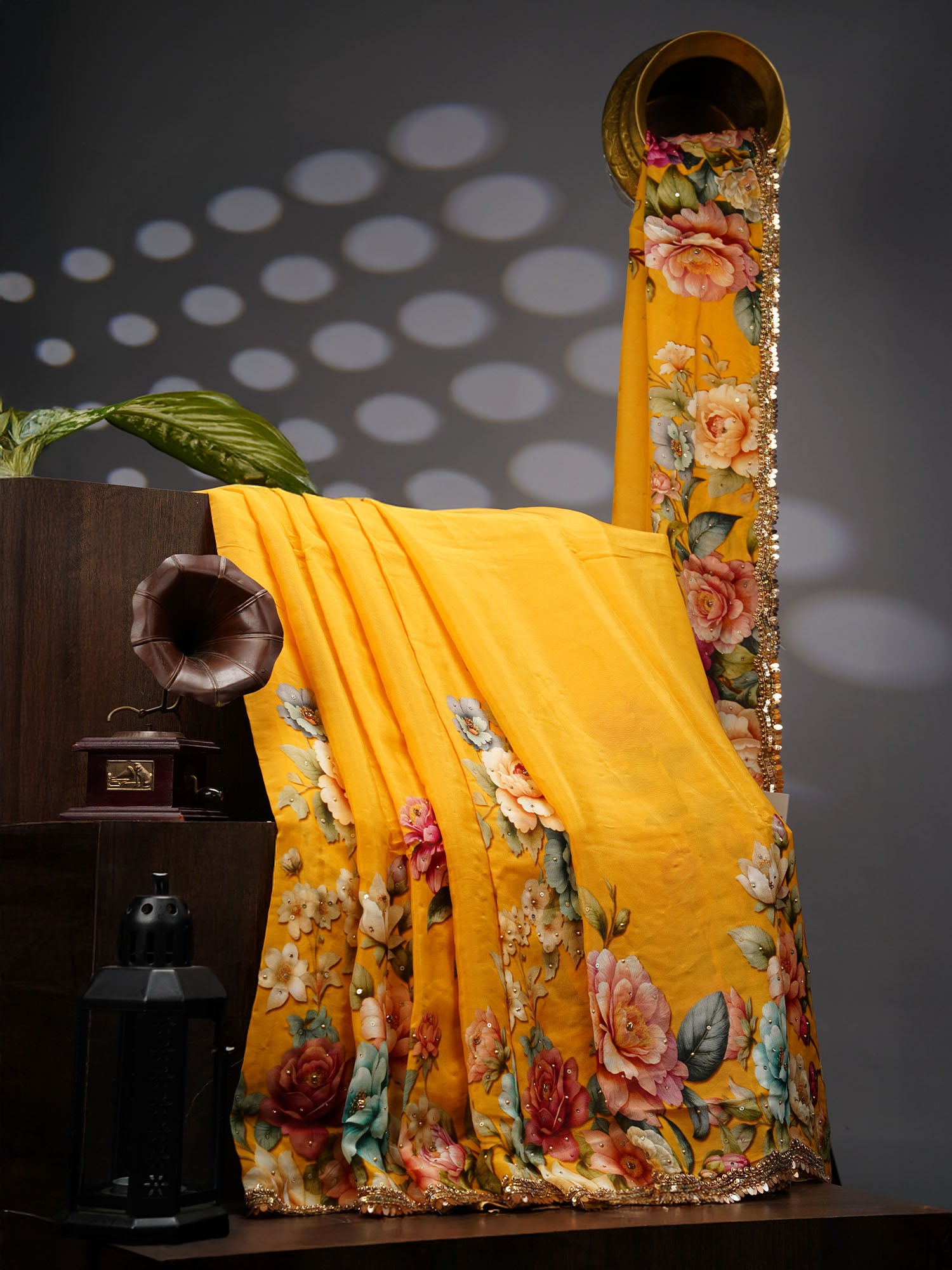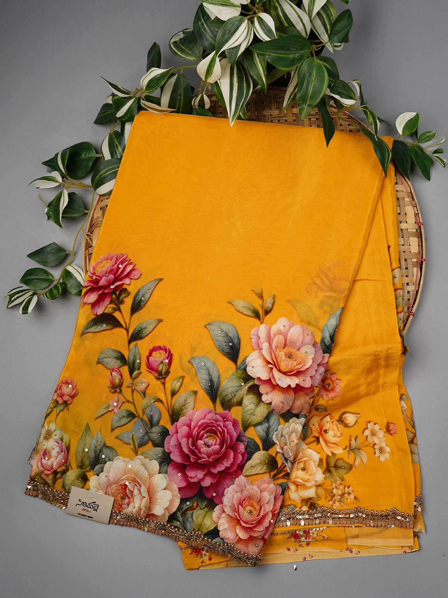 Twirl into sunshine with this cheerful yellow crepe saree that's equal parts elegant and fun! The delicate floral print dances...