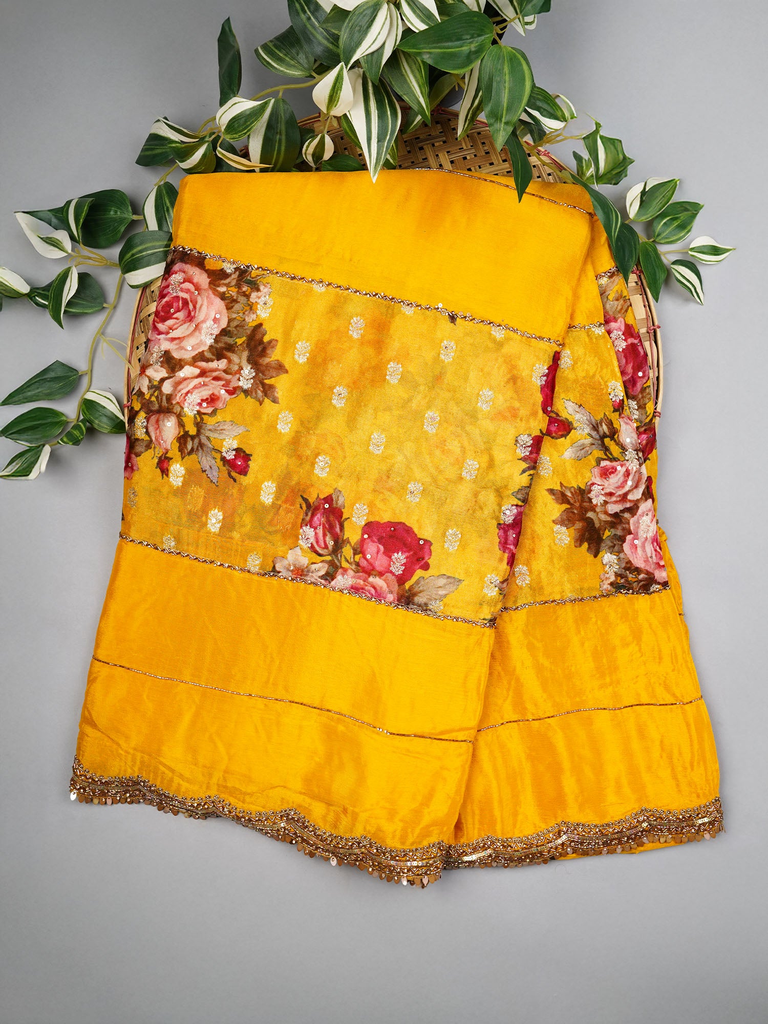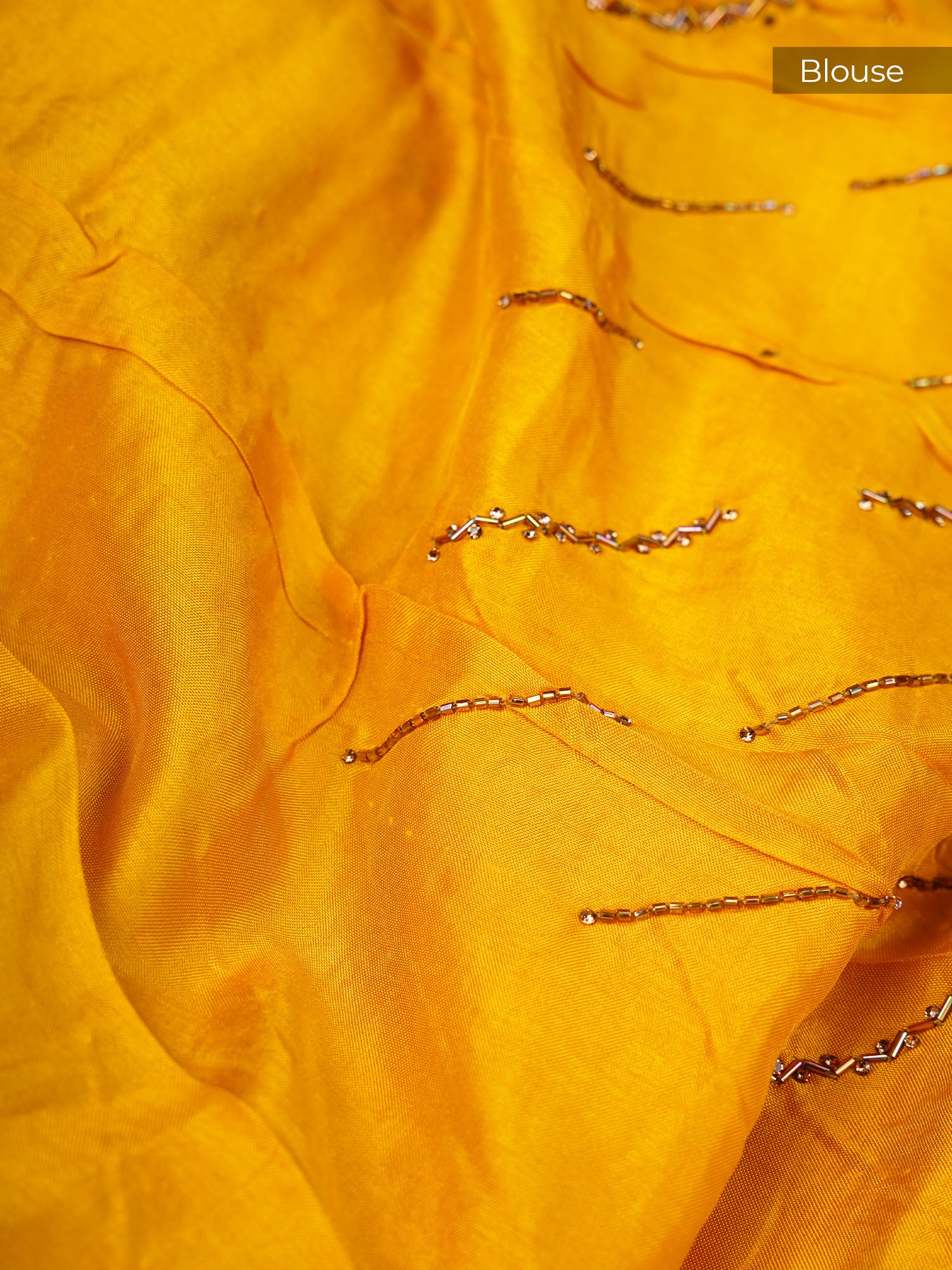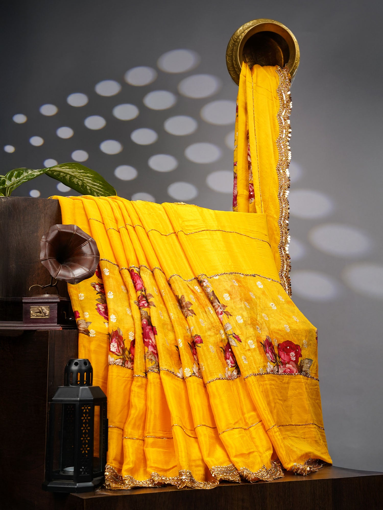 Twirl into sunshine with this stunning yellow crepe saree that's equal parts elegance and fun! The delicate floral print dances across the fabric, while the charming scallop border adds a playful edge. Intricate kardhana sequence work catches the light beautifully, creating those magical sparkly moments. Perfect for celebrations, weddings, or whenever you want to feel absolutely radiant. The crepe fabric drapes like a dream, offering comfort without compromising on style. A versatile piece that transforms any occasion into something special.