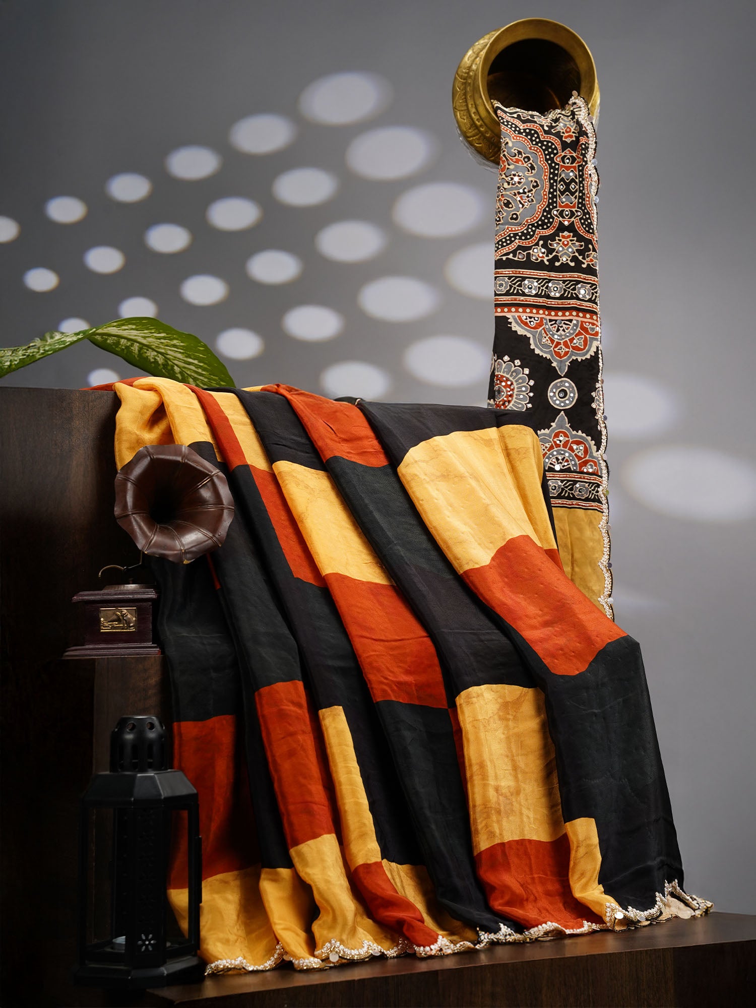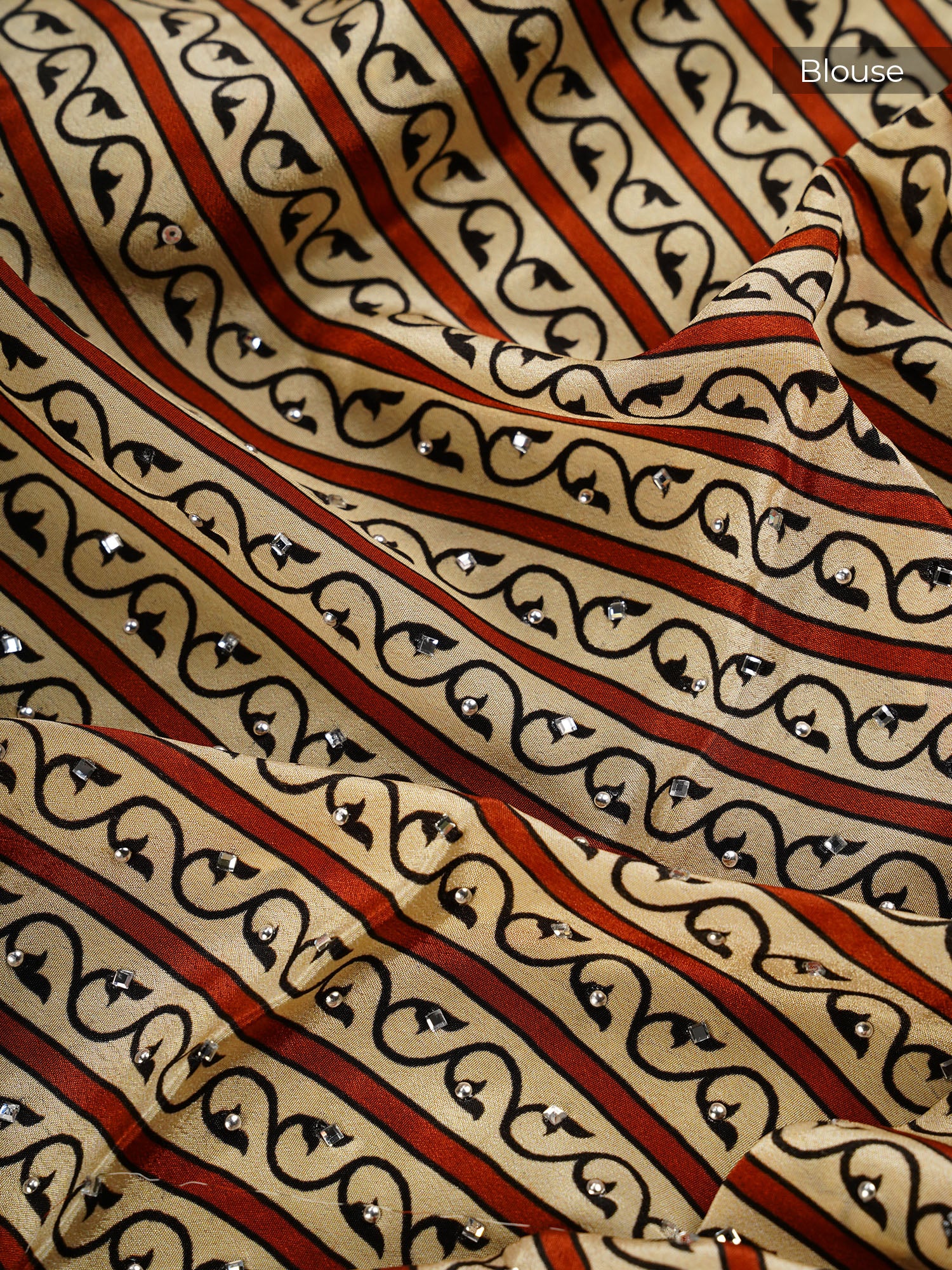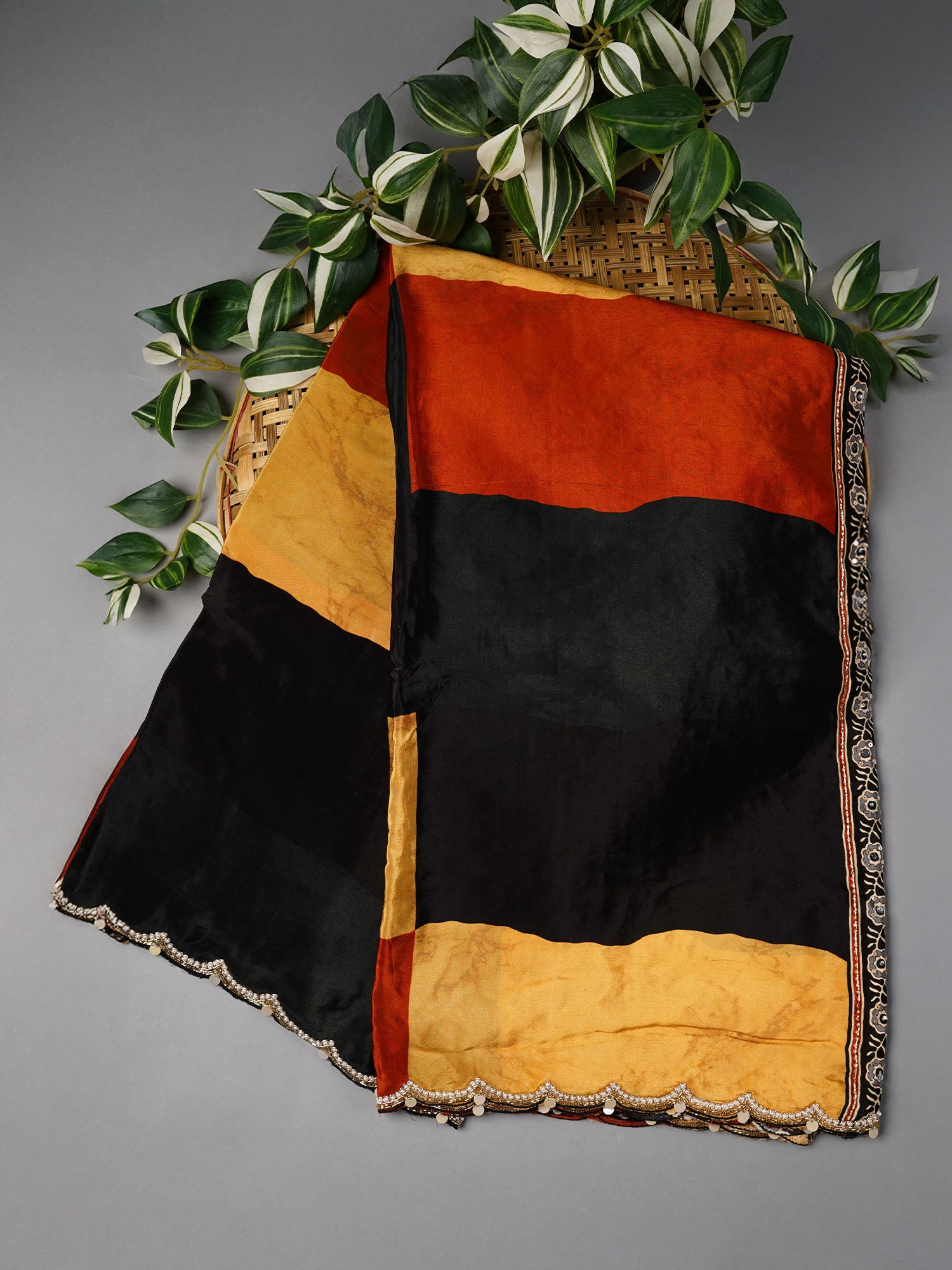 Bring vibrant energy to your wardrobe with this playful crepe saree that's bursting with color! The multi-check pattern creates a lively visual rhythm across the fabric, while the delicate scallop border frames it all with understated elegance. What really makes this piece sing is the exquisite Kardhana pearl work that adds a luxurious shimmer and catches every eye in the room. The multi-color palette means this saree works beautifully for celebrations, festivals, or any occasion where you want to make a joyful statement. Crepe's forgiving drape ensures you'll feel as confident as you look, whether you're dancing at a wedding or simply enjoying a special day out.