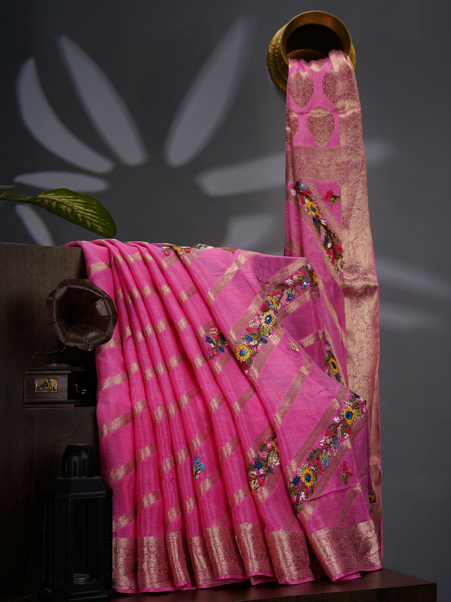 Crepe Saree with Thread Embroidery Work and Banaras Border- Pink