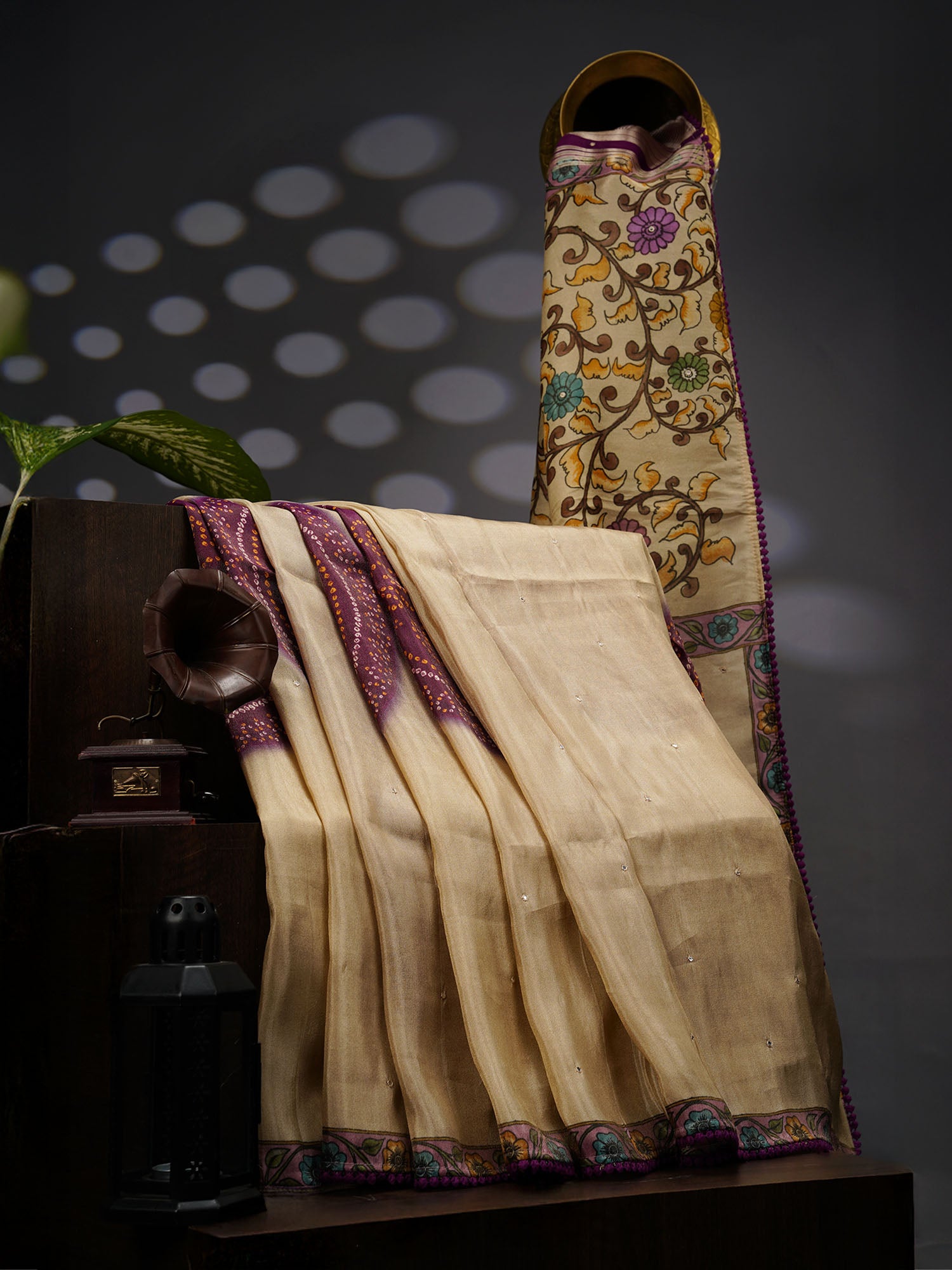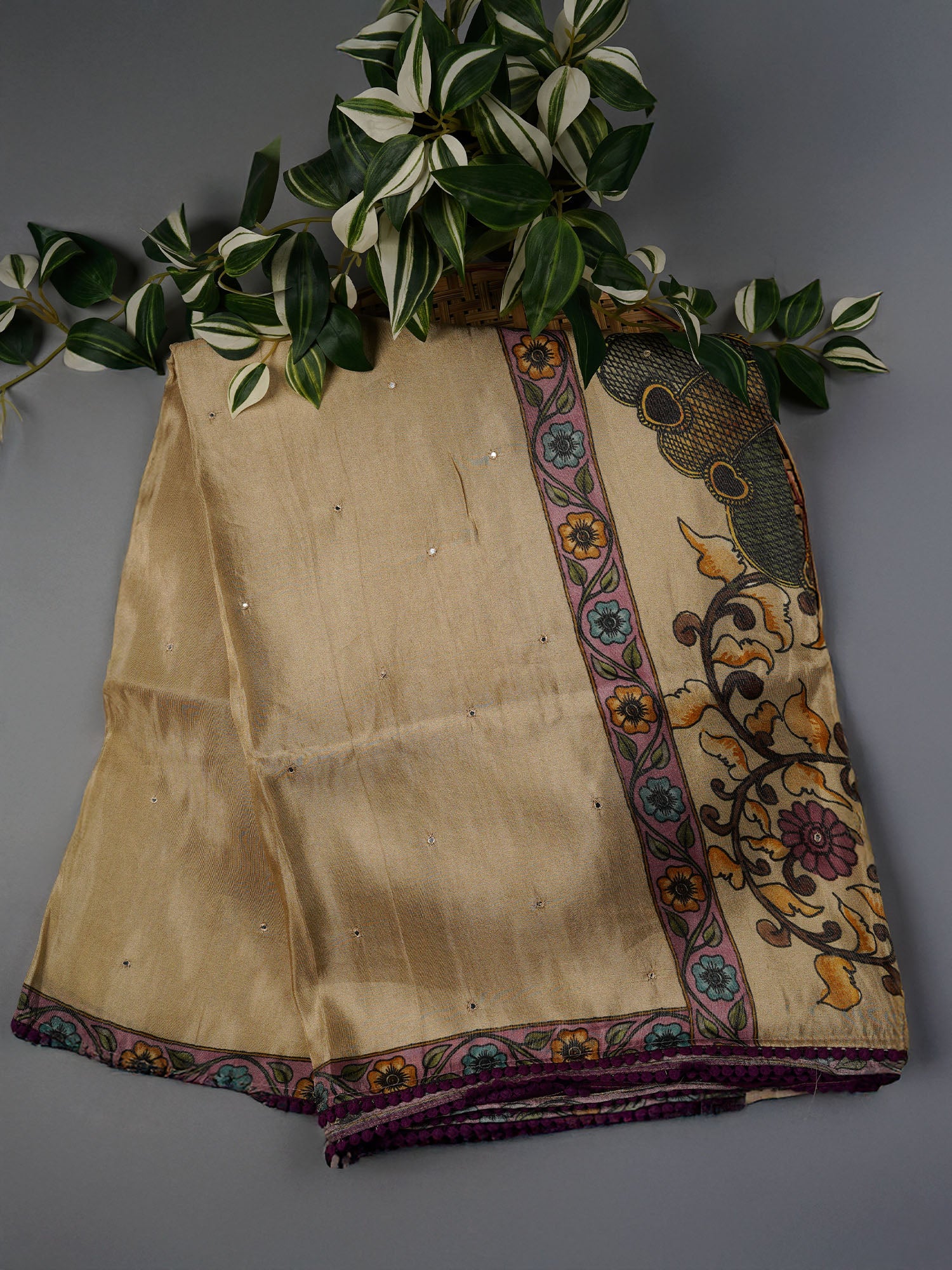 Crepe Tissue Saree With Kalamkari Pallu Mirror Work & Scallop Border - Beige