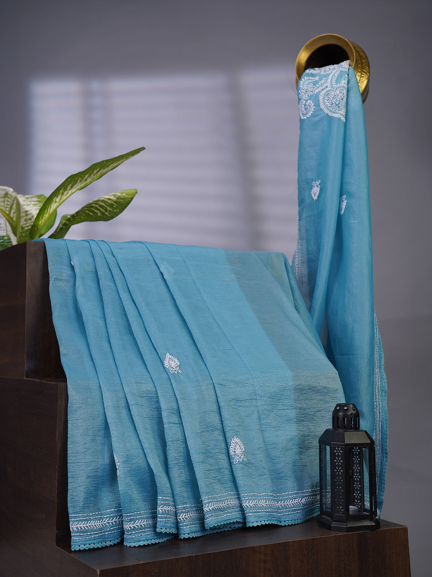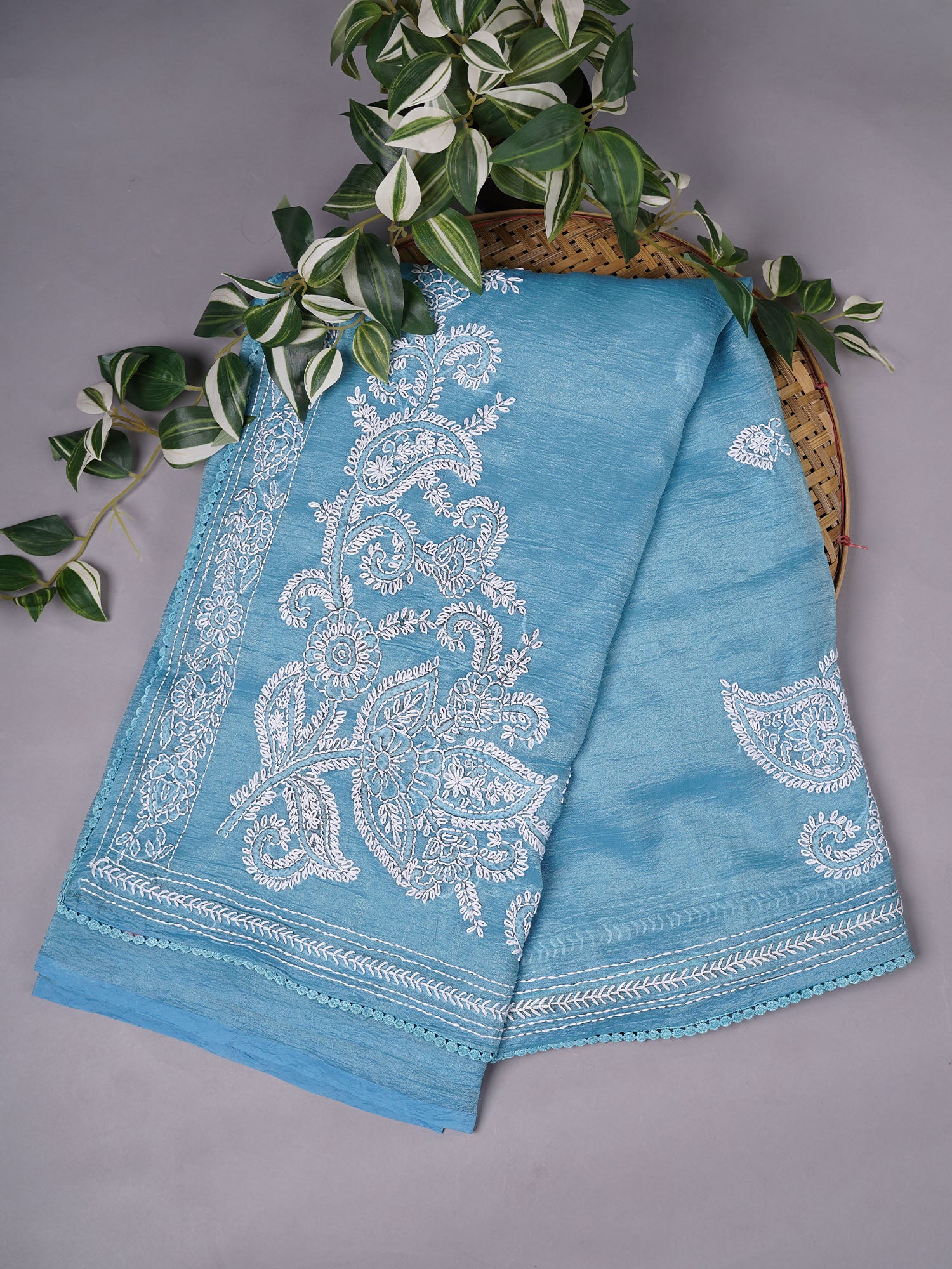 Elevate your wardrobe with this exquisite blue crush organza fabric featuring delicate Kantha embroidery and a refined lace border. The...