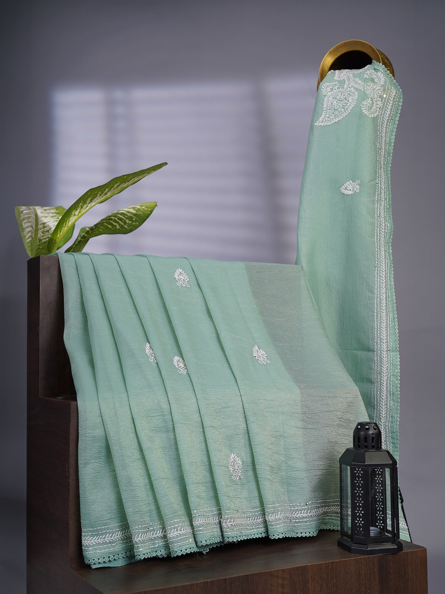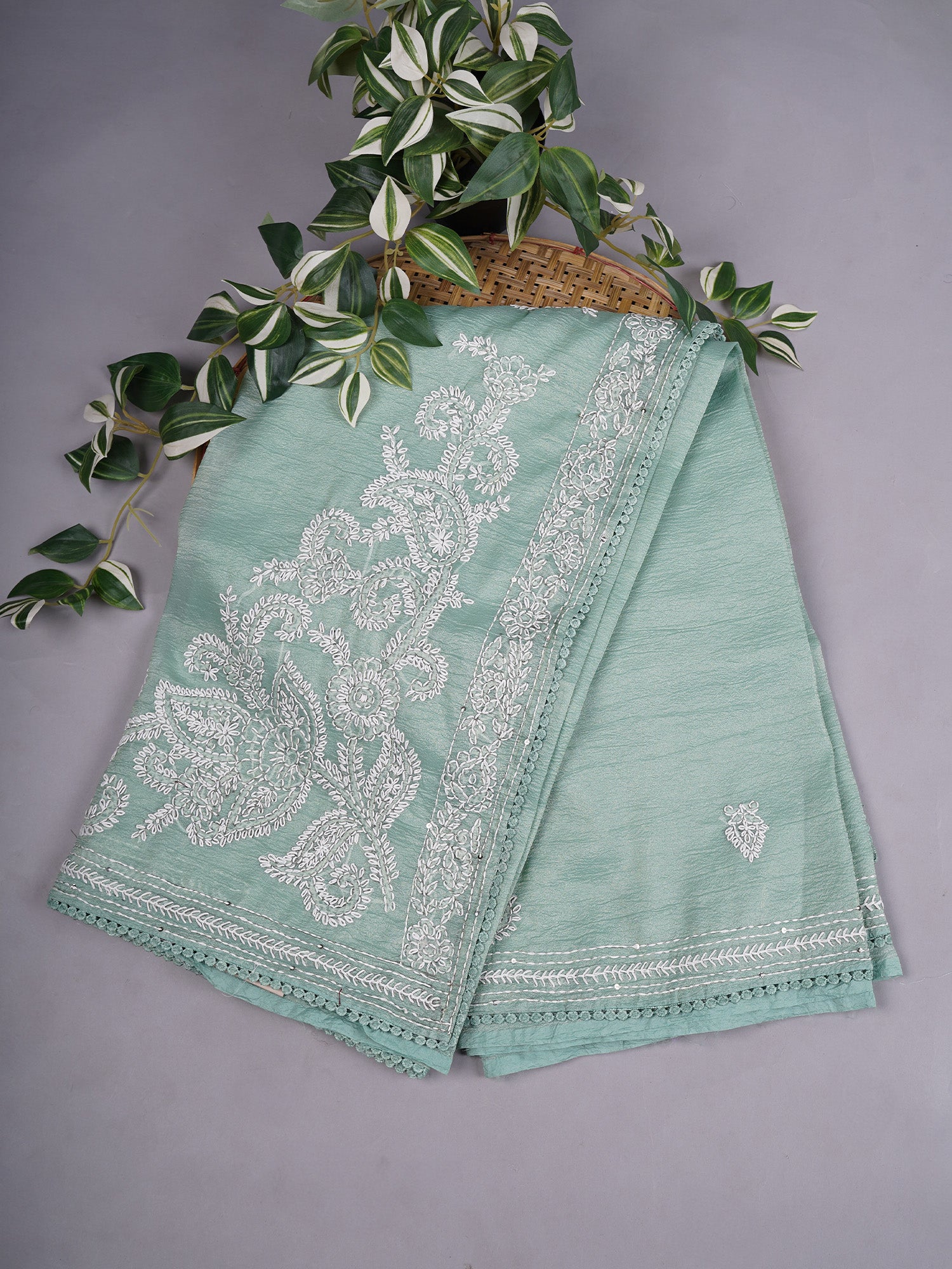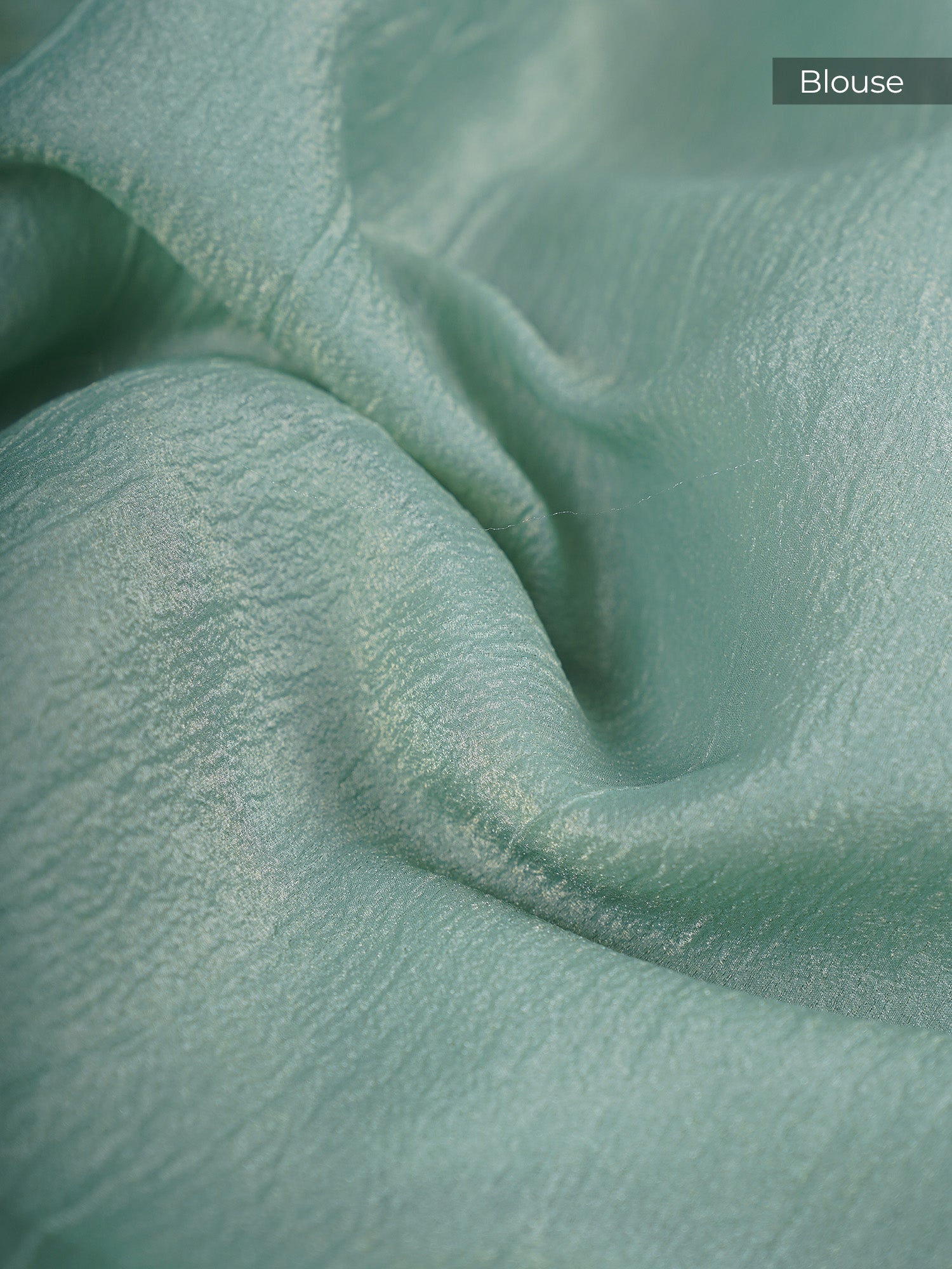 This exquisite green crush organza fabric features intricate Kantha embroidery that adds delicate texture and timeless elegance. Enhanced with a...