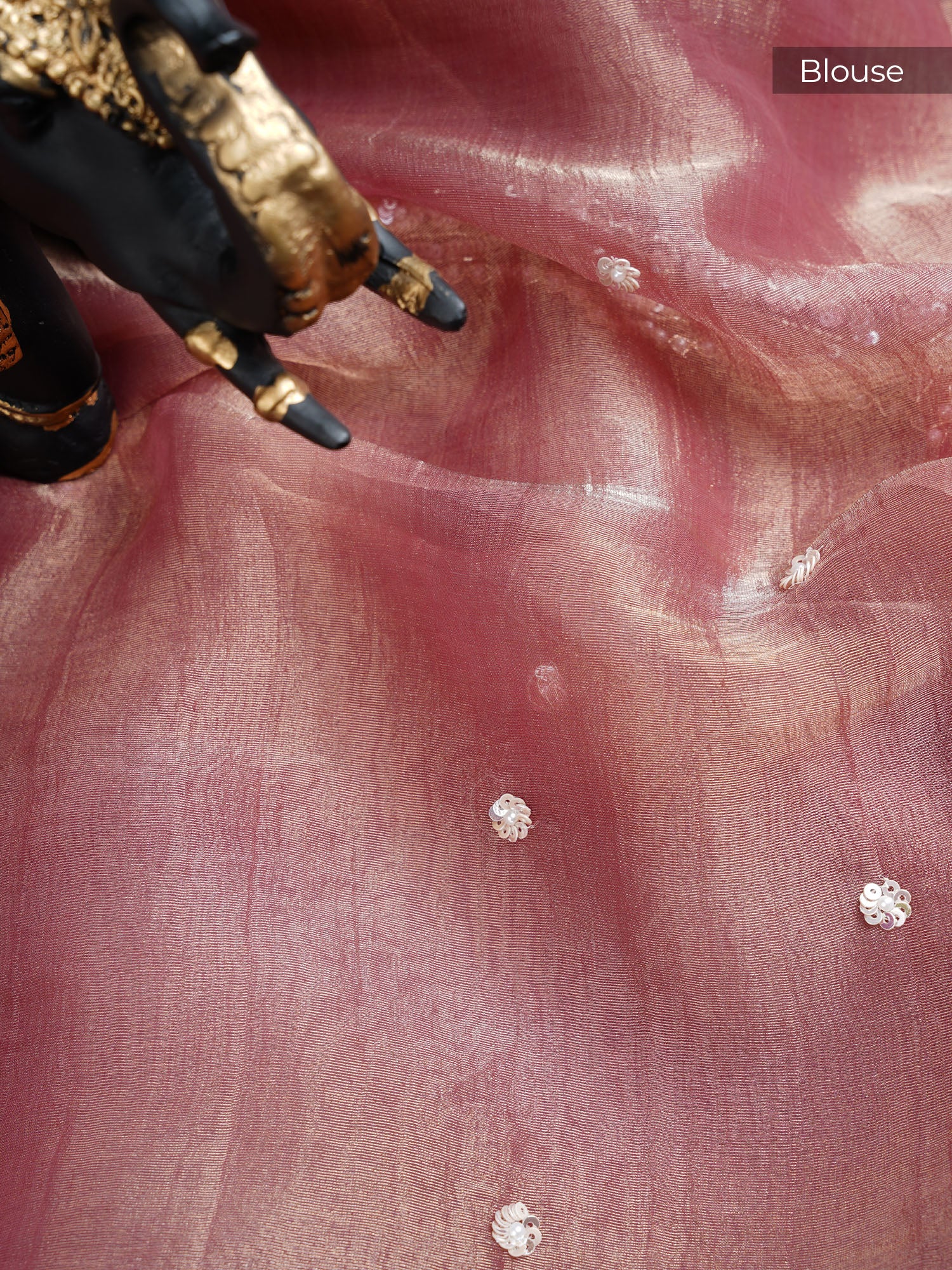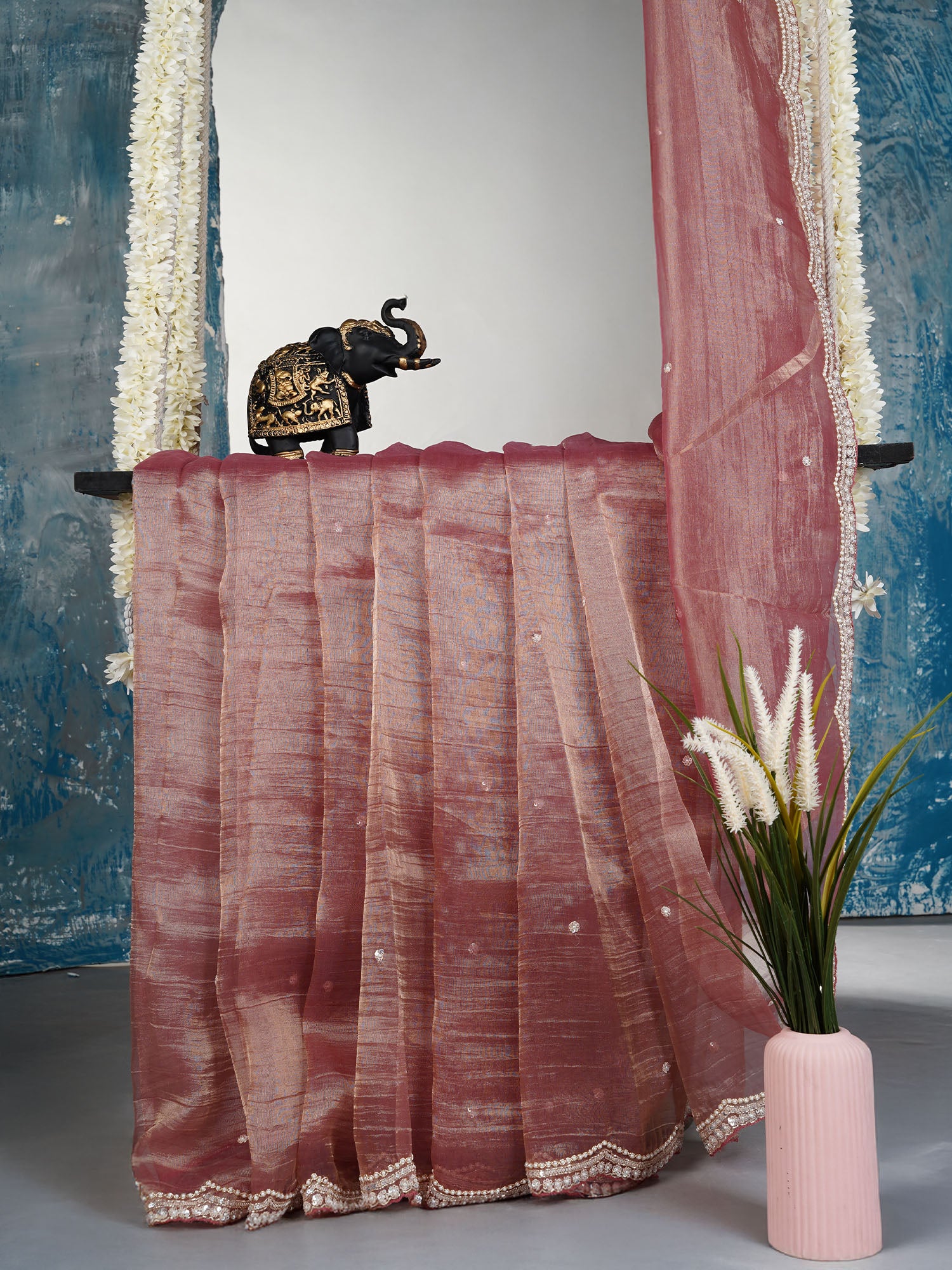 Crush tissue organza saree with sequence butties and scallop border - Maroon
