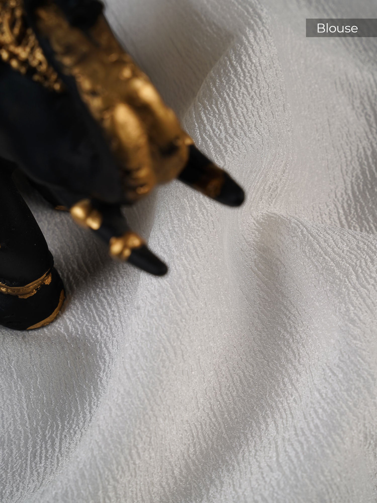 Elevate your ethnic wardrobe with this stunning crush tissue saree that's pure elegance wrapped in playful sophistication. The delicate off-white...