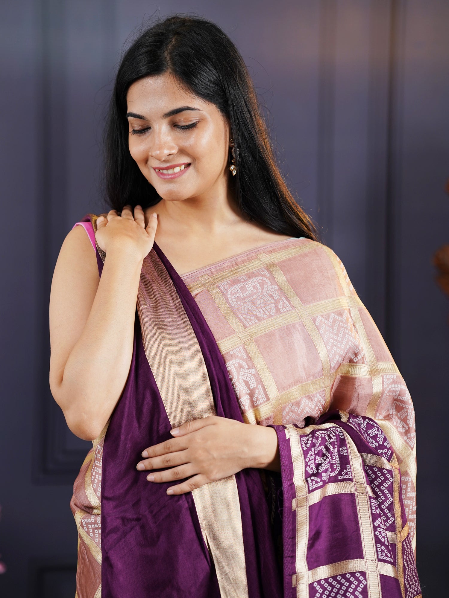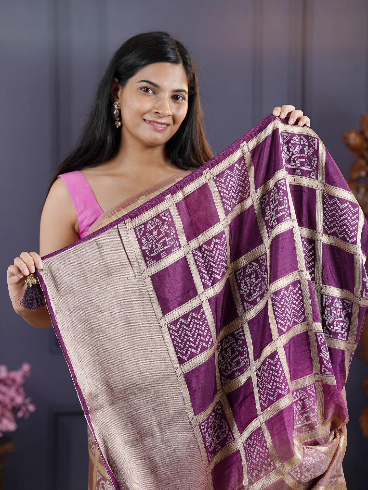This purple Dola silk saree showcases the refined artistry of Bhandni weaving, a centuries-old technique that creates intricate, organic patterns through meticulous tie-and-dye processes. Dola silk's luxurious composition delivers a graceful drape and luminous finish that elevates any formal ensemble. The regal purple tone exudes sophistication, making it particularly suited for weddings, festivals, and upscale gatherings. The Bhandni detailing adds dimensional character to the fabric surface, distinguishing this piece from conventional silks. Crafted for discerning wearers who appreciate authentic textile heritage, this saree balances traditional craftsmanship with contemporary styling versatility.
