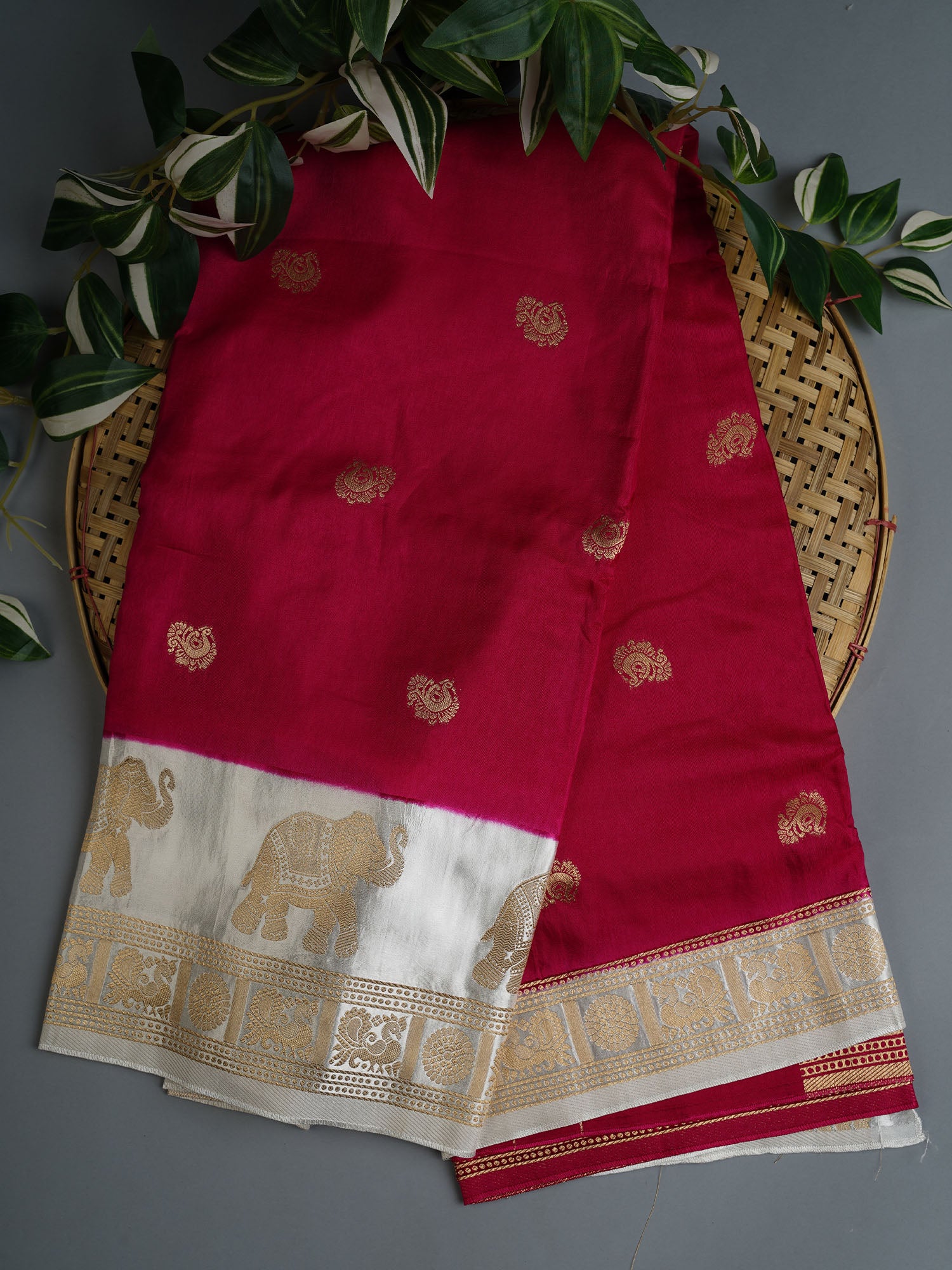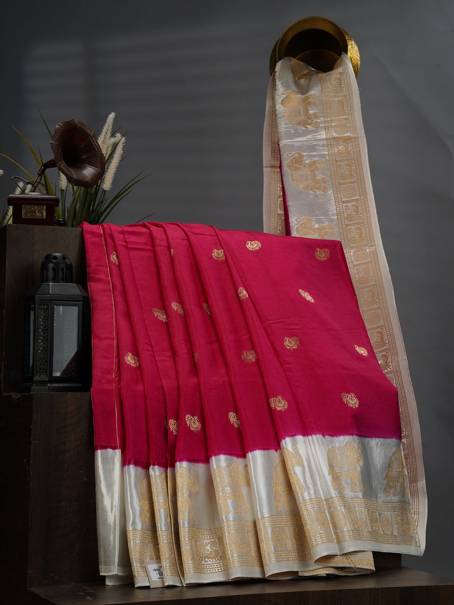 Drape yourself in pure elegance with this stunning Dola Silk Saree in soft pink! Crafted from luxurious dola silk, this saree features a crisp white border that frames the fabric beautifully, while intricate golden zari butties dance across the weave, adding a touch of sparkle and sophistication. Perfect for weddings, festivals, or special celebrations, this timeless piece combines traditional craftsmanship with a modern aesthetic. The rich pink hue paired with golden accents creates a mesmerizing look that's sure to turn heads. Embrace your inner diva and celebrate in style!