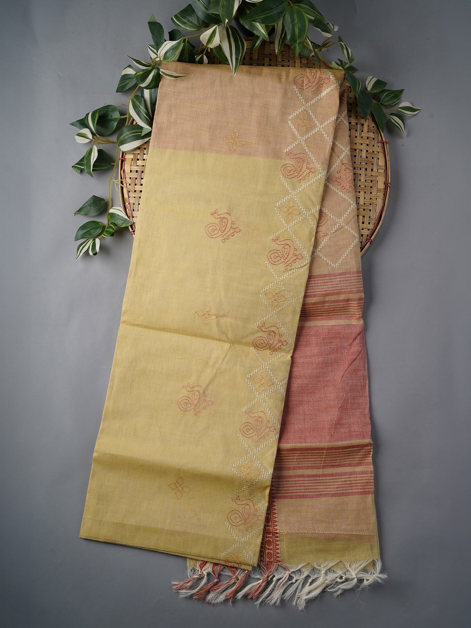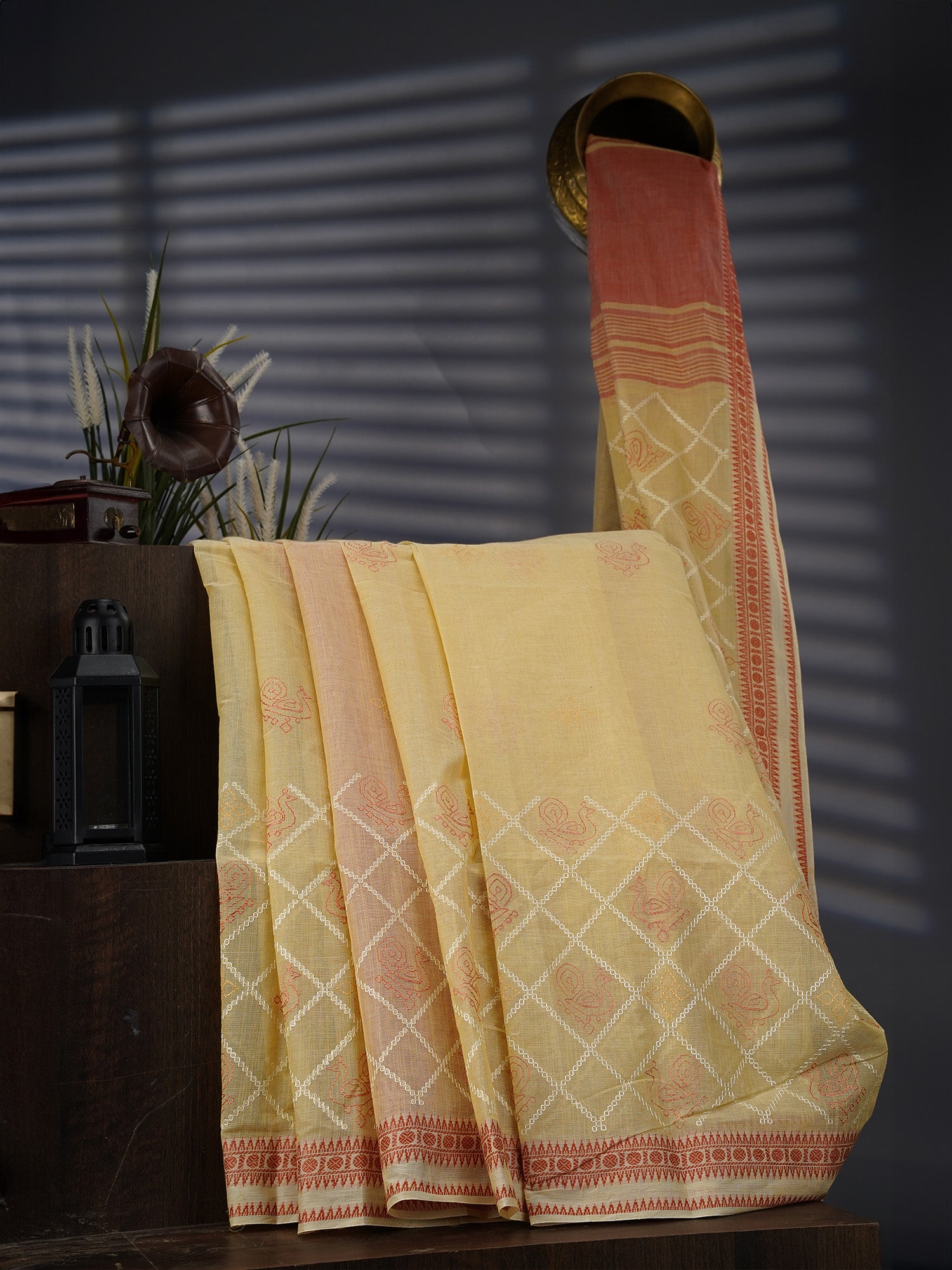 Handwoven in pure cotton, this charming saree celebrates the artistry of traditional handloom craftsmanship. The butties border features delicate thread embroidery that dances along the edges, adding texture and visual interest without overwhelming the fabric's natural elegance. The warm tan palette makes it endlessly versatile—perfect for casual gatherings, festive occasions, or everyday wear. Lightweight and breathable, it's designed for comfort through long days. A timeless piece that honors heritage while keeping you effortlessly stylish.