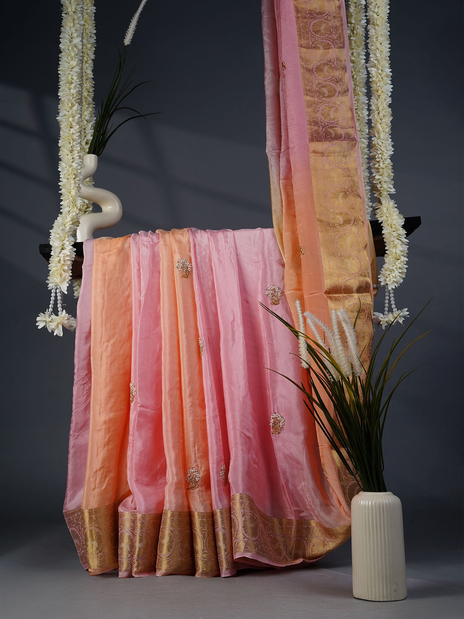 Italian Crepe Saree with Delicate Gold and White Embellishment- Pink