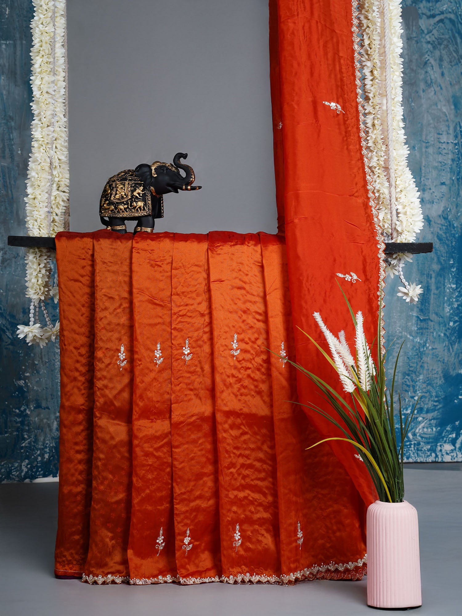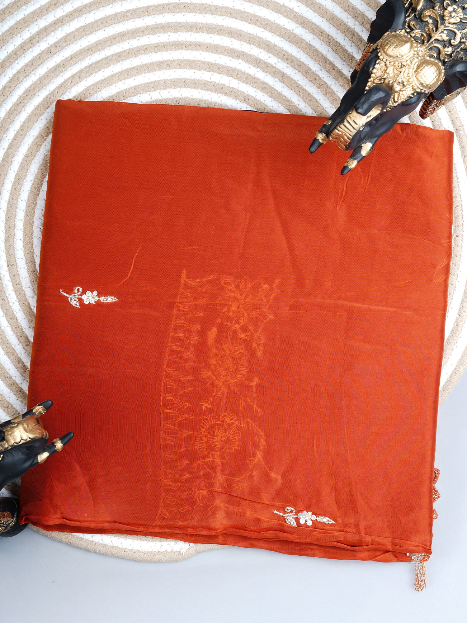 Embrace warmth and elegance with this stunning Italian Crepe saree in rich rust tones. Adorned with intricate Kardana sequencing and...