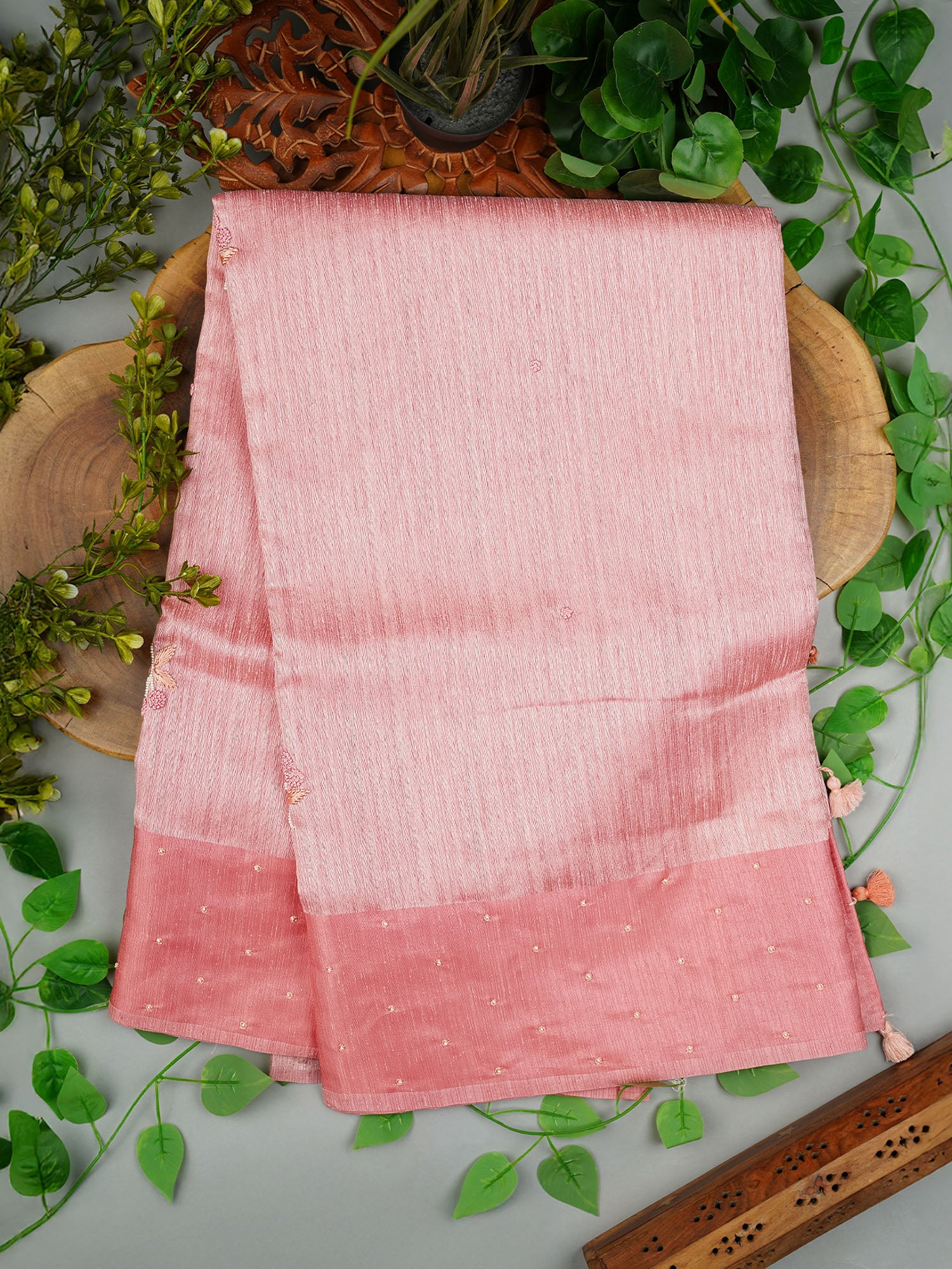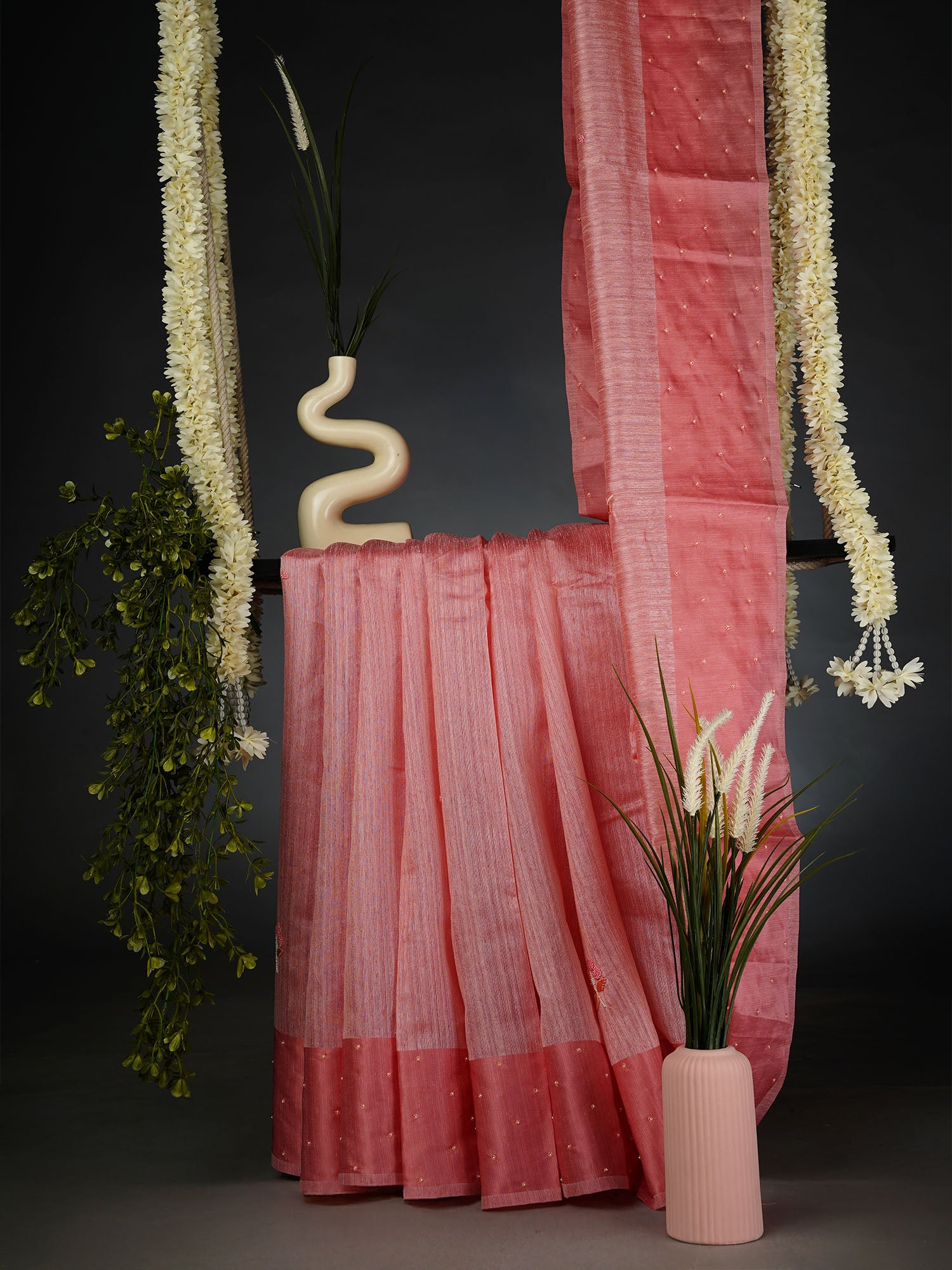 Jute Lenin Silk Saree with Satin Border and Pearl Work Butties- Pink