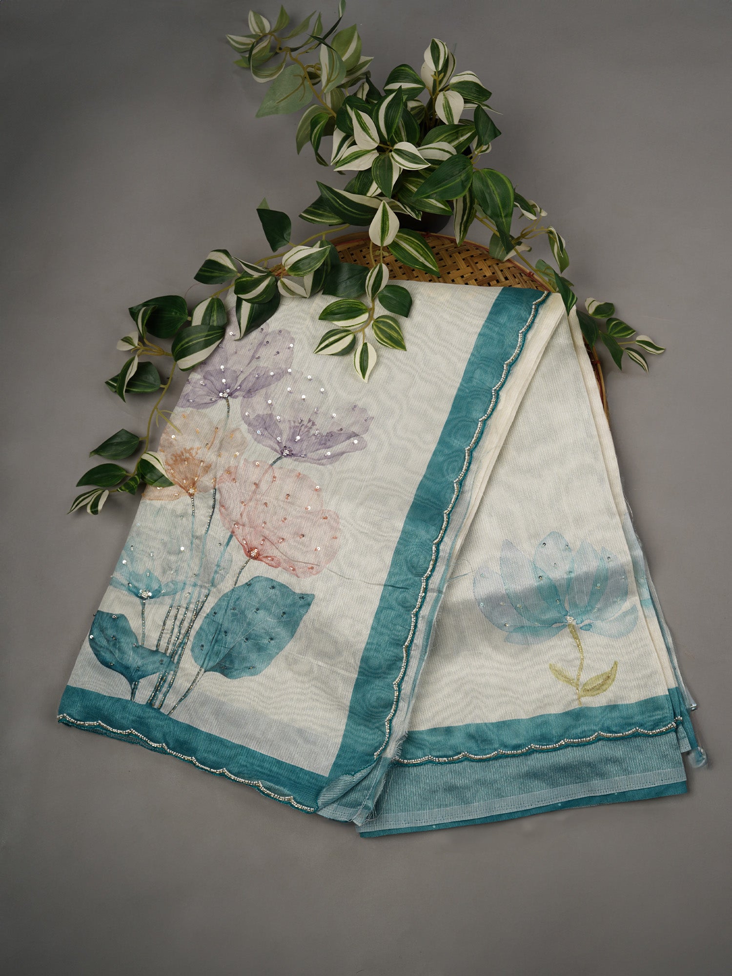 This Sea Blue jute linen tissue fabric features an intricate floral digital print, enhanced with delicate scallop borders adorned with...