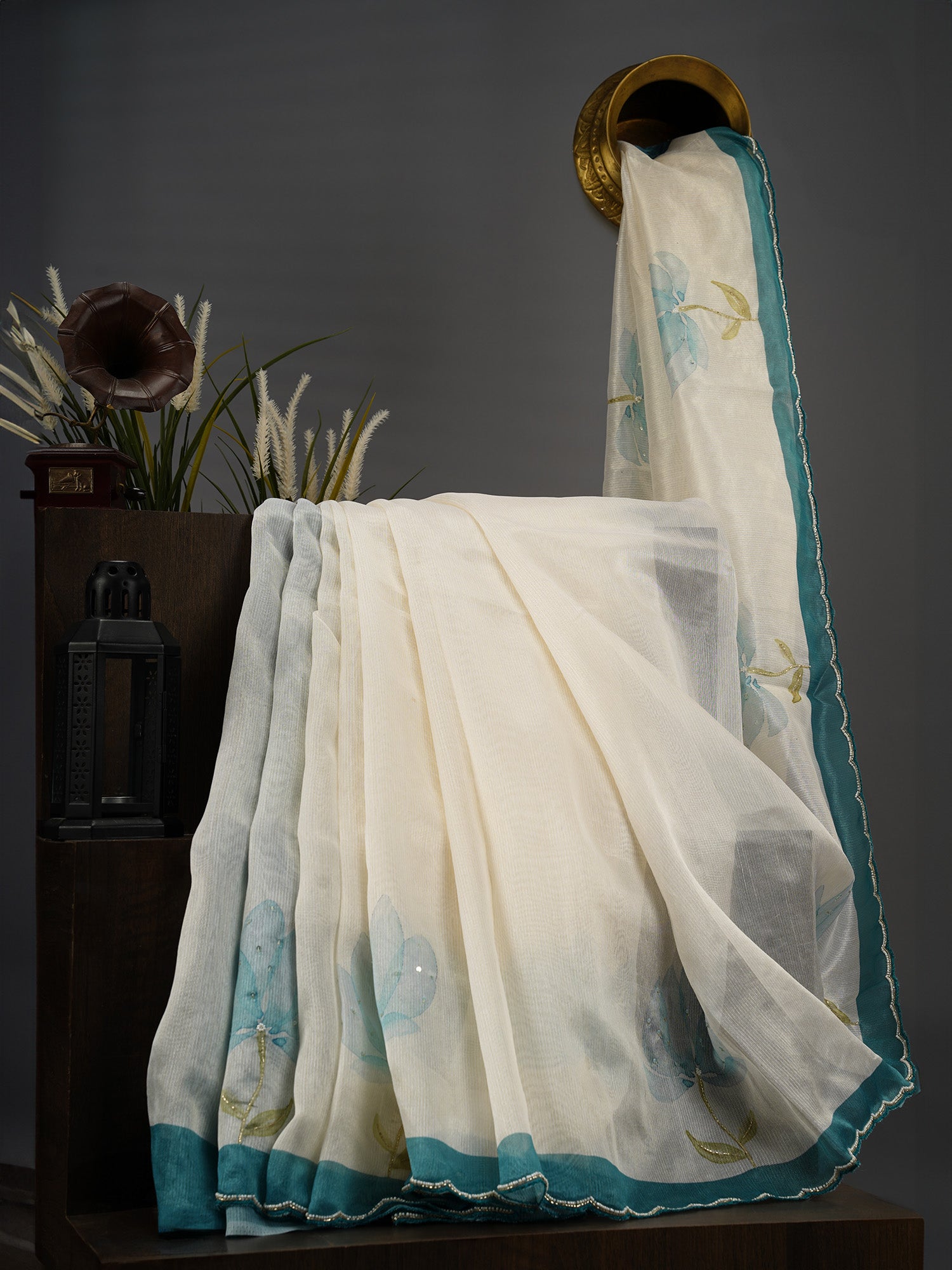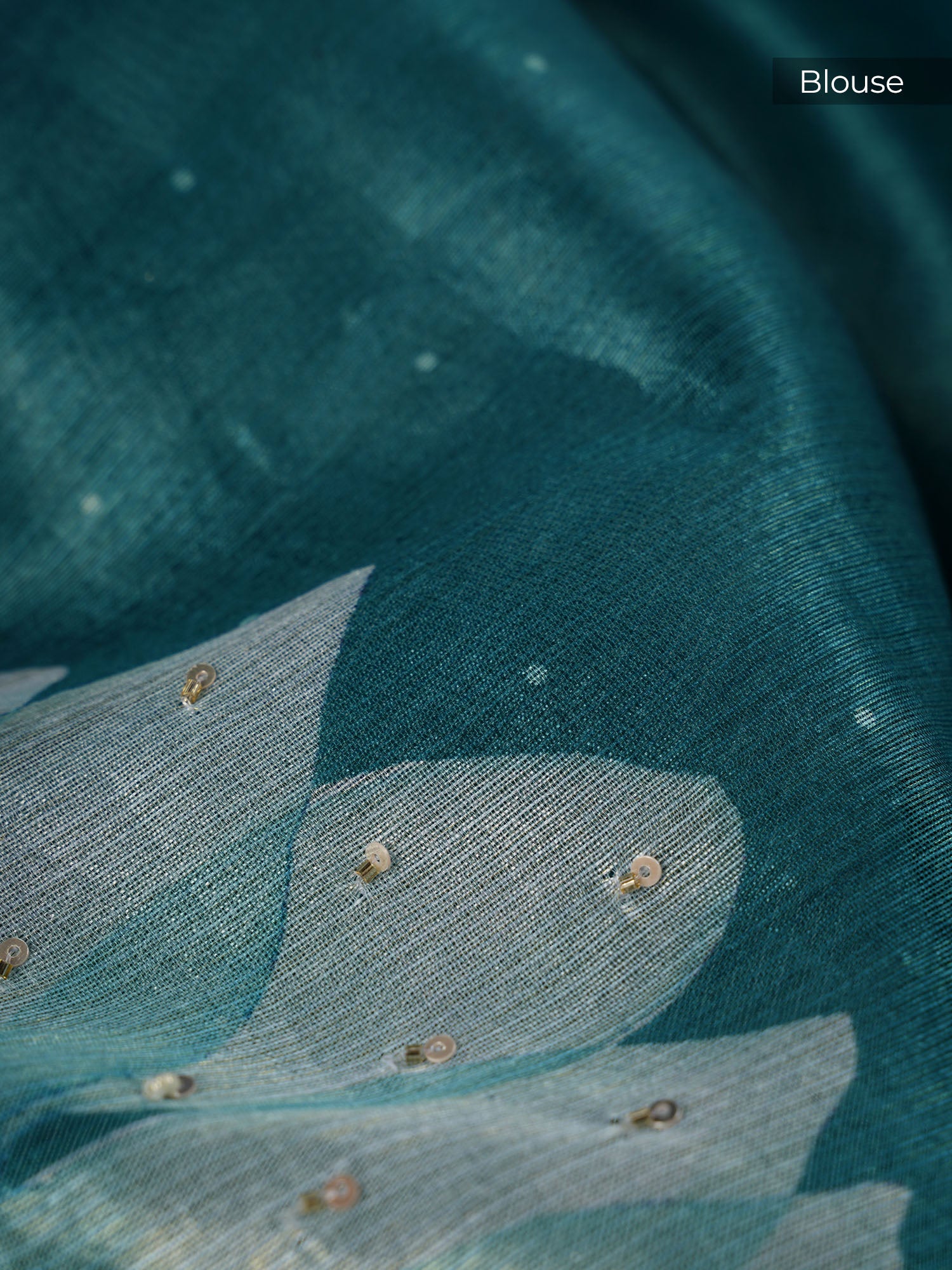 Jute Linen Tissue Floral Digital Print Scallop Border Kardana & Pearl Work - Sea Blue